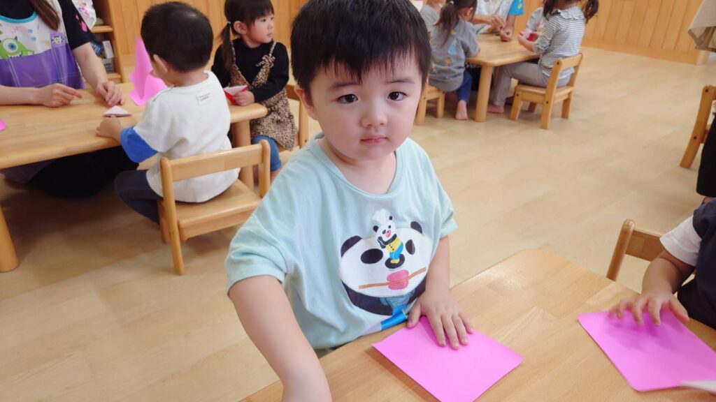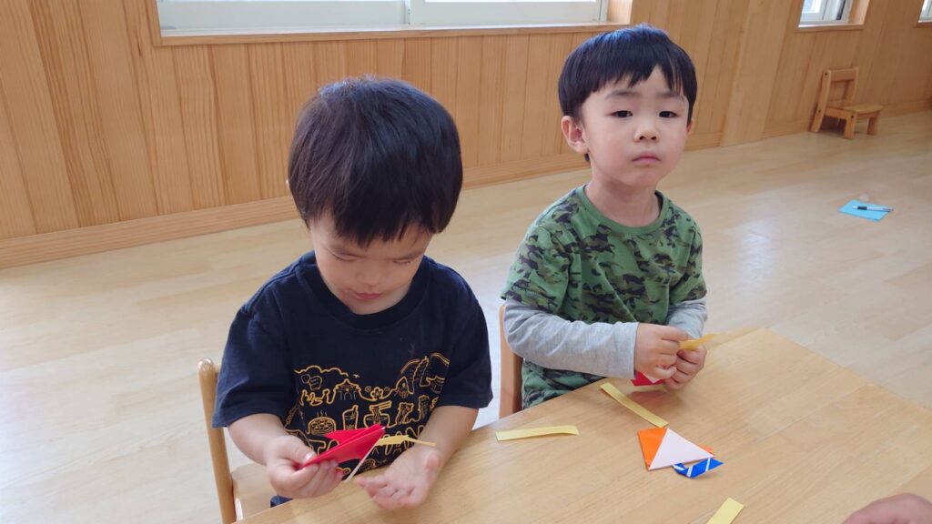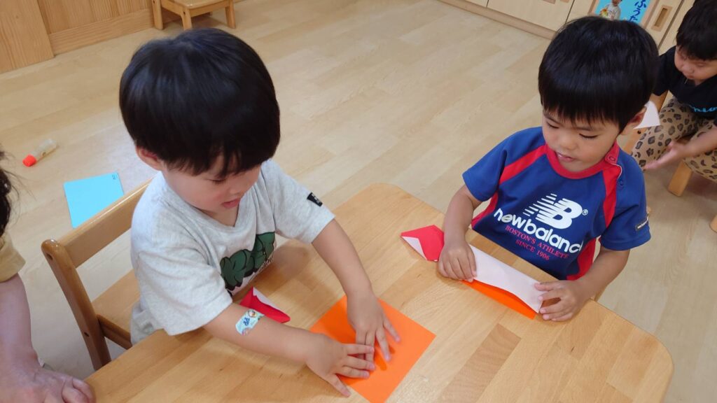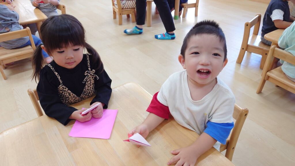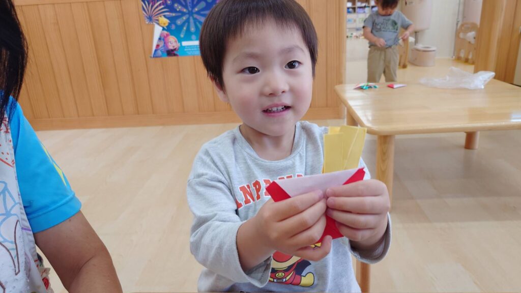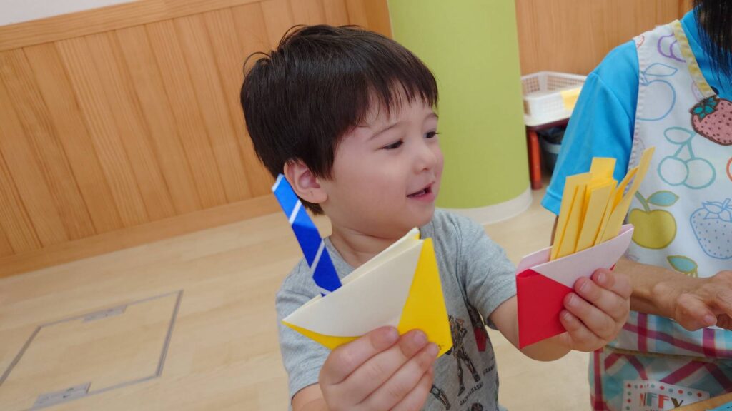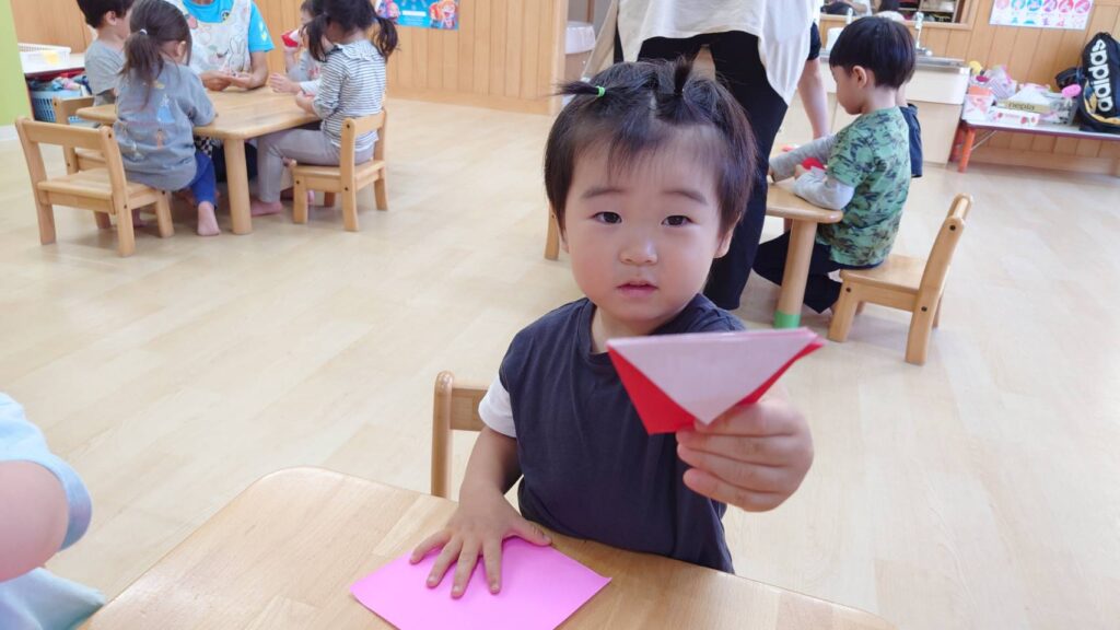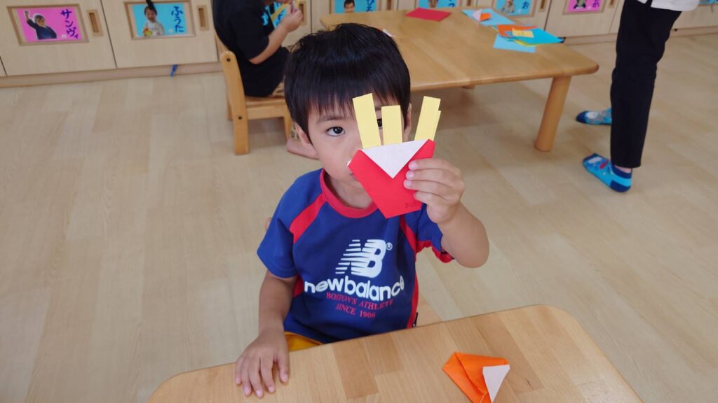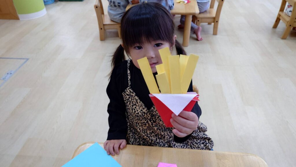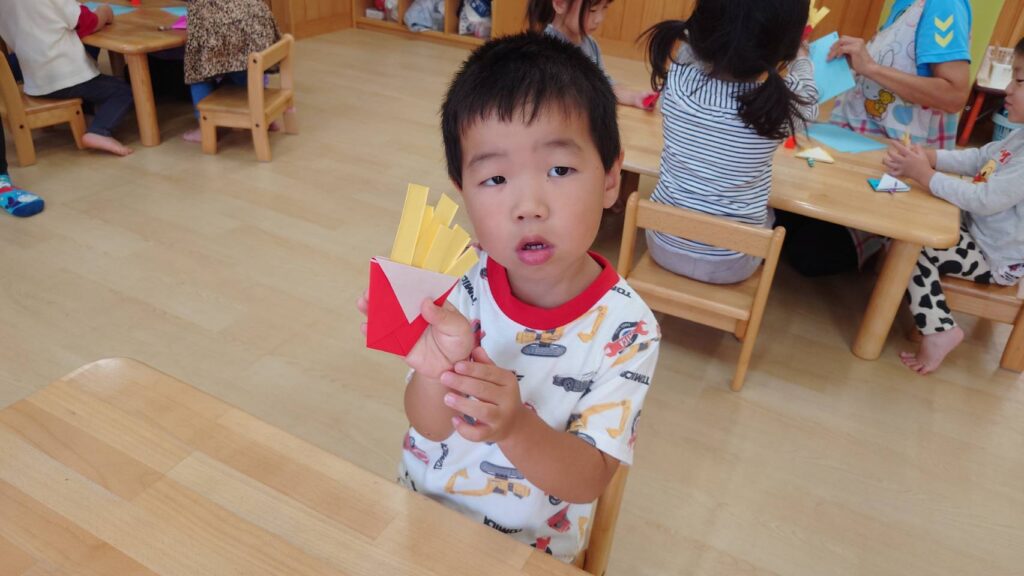 チョコさんは園庭で遊びました!!子どもたちも滑り台や虫探しなど時間いっぱい楽しんで遊びました😄お部屋では折り紙でジュースのコップとポテトの入れ物を作りました🥤🍟子どもたちも慎重に折り紙の角を合わせて頑張って折っていました!!