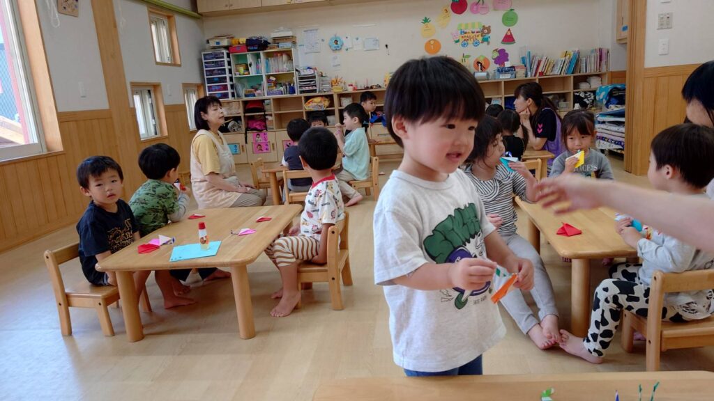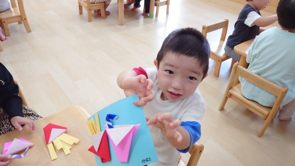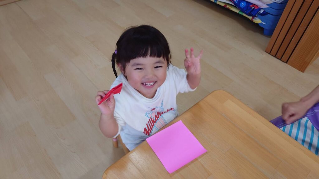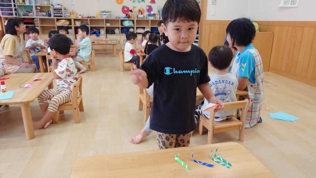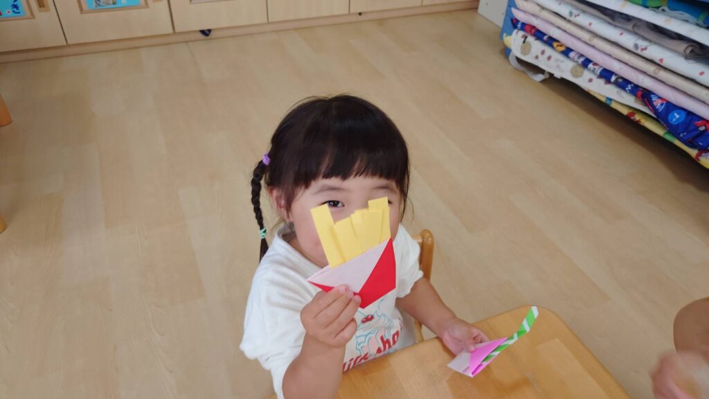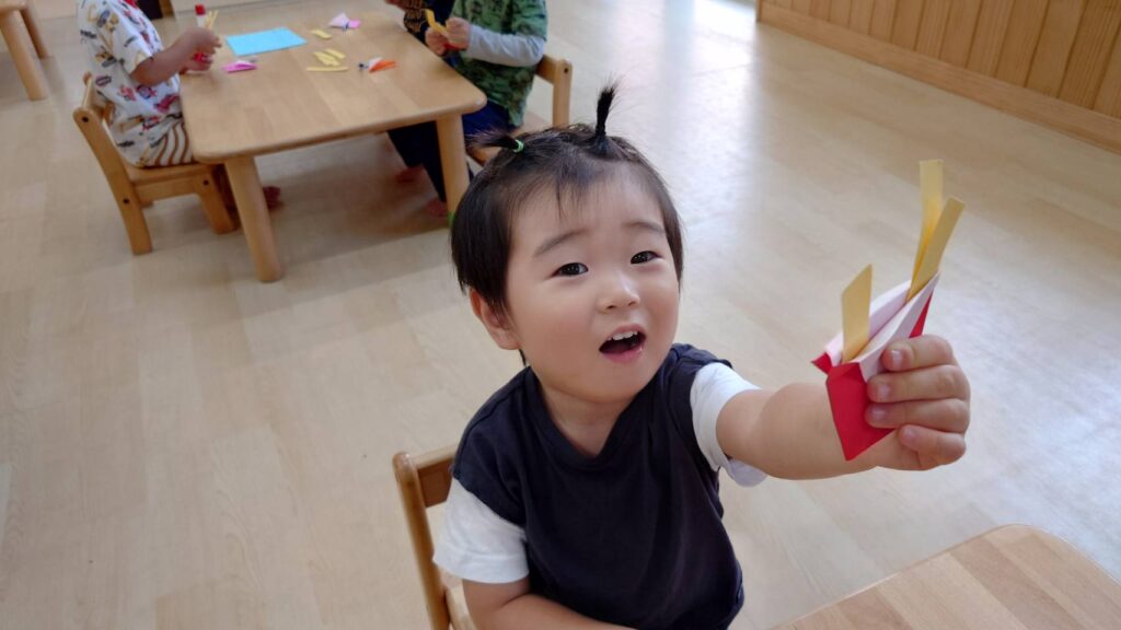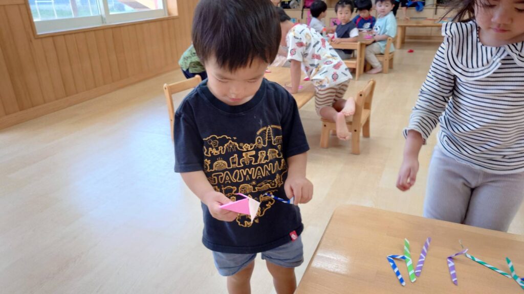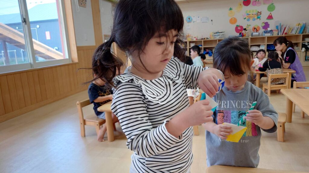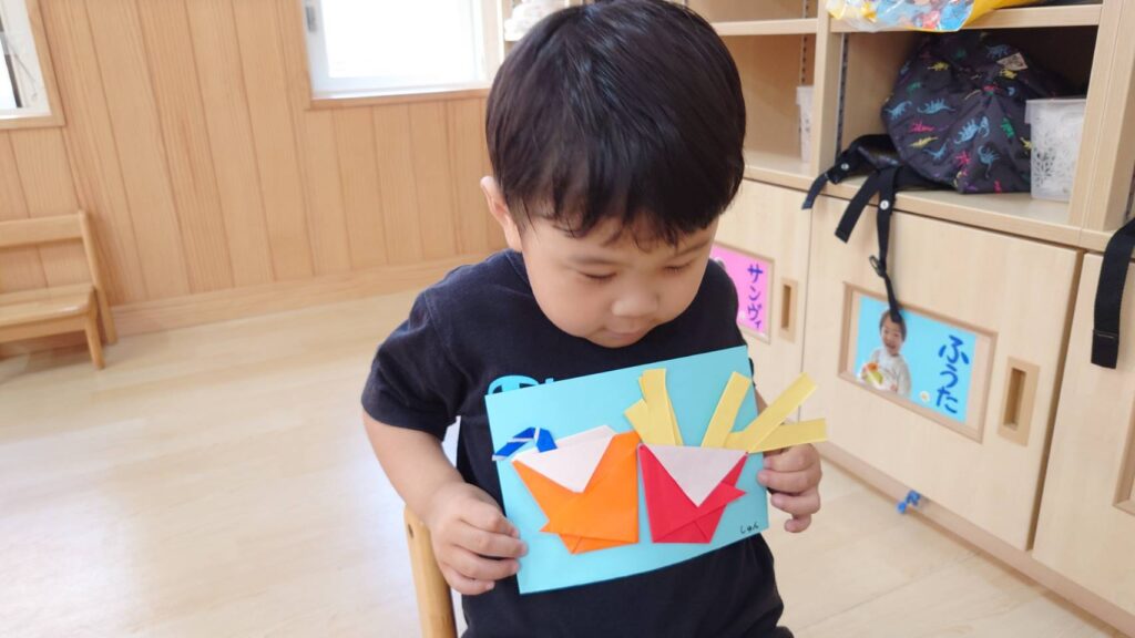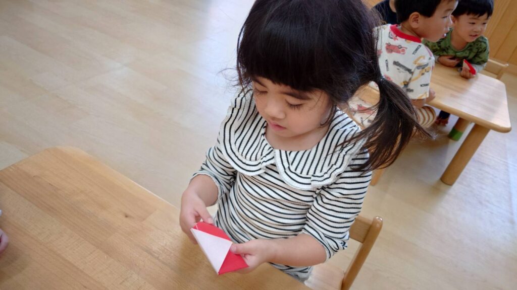 チョコさんは園庭で遊びました!!子どもたちも滑り台や虫探しなど時間いっぱい楽しんで遊びました😄お部屋では折り紙でジュースのコップとポテトの入れ物を作りました🥤🍟子どもたちも慎重に折り紙の角を合わせて頑張って折っていました!!