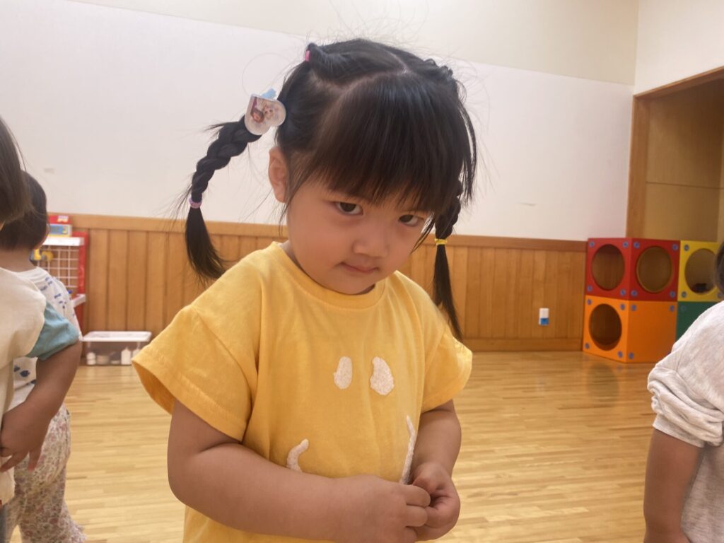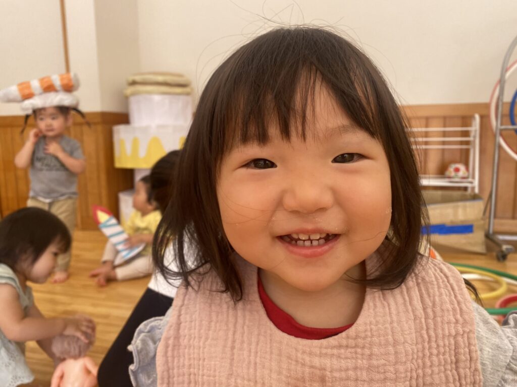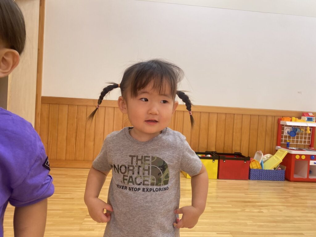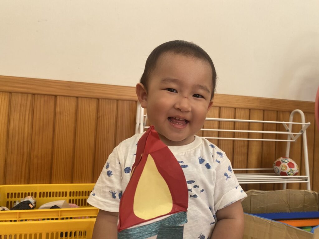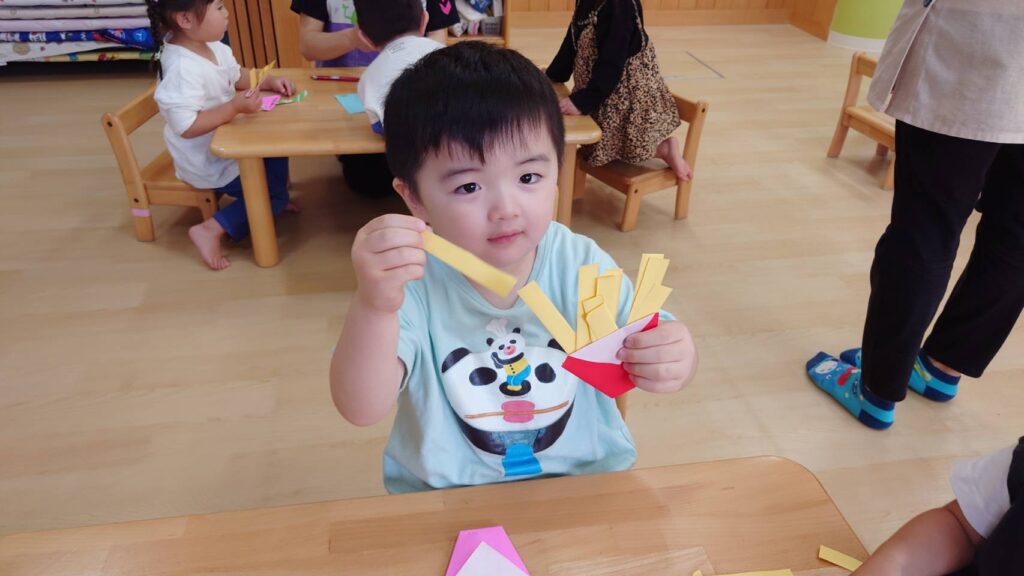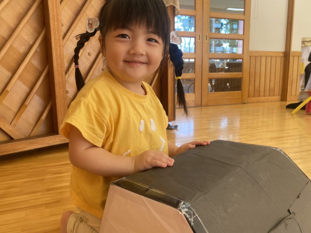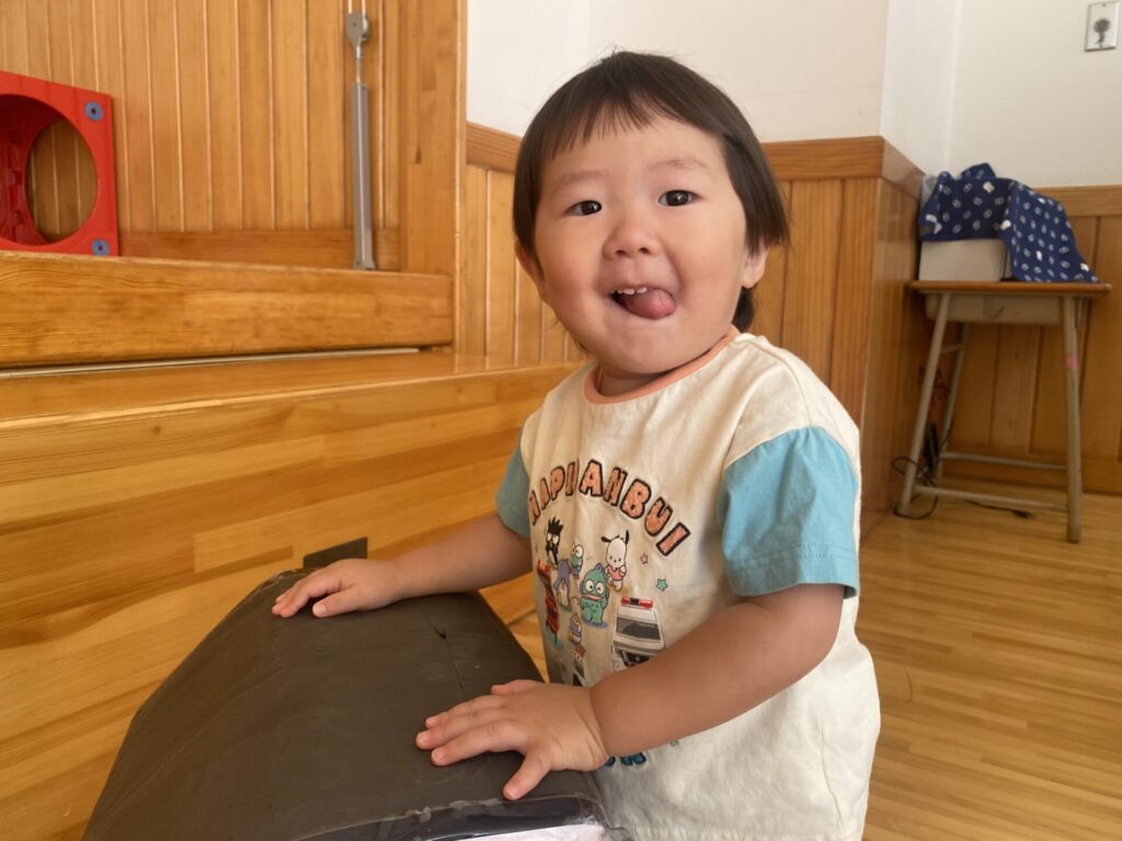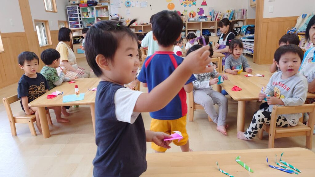 チョコさんは園庭で遊びました!!子どもたちも滑り台や虫探しなど時間いっぱい楽しんで遊びました😄お部屋では折り紙でジュースのコップとポテトの入れ物を作りました🥤🍟子どもたちも慎重に折り紙の角を合わせて頑張って折っていました!!