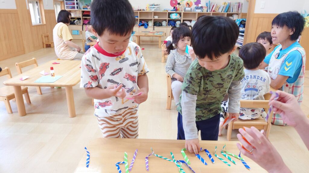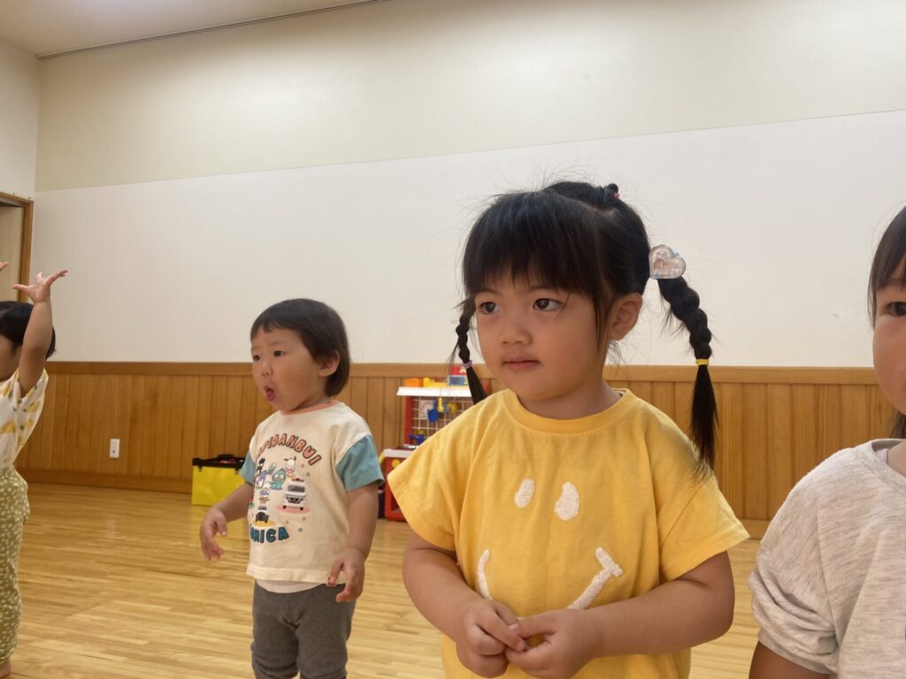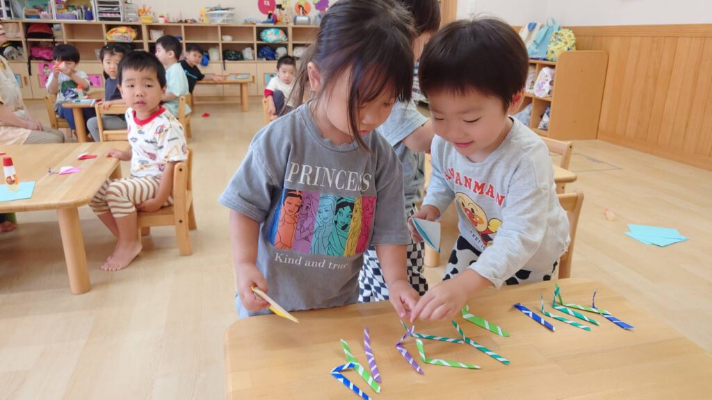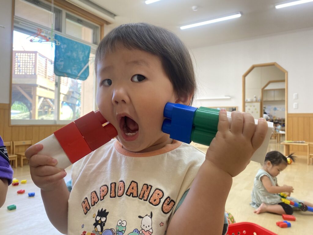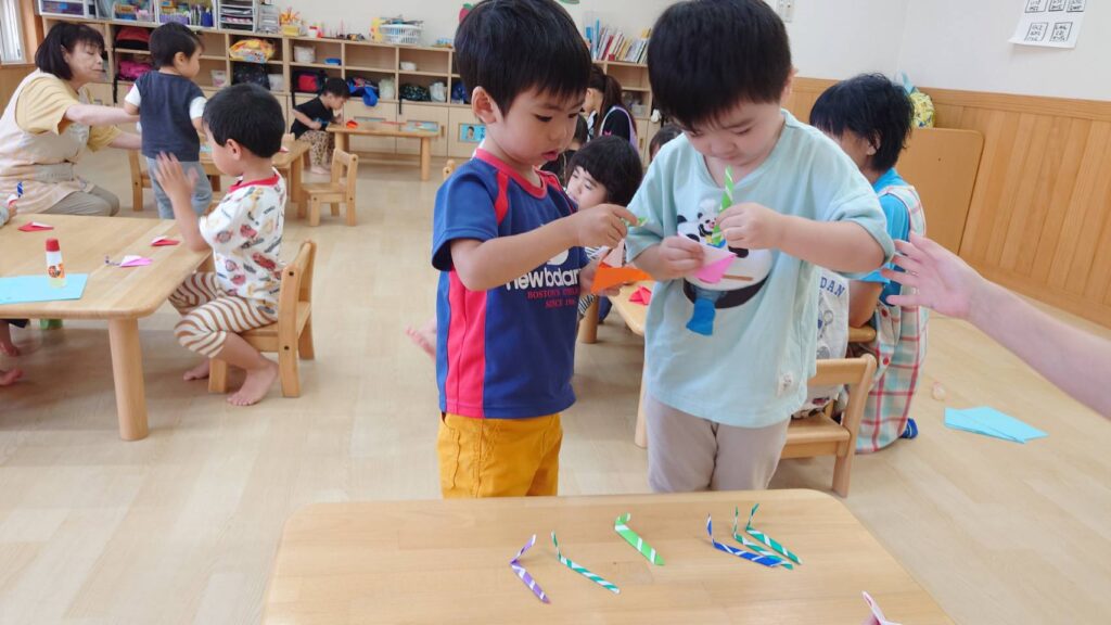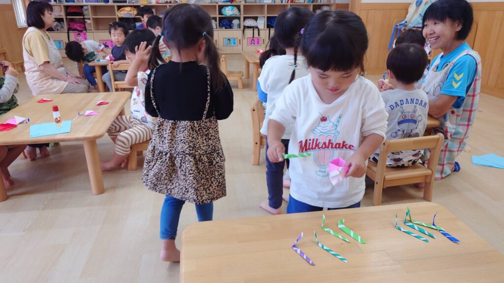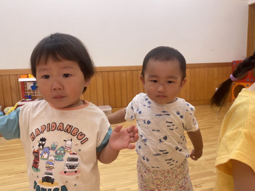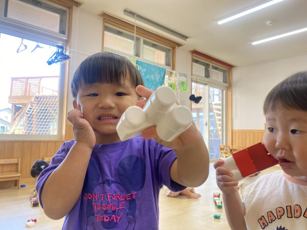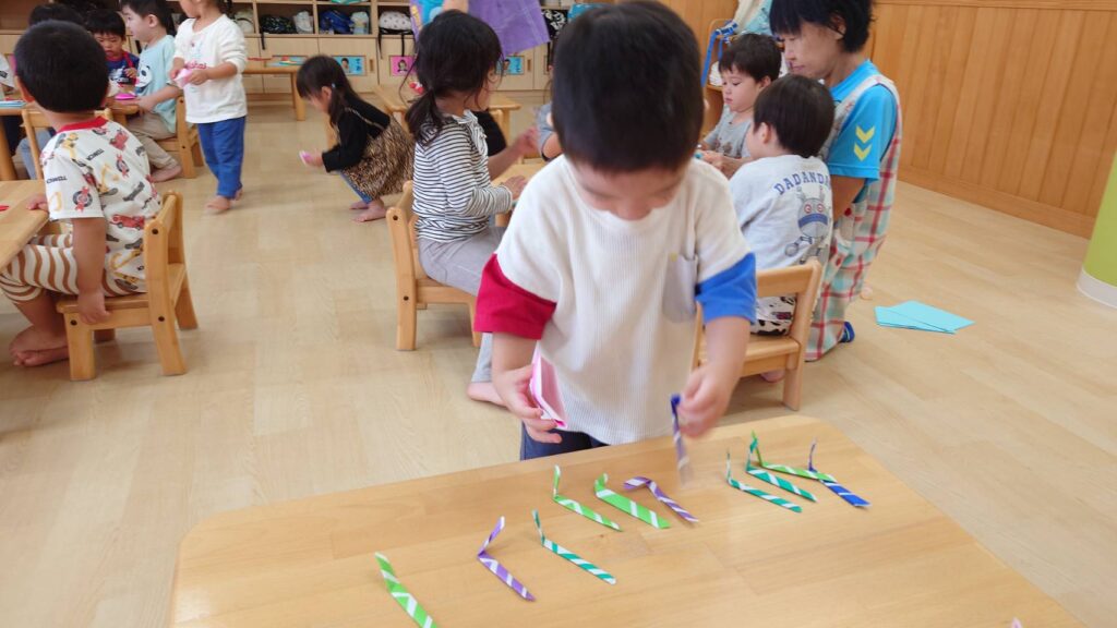 チョコさんは園庭で遊びました!!子どもたちも滑り台や虫探しなど時間いっぱい楽しんで遊びました😄お部屋では折り紙でジュースのコップとポテトの入れ物を作りました🥤🍟子どもたちも慎重に折り紙の角を合わせて頑張って折っていました!!