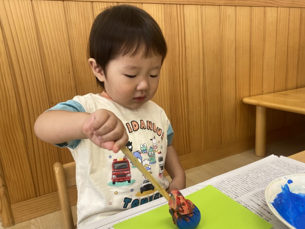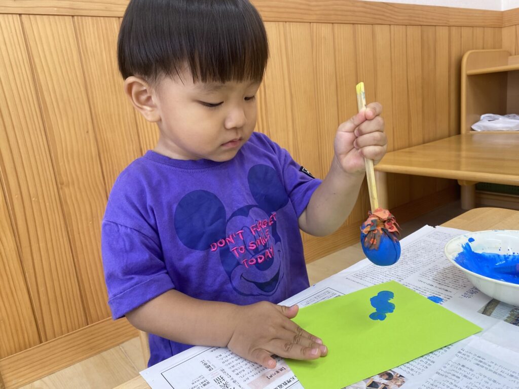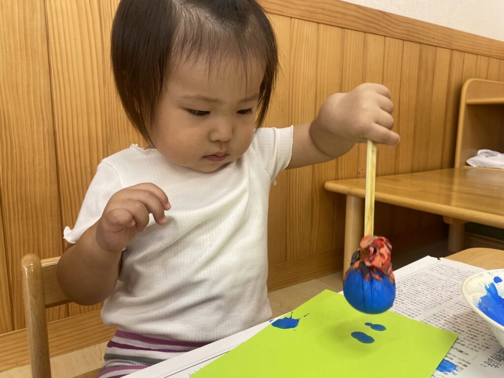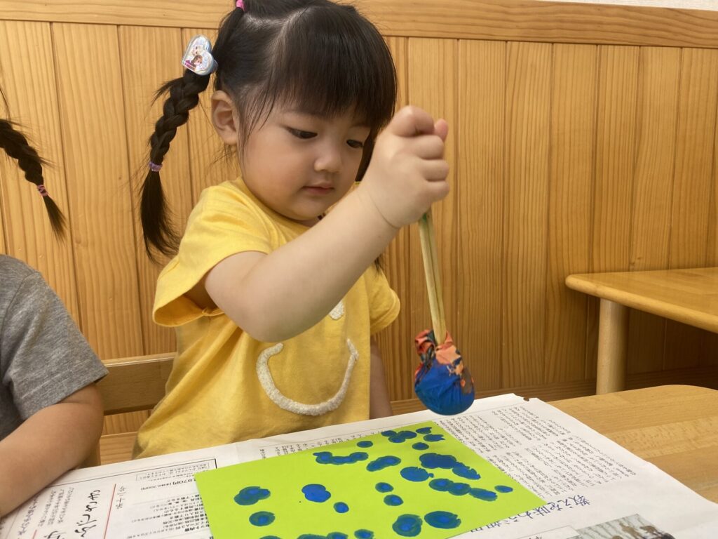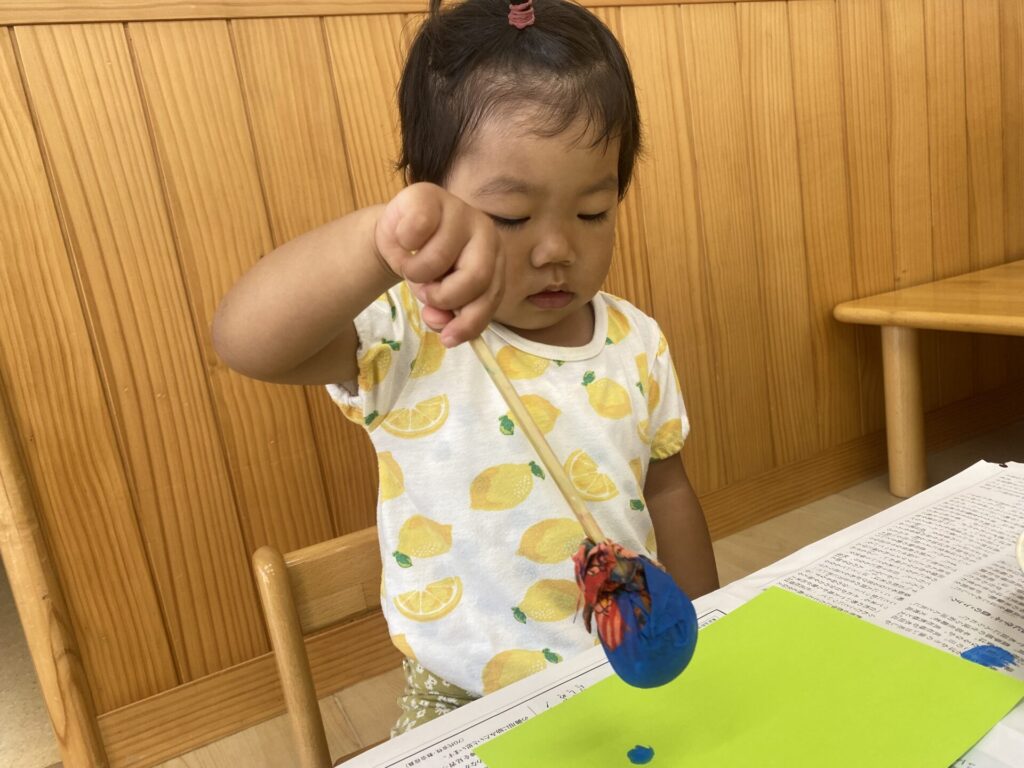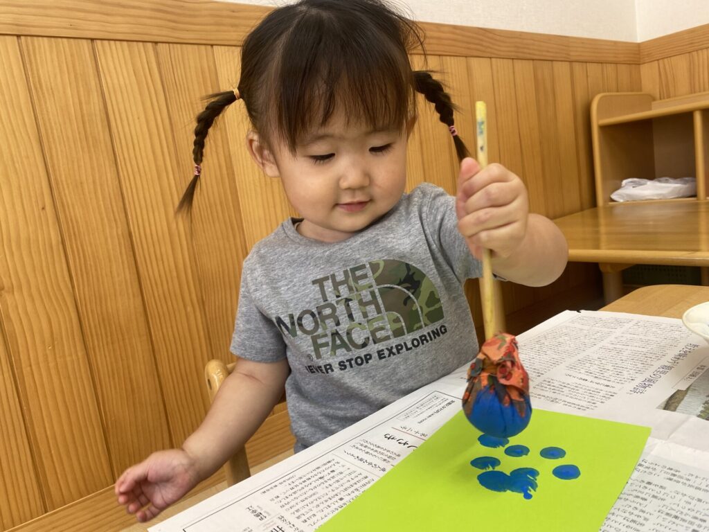 くりーむちゃんはホールでダンスをしたり、好きな遊びをしたりと思いきり体を動かして楽しみました🥰お部屋では製作をしました🌟子どもたちも真剣にタンポンで模様を付けて楽しんでいましたよ🎶