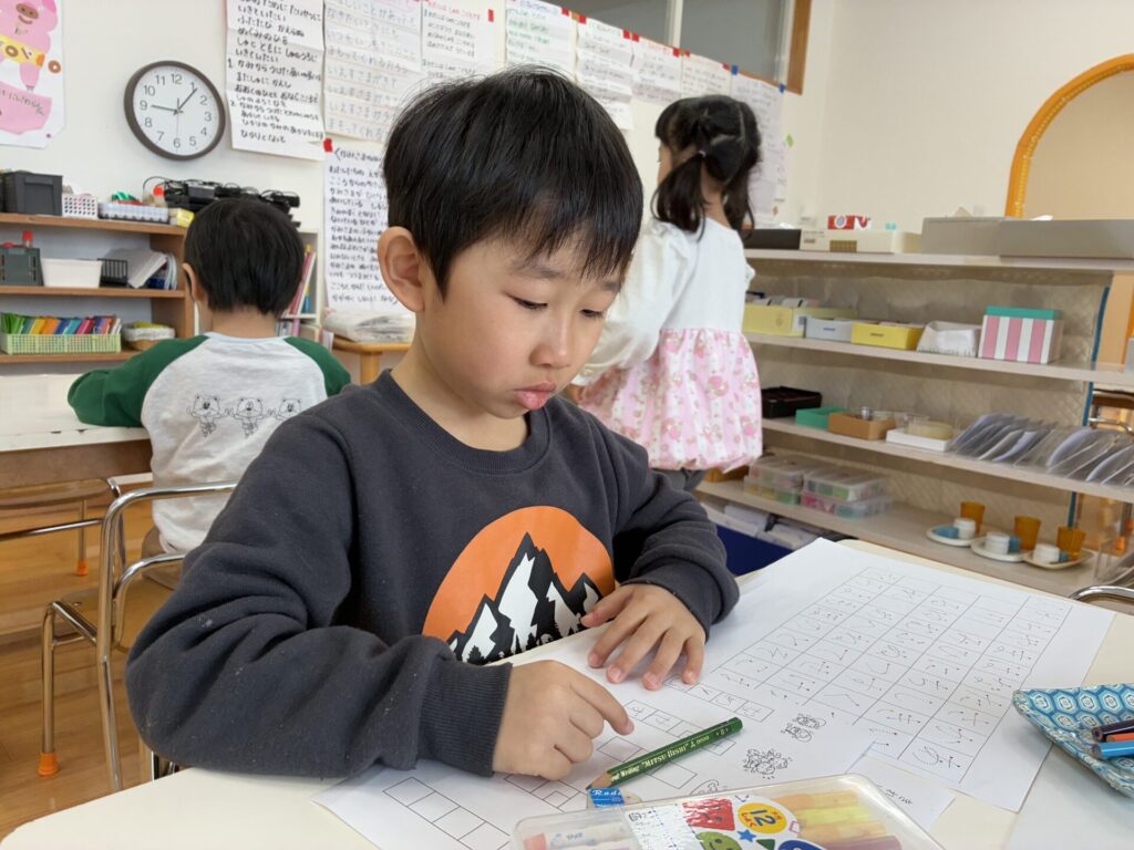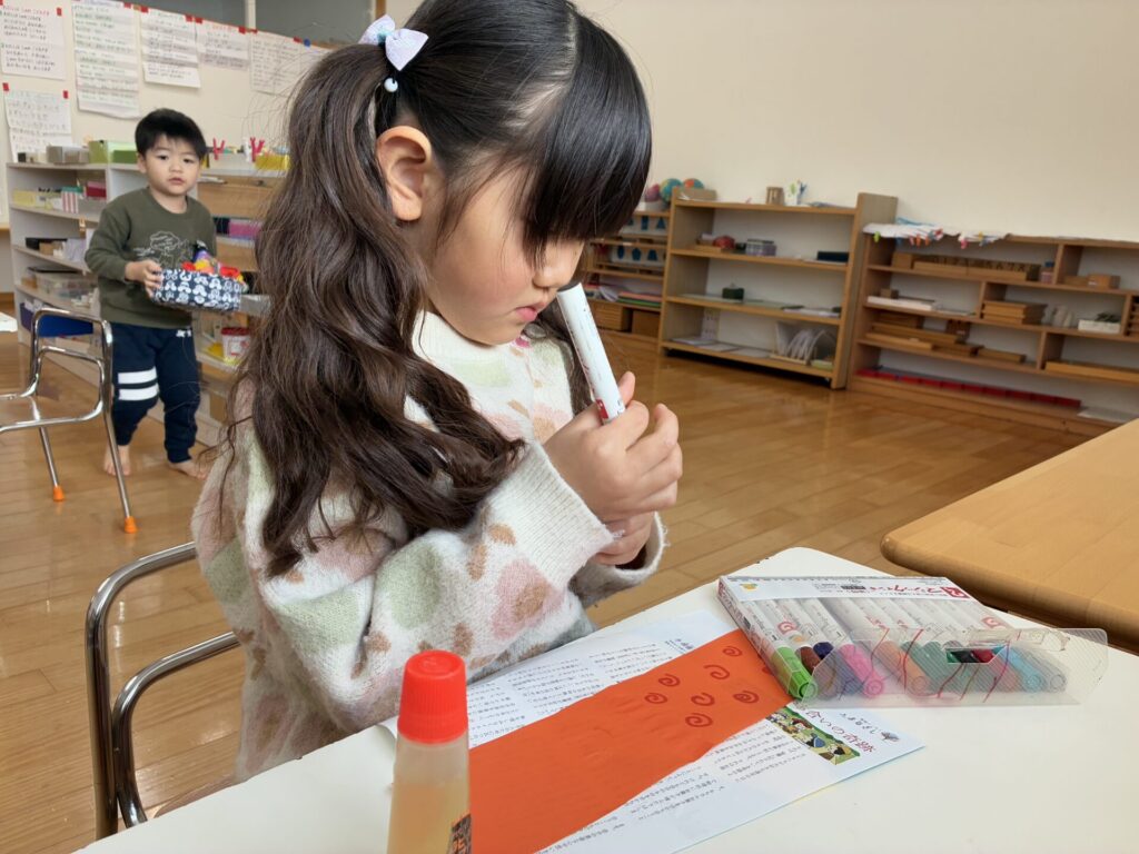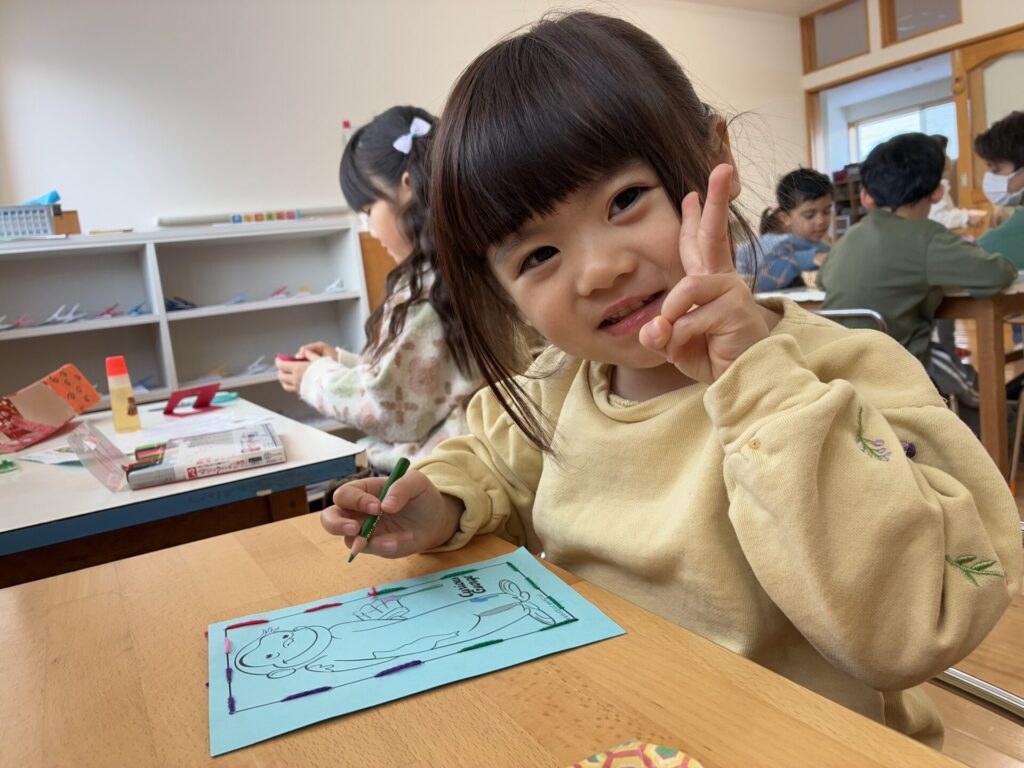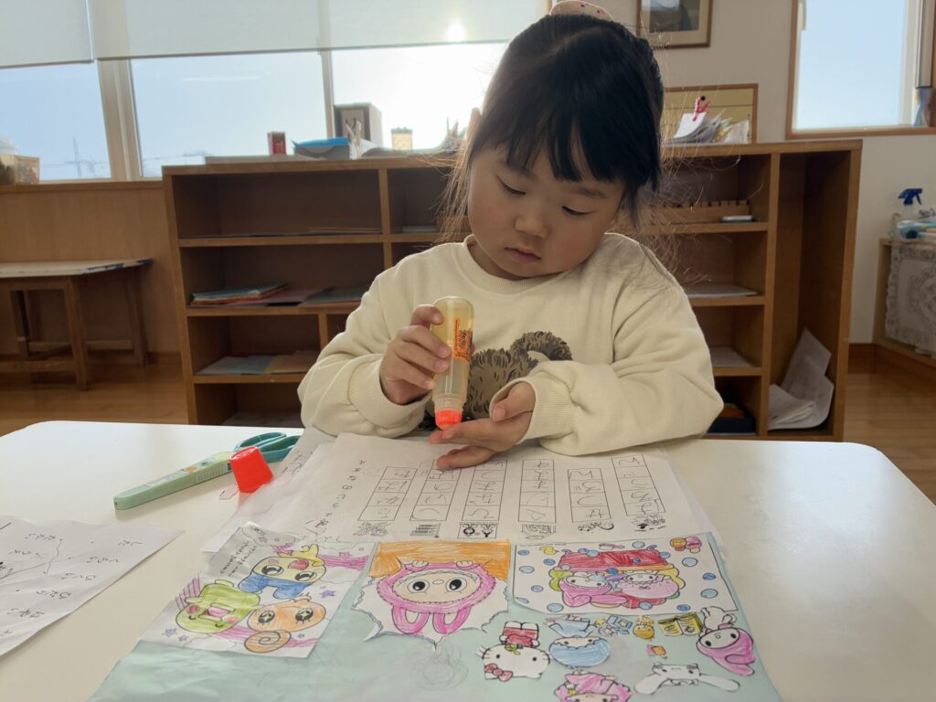 棚には新しいプリントや、塗り絵が補充されていて「わ~~!これやりたい!」と自分たちで発見して嬉しそうに取り組んでいます!