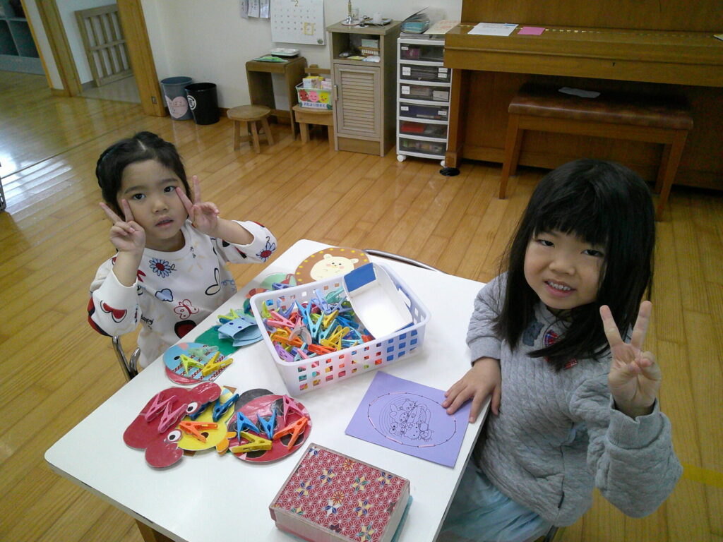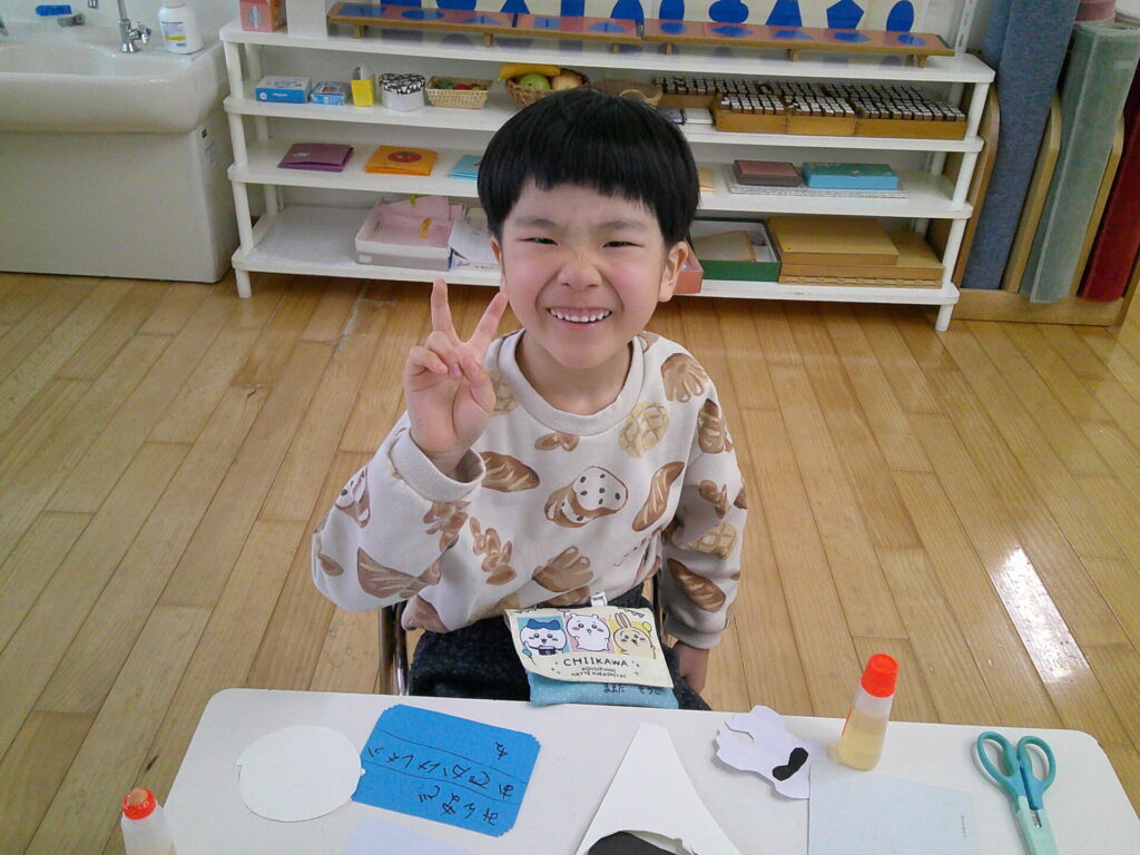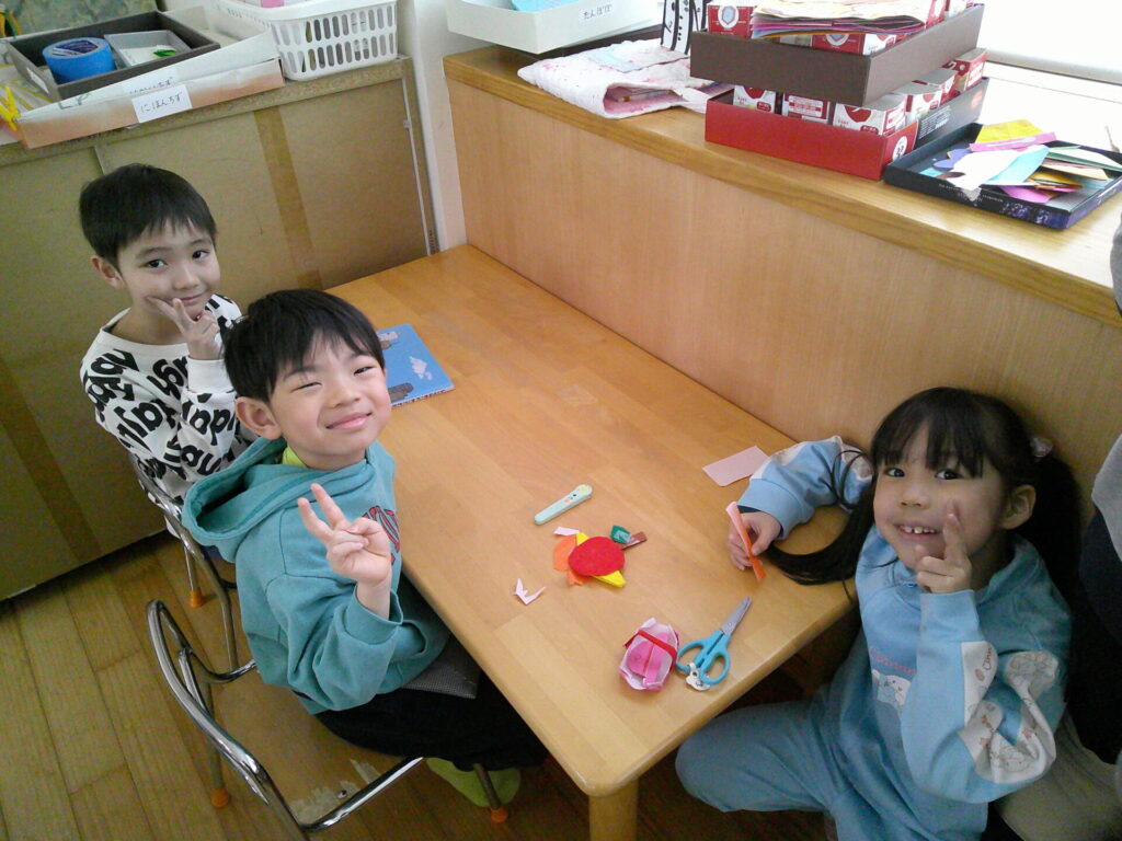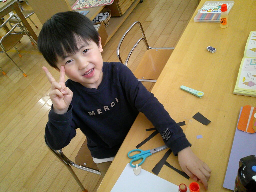 お引越しするお友達にプレゼントを作ったり、平仮名や数字プリント・名前なぞり等を頑張ったりと毎日一生懸命取り組んでくれていますよ!「今日でプリント10枚にして本にして持って帰りたいんだ!」「名前なぞり頑張って持って帰りた!」と各々目標を決めて取り組んでくれている子ども達です