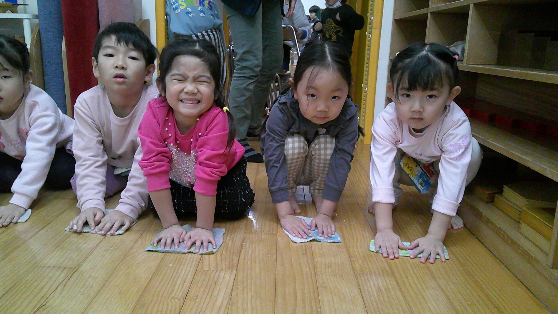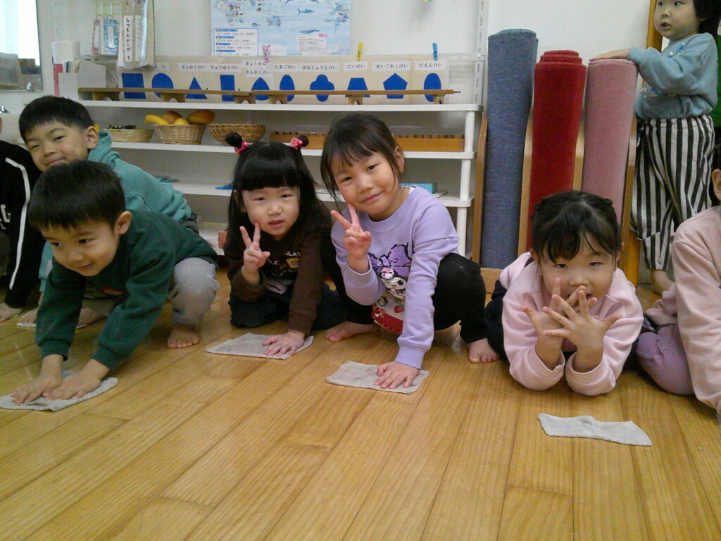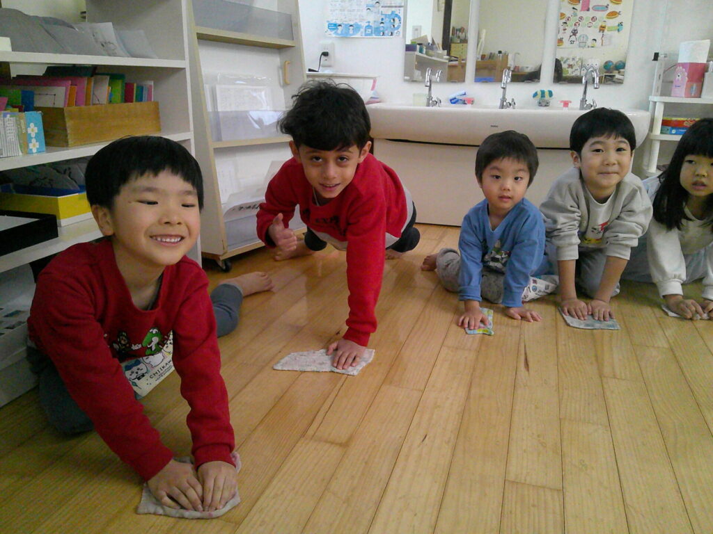 今日はみんなでお部屋の大掃除をしました!教具や棚を丁寧に拭いてくれたり、椅子や机、床も吹いてくれたちゅうりっぷ組の皆さんです✨棚の中もピカピカにしてくれた子ども達。青バッチさんやお引越ししてしまうお友達は棚の中が空っぽで何も入っていないのを見て「何も入っていない!」と嬉しそうにしていましたよ🌟