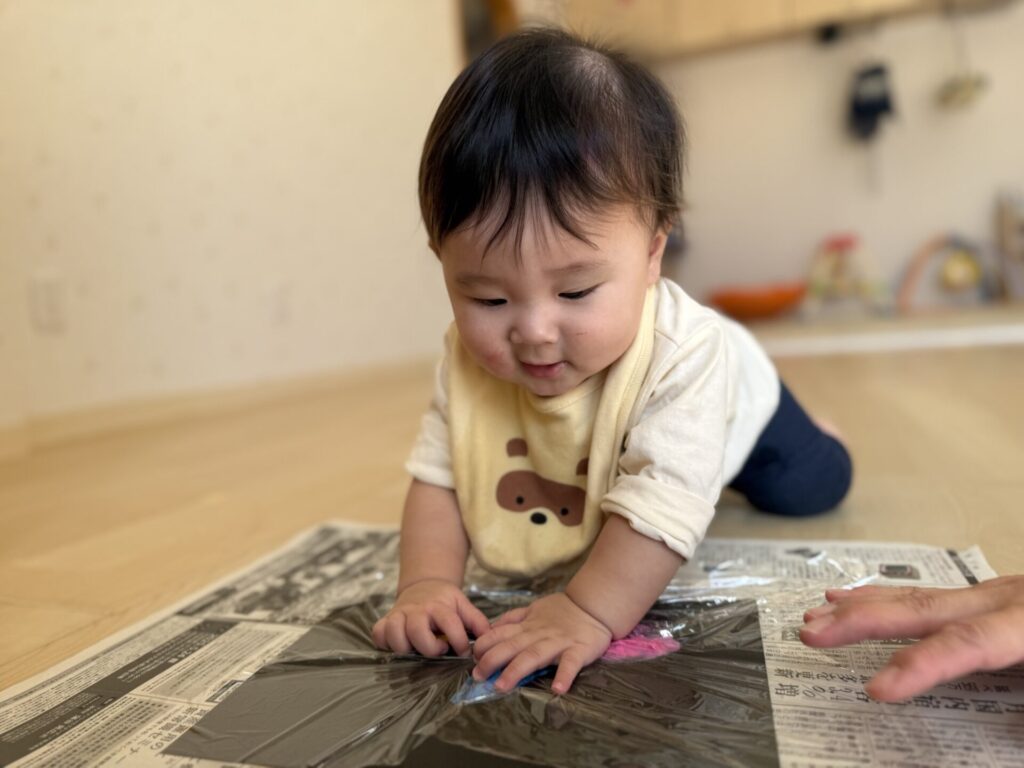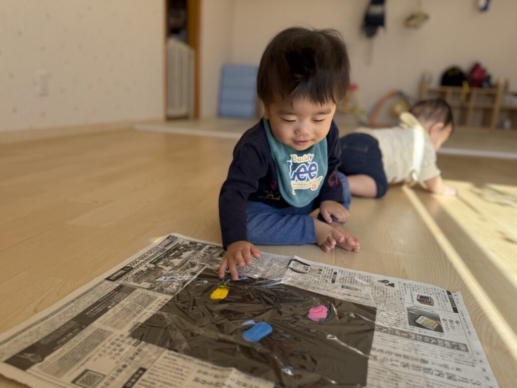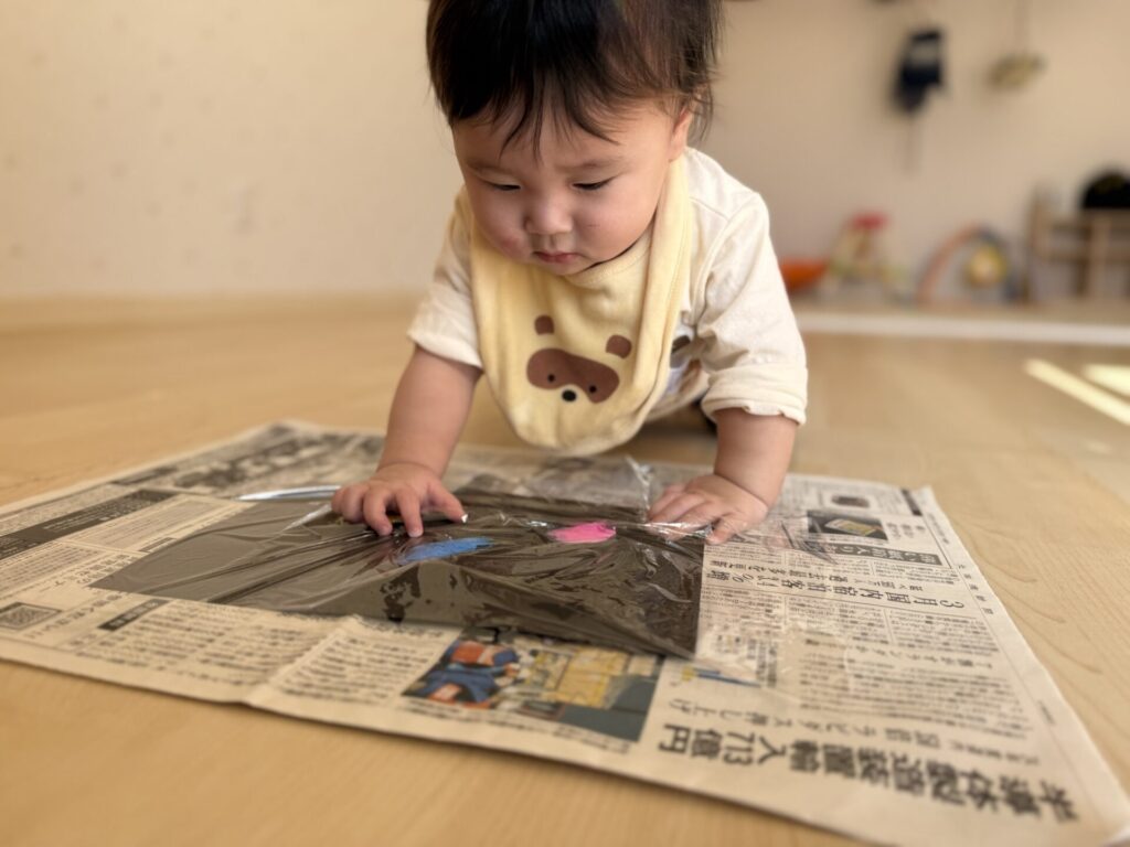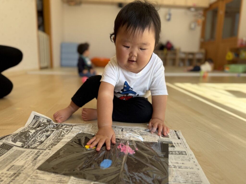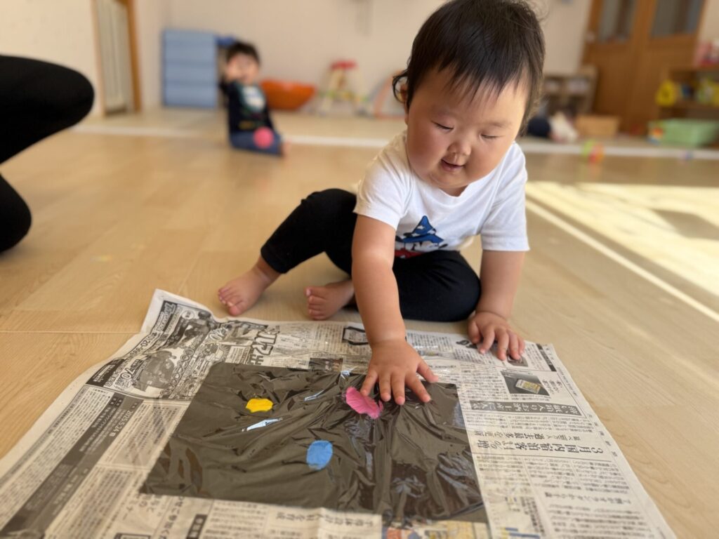 少し早いですが、ハロウィンに向けての製作に取り組みました💖ラップの上から絵の具をペシペシと叩きました!!初めは恐る恐る触っていましたが、後半はダイナミックでしたよ🤣🤣