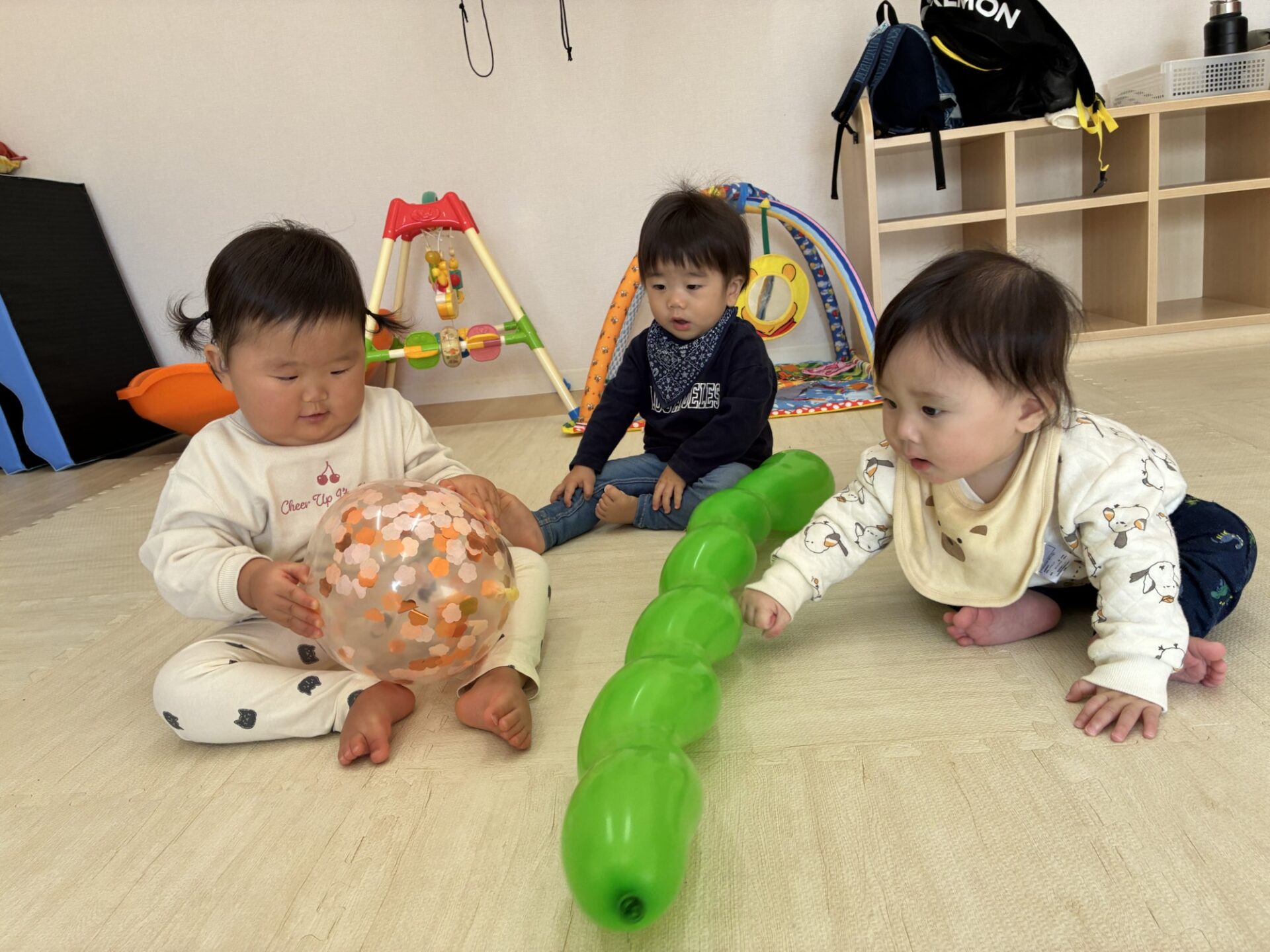 今日は、お部屋で風船遊び🎈をしました✨風船に興味津々なみんな!!力が強くなり「バンッ」と割れてしまいましたが、泣かずに次の風船まで一目散でした😆とっても逞しいひよこちゃんです🥰園では少しずつインフルエンザになるお友達も出て来ています。体調管理に気をつけて行きましょうね!