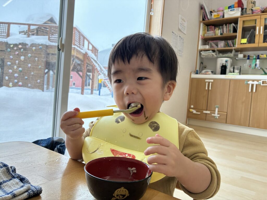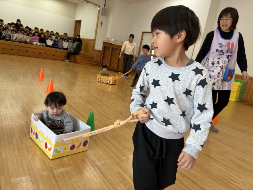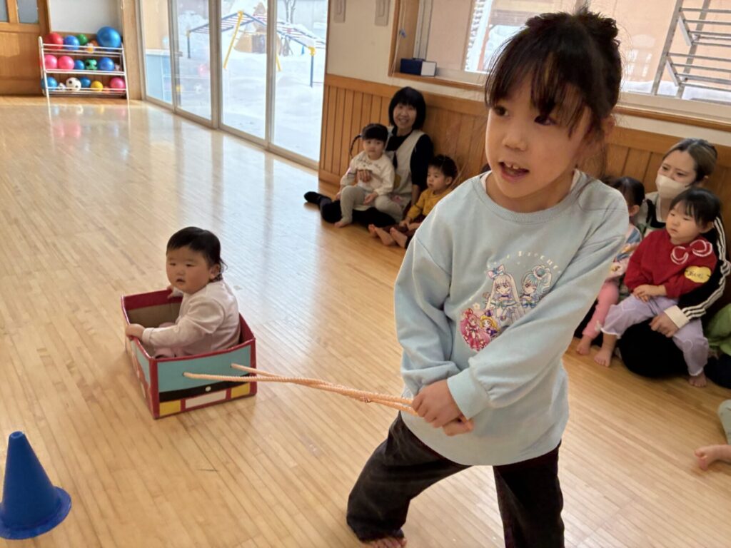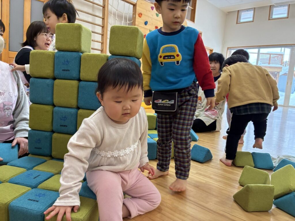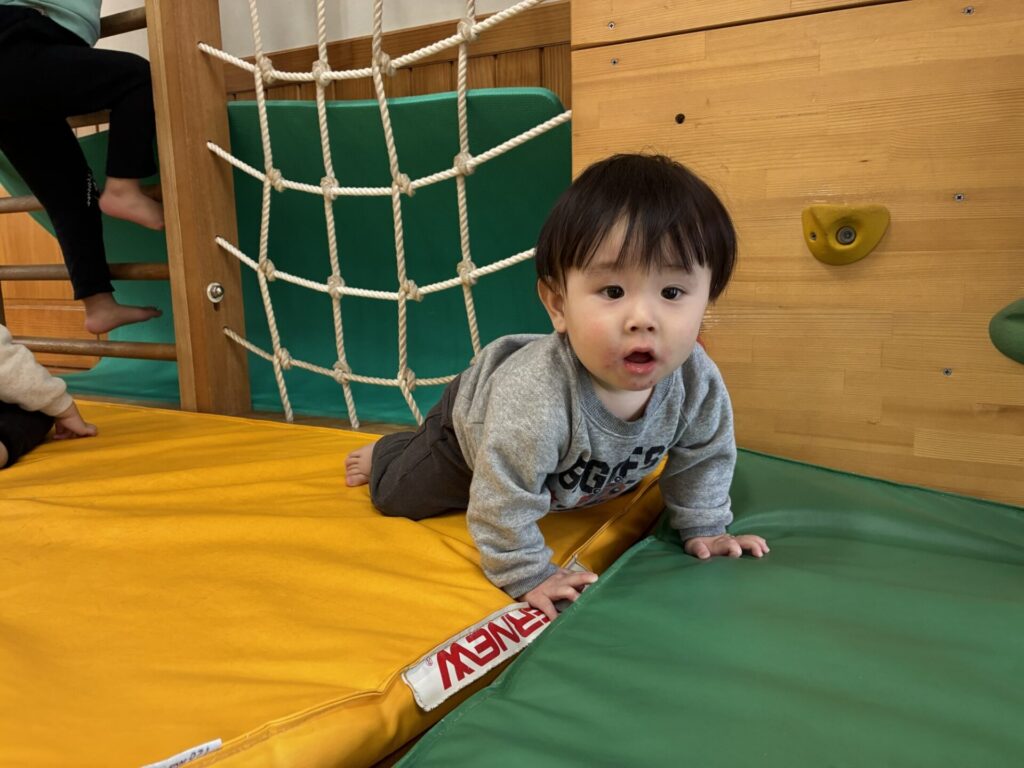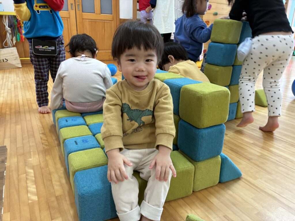 今日も元気いっぱいのひよこちゃんのお友だちです🥰ホールでは、チョコさんが作ってくれたブロックの椅子に座ったり、真似をして肋木を登ろうとする姿も…😊💕ふれあいタイムで青バッチさんに箱を引っ張ってもらったり、給食をお腹いっぱい食べたりと、今日も楽しく過ごしました☺️✨