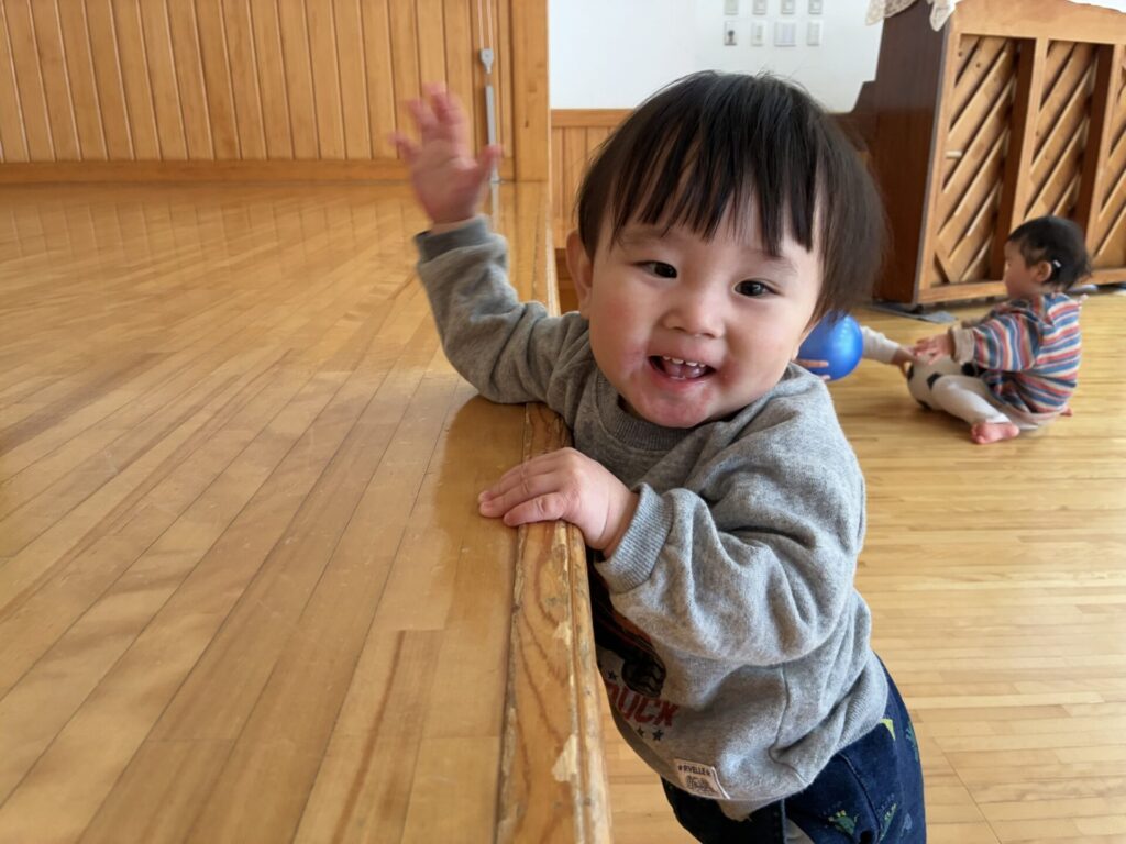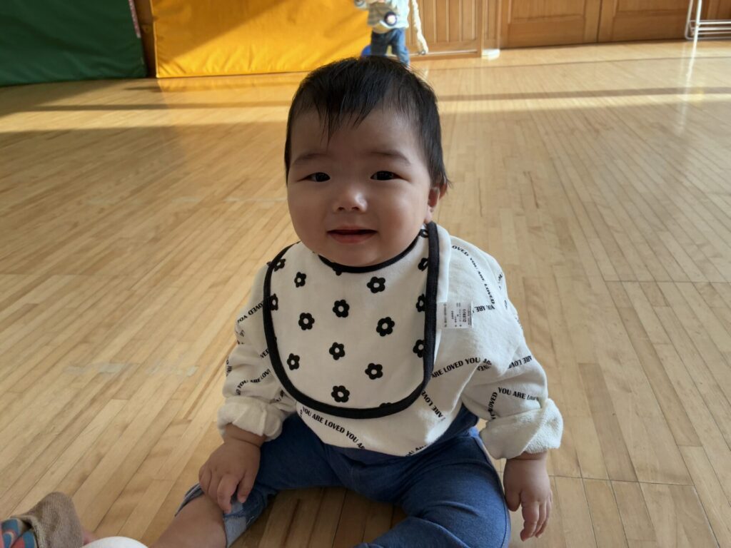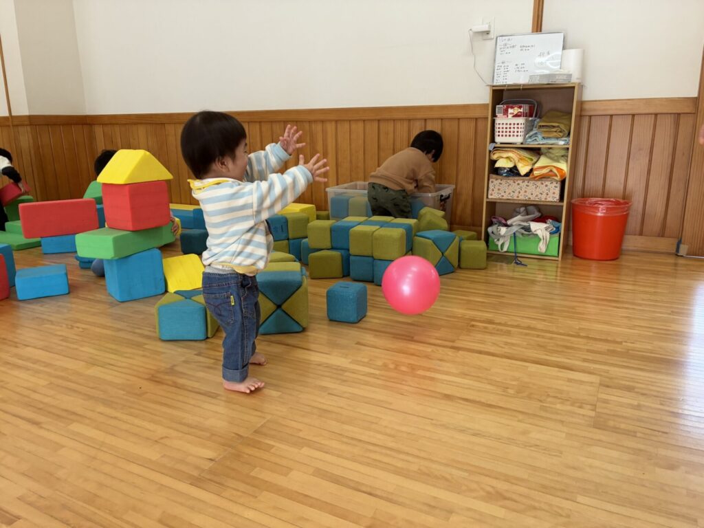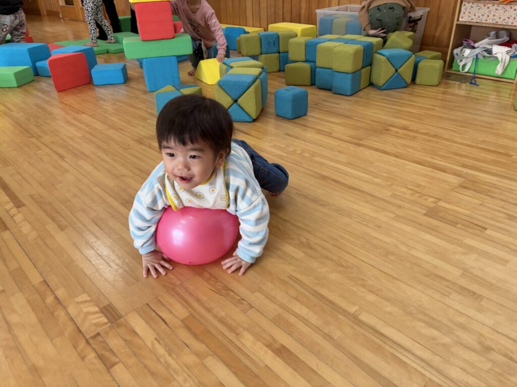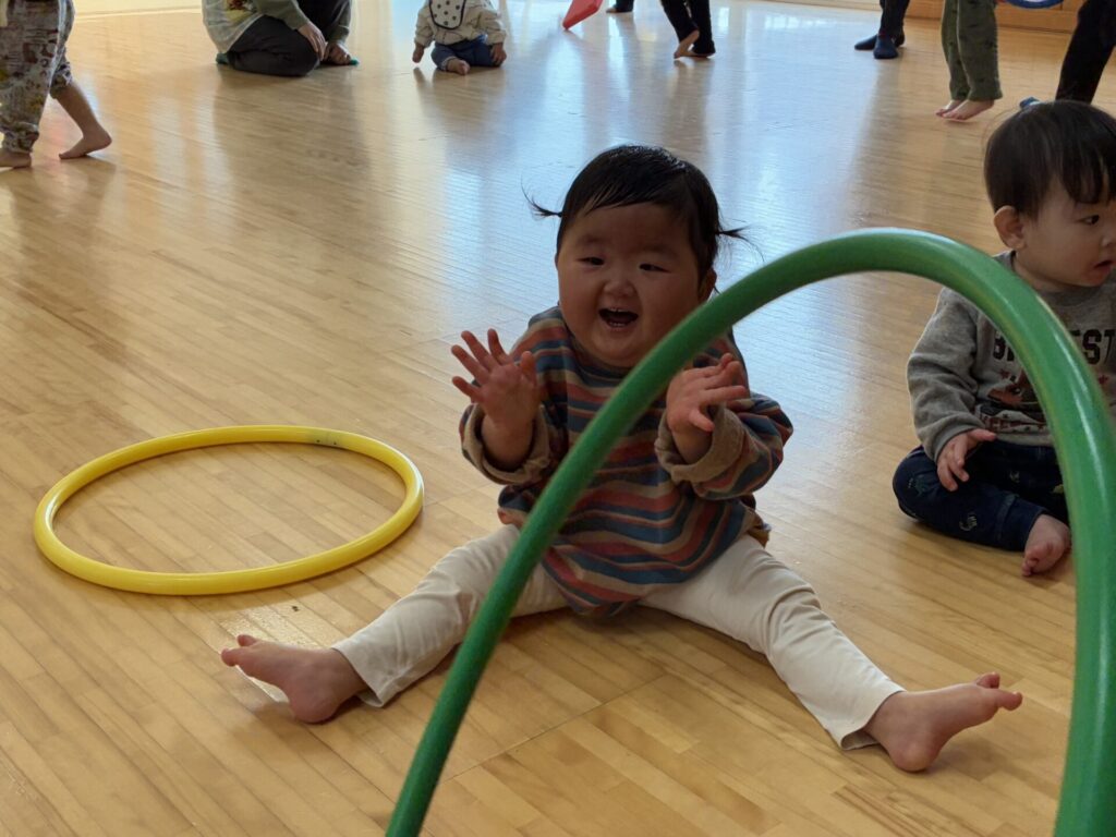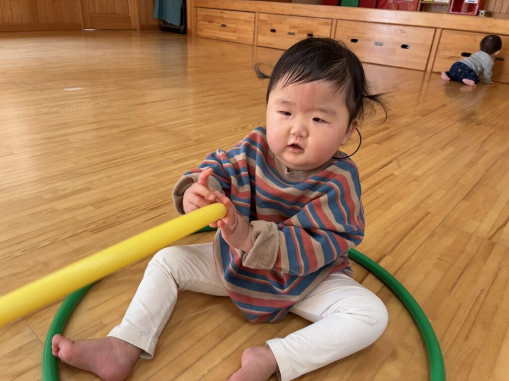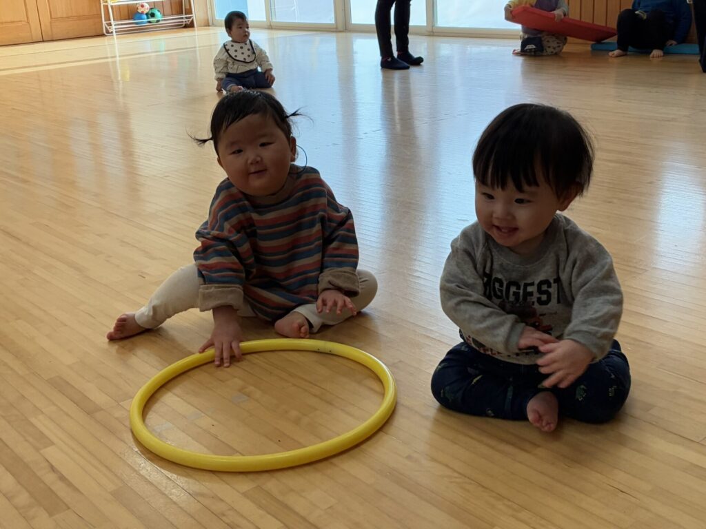 ひよこちゃんにお友達が1人増え、4名となりました☺️✨今日はみんなでホールで沢山遊びましたよ🎵フラフープを追いかけたり、お友達同士でフラフープの輪を覗き込み笑い合ったり、先生とボール投げも楽しみました😊💕