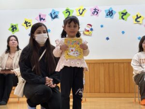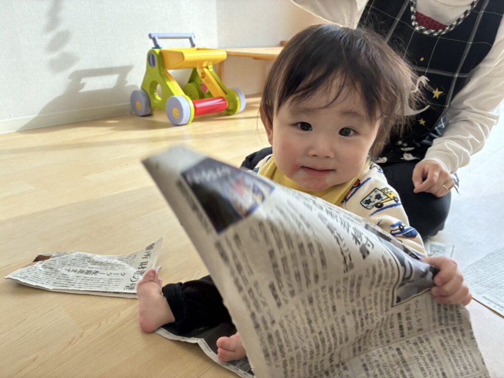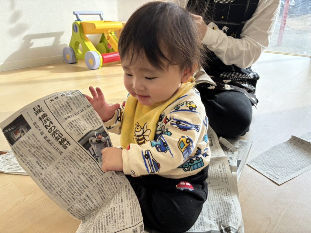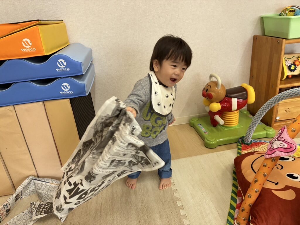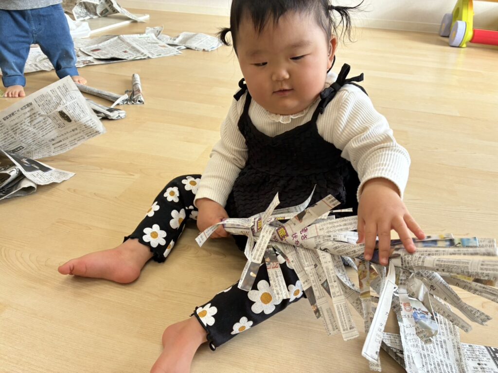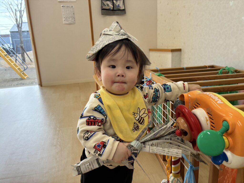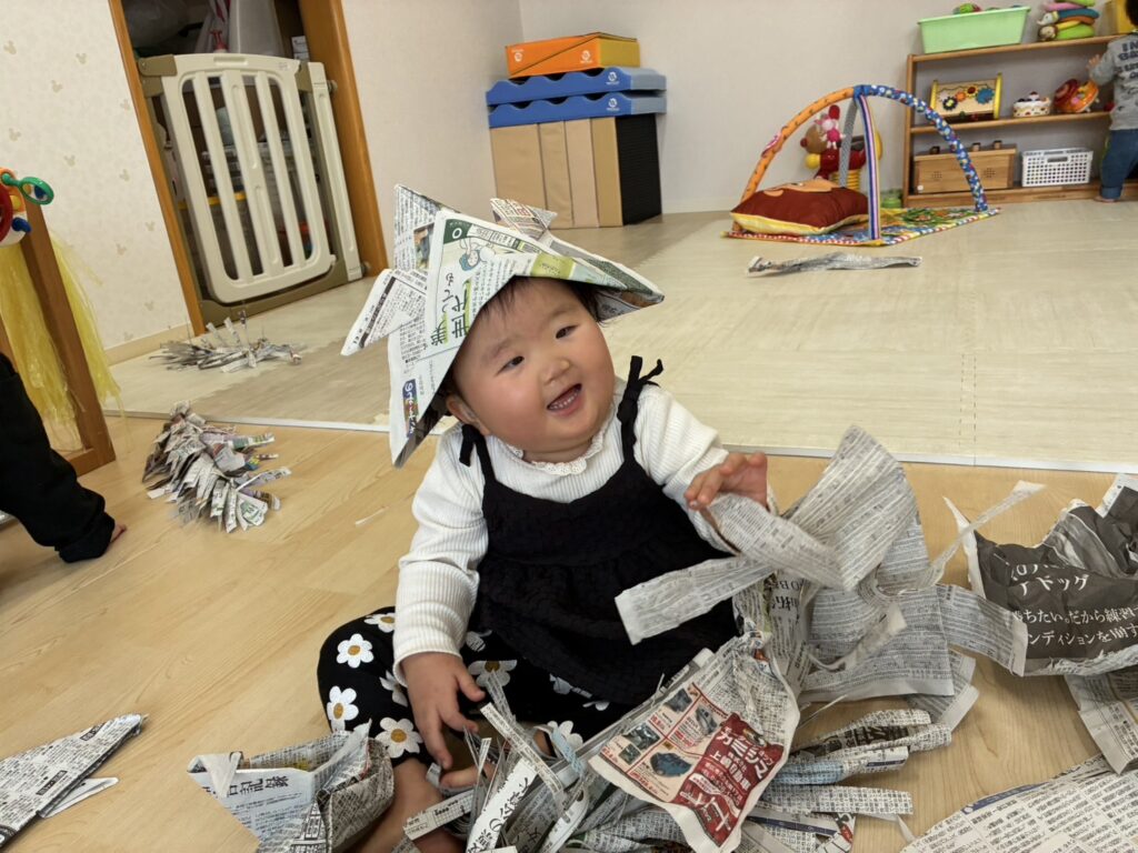 新聞紙が破れる音に大喜びで、自分で新聞紙を掴んで真似て破いていましたよ🥰新聞紙で作った兜やツリーもニコニコで手を伸ばして遊んでいました!自分で兜を被って、そのままお辞儀をし、兜が落ちると、面白かったみたいで、何度も続けて手をパチパチ😆✨明日も待っています🥰🎶