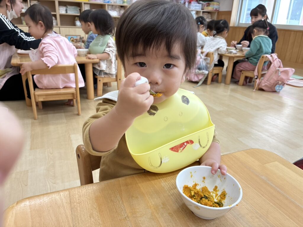 給食、スプーンやフォークも上手に使えるようになりましたね🥰