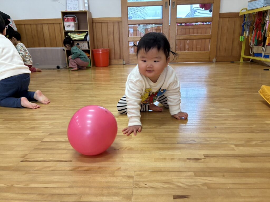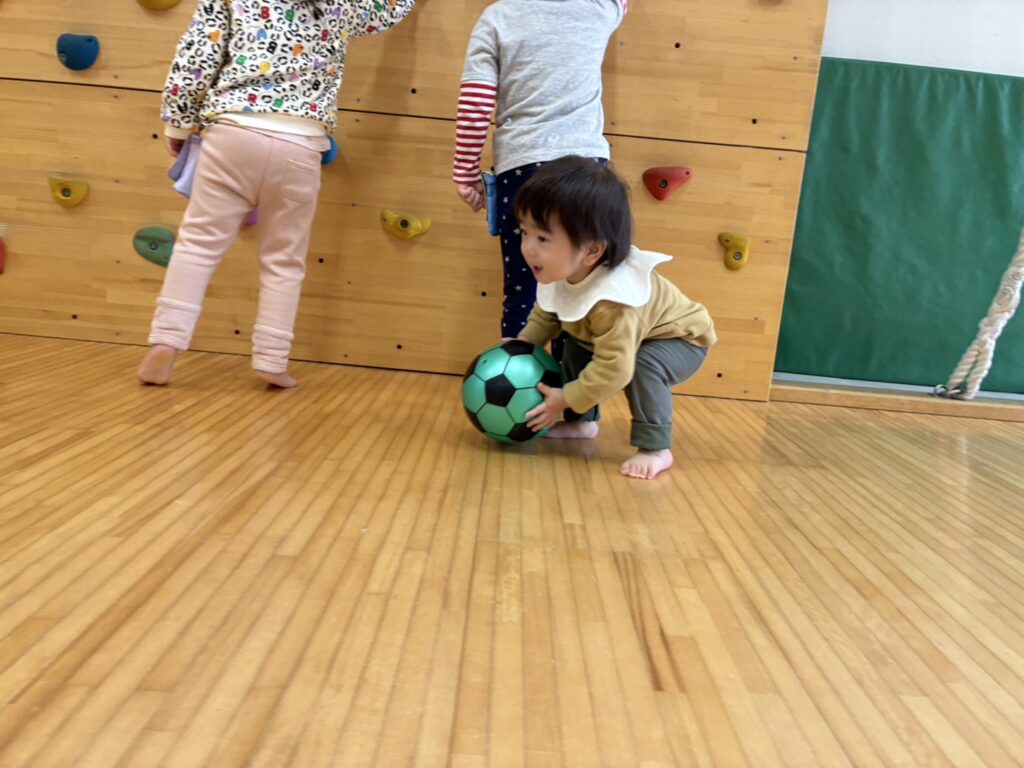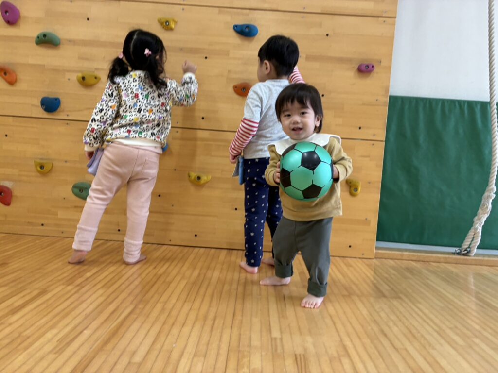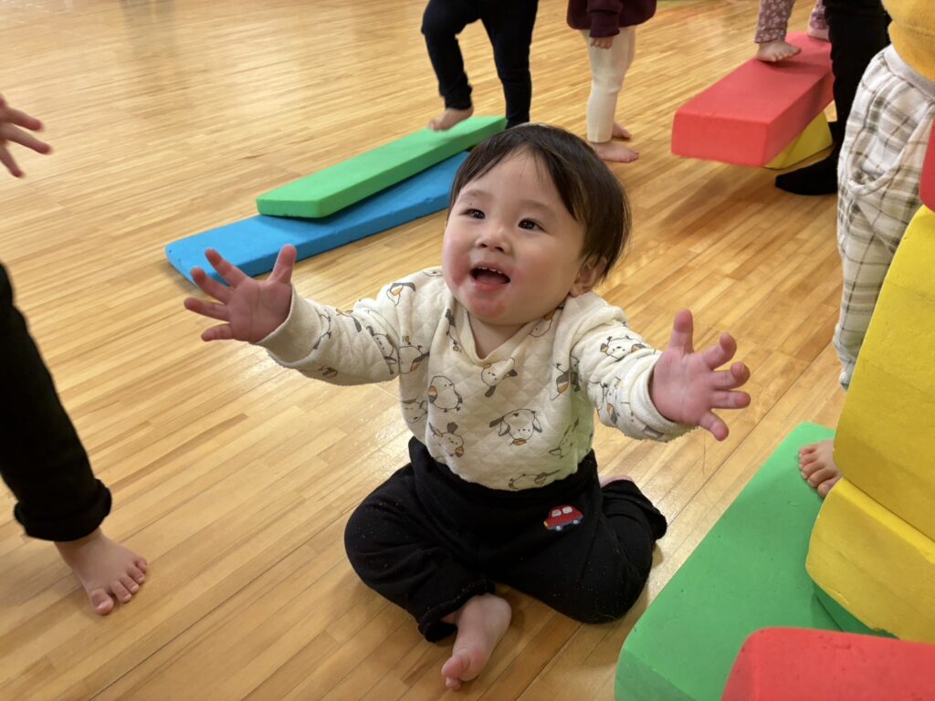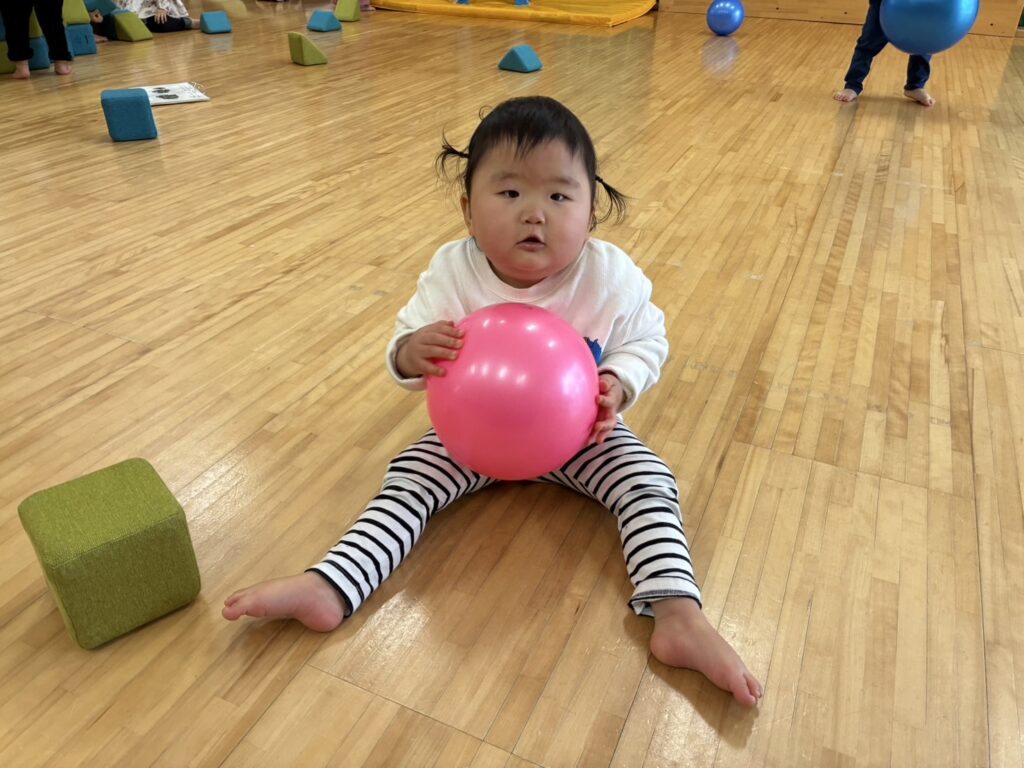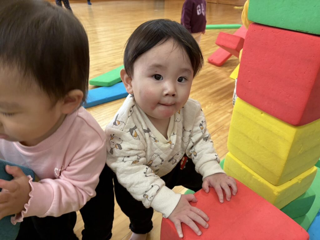 今日はホールで沢山体を動かして遊びました😆ボールやソフトブロックに大喜び🥰ボールを上から上手に投げたり、ソフトブロックに登ったり、とってもニコニコでしたよ🎶