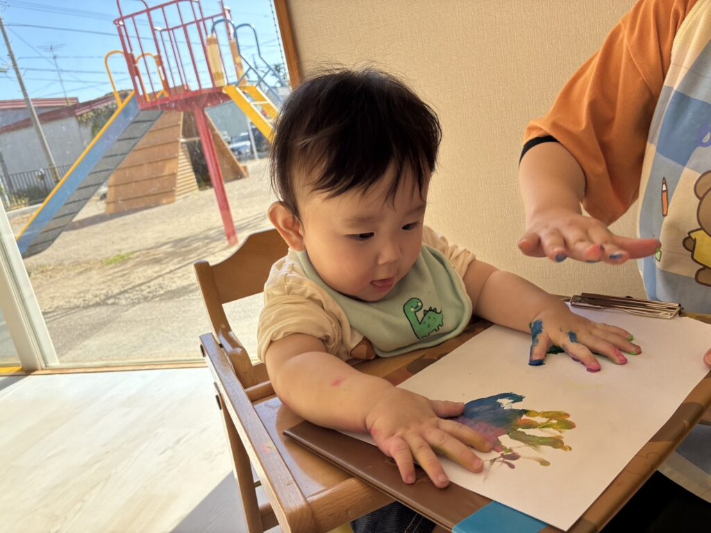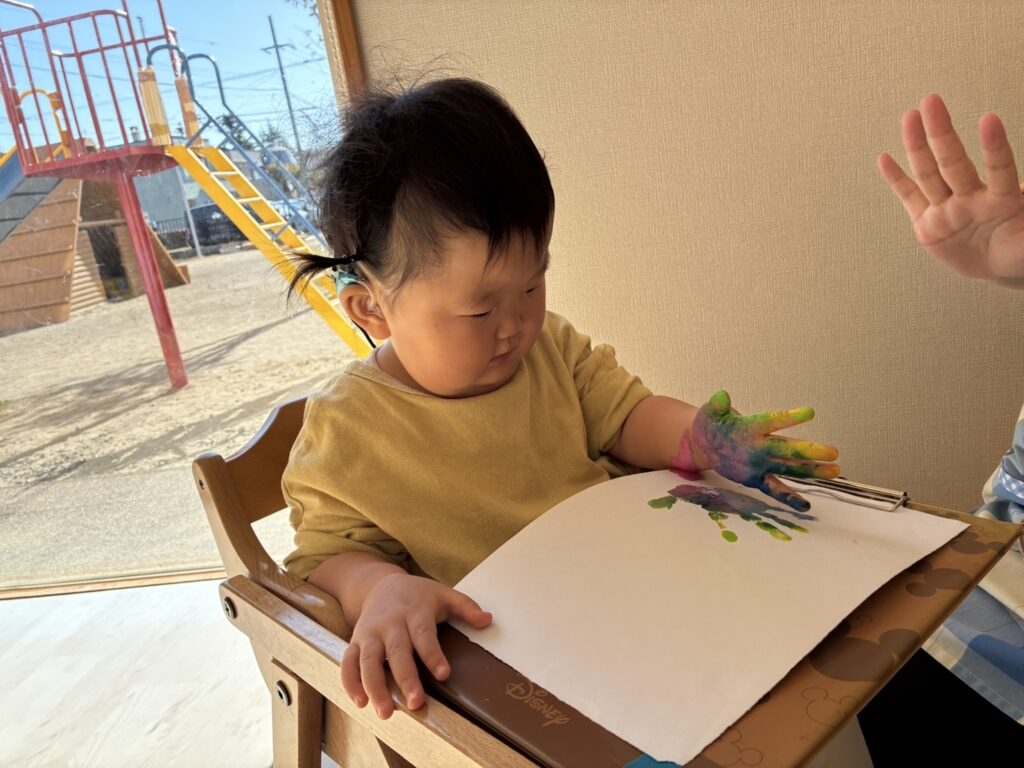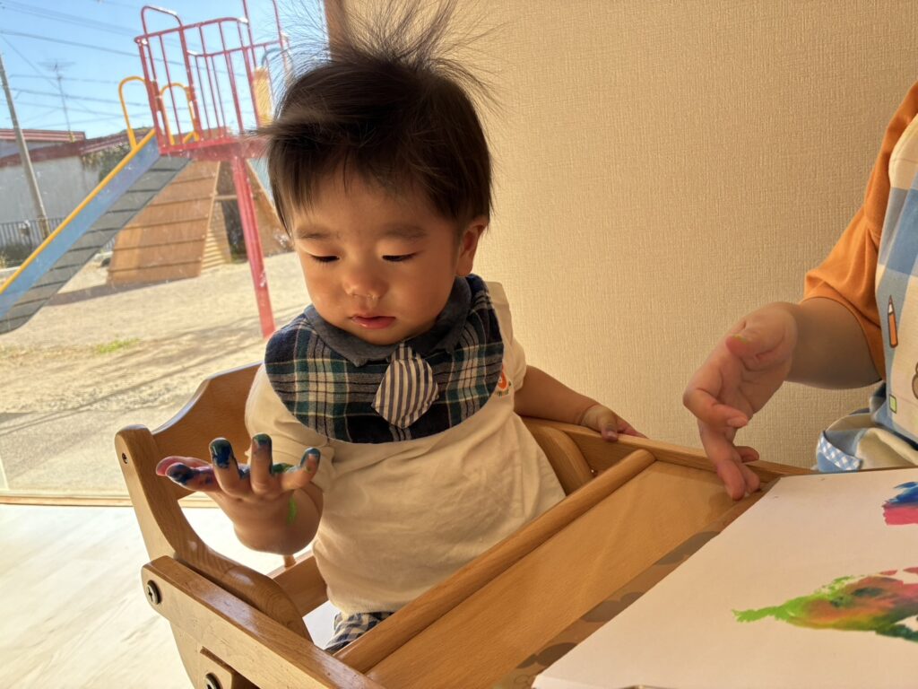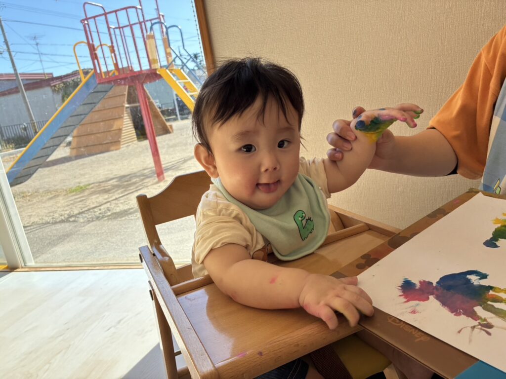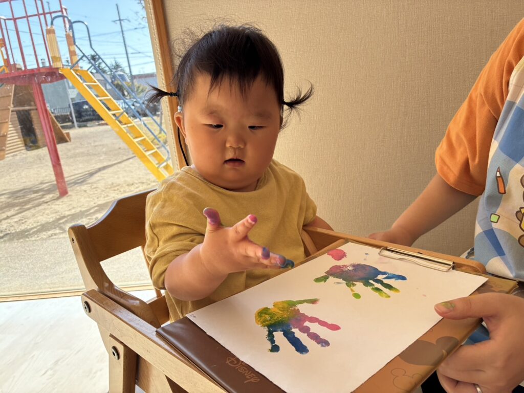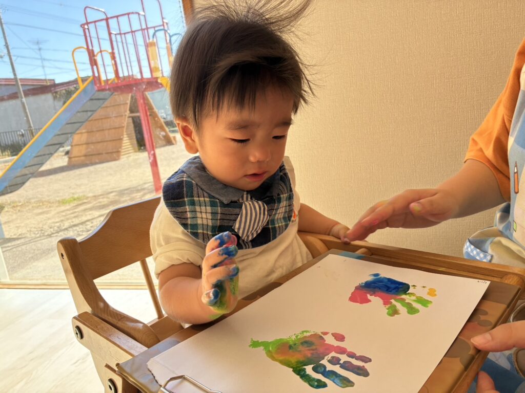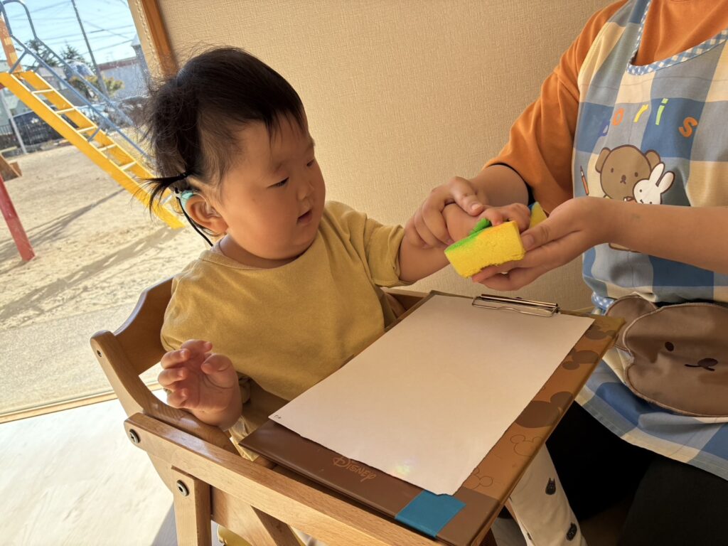 今日はハロウィンの製作をしました🎃スポンジに絵の具をつけ、みんなの手のひらにくっつけると、不思議そうに見つめたり、出てきた手形を見て喜んでいましたよ🥰完成した作品は、10月25日はぴあで行われるハロウィンのイベントに飾りますので、ぜひ見て見てください😆🎶