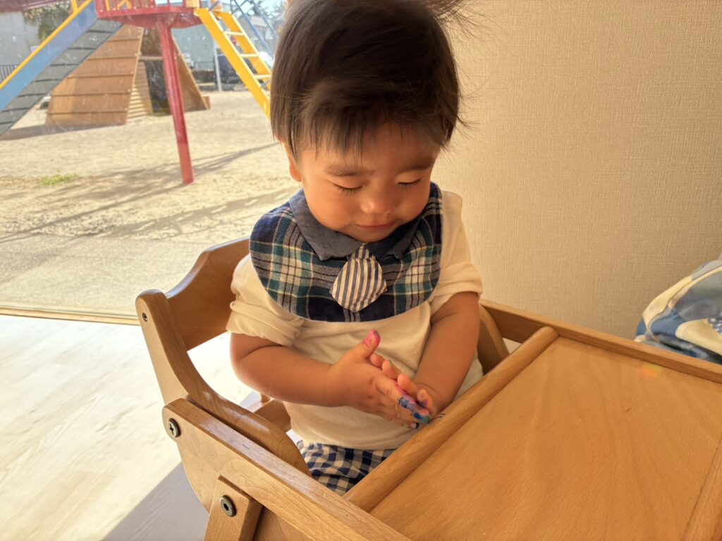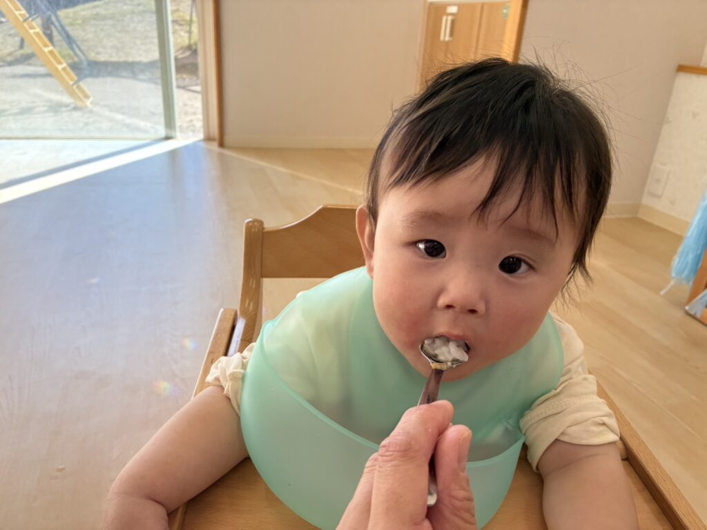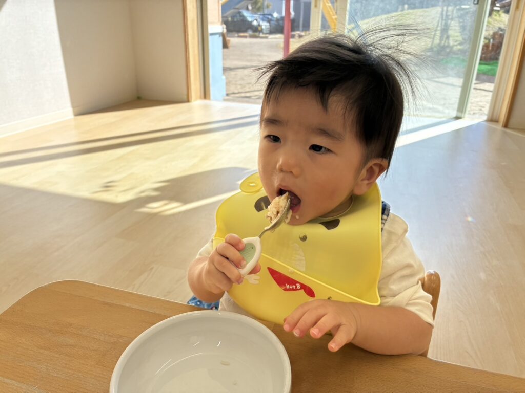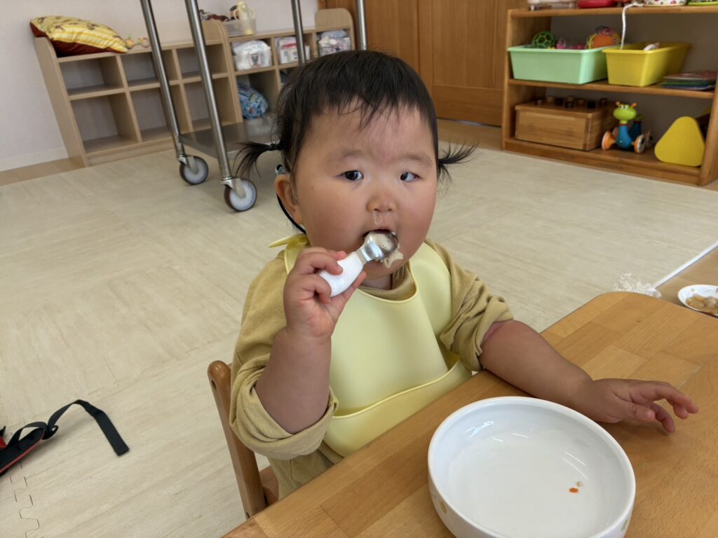 製作やお散歩の後はみんな大好き給食🍚自分でスプーンを持って上手にお口まで運べるようになってきました😄✨