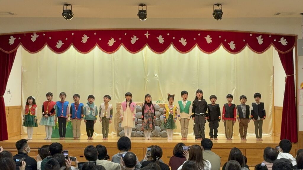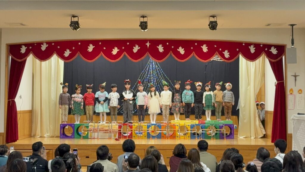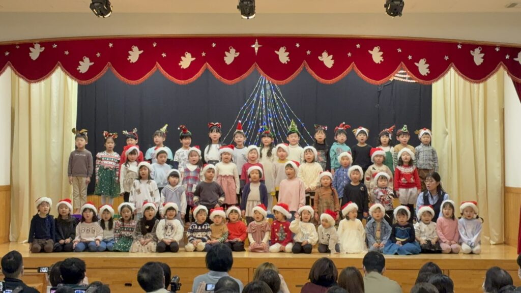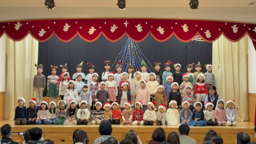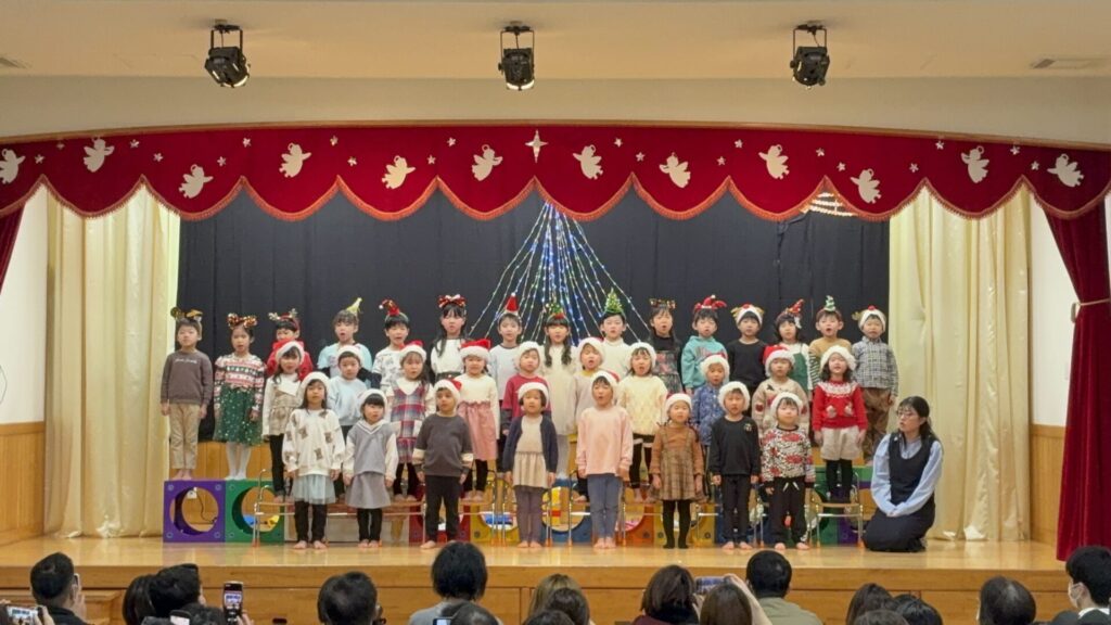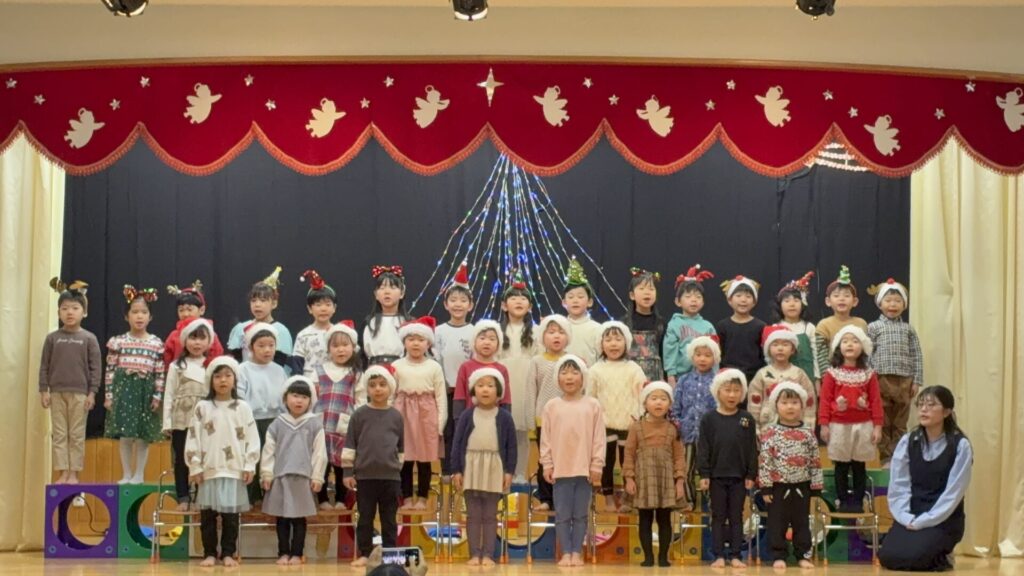 本日はお忙しいなか、クリスマス会にいらしていただきありがとうございました。子ども達は緊張しながらも、ワクワク楽しそうな表情を見せていました。頑張った子ども達に感動した方も多かったのではないでしょうか?保護者の方々の拍手や笑顔が、子ども達の励みになったことと思います。