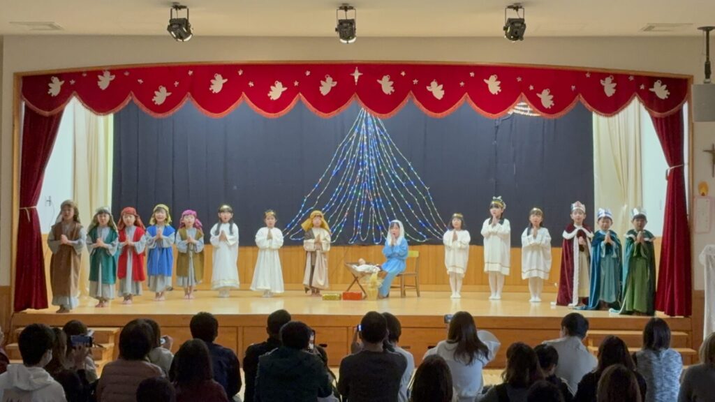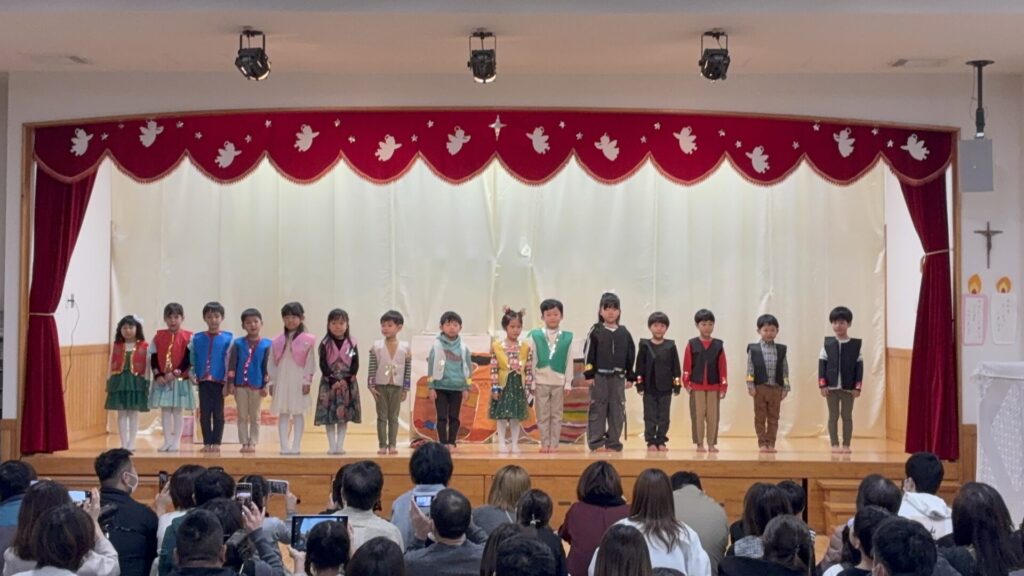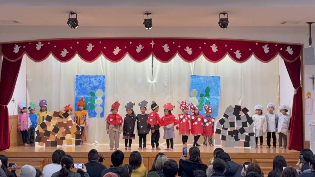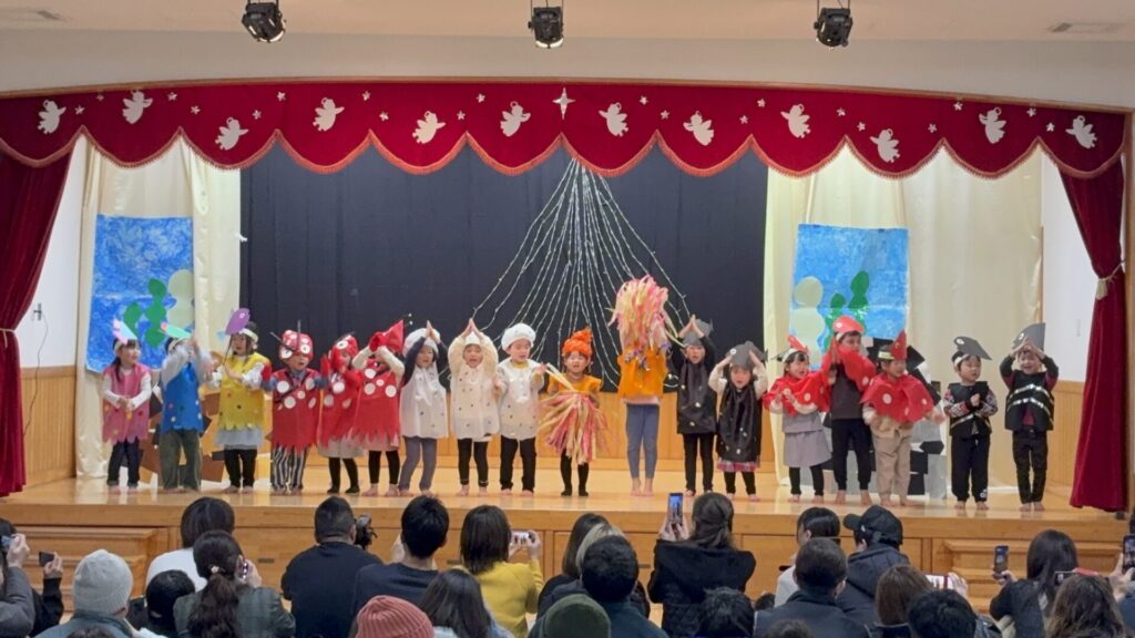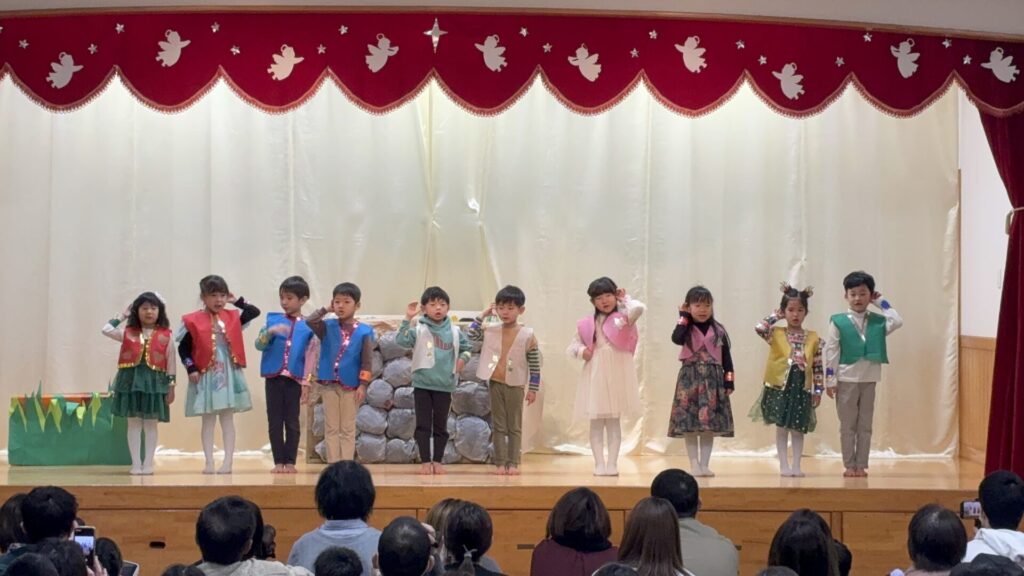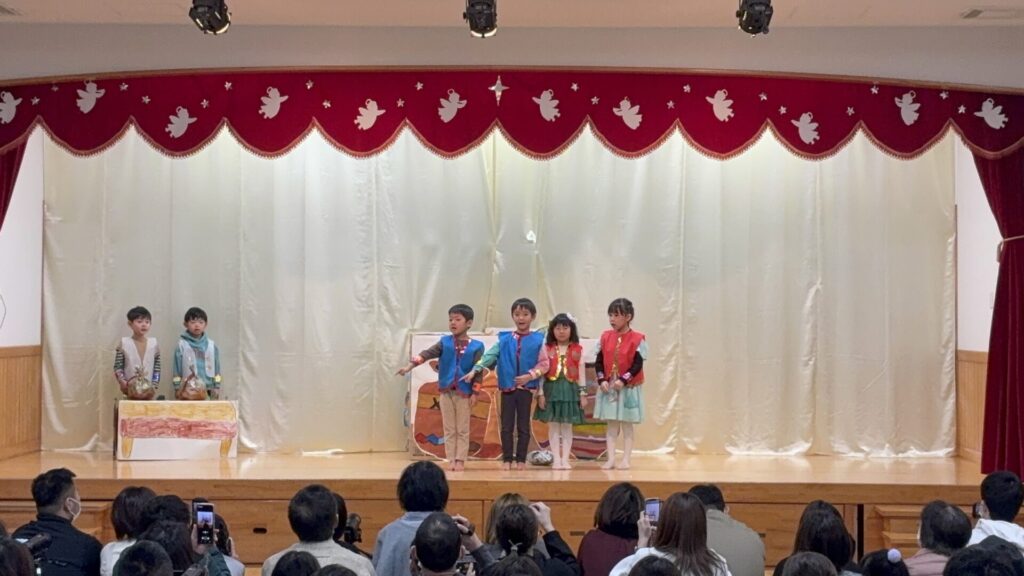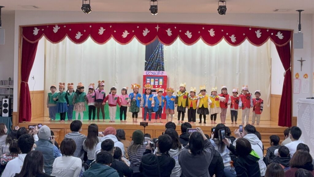 本日はお忙しいなか、クリスマス会にいらしていただきありがとうございました。子ども達は緊張しながらも、ワクワク楽しそうな表情を見せていました。頑張った子ども達に感動した方も多かったのではないでしょうか?保護者の方々の拍手や笑顔が、子ども達の励みになったことと思います。