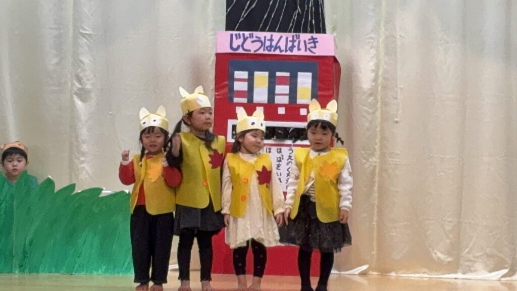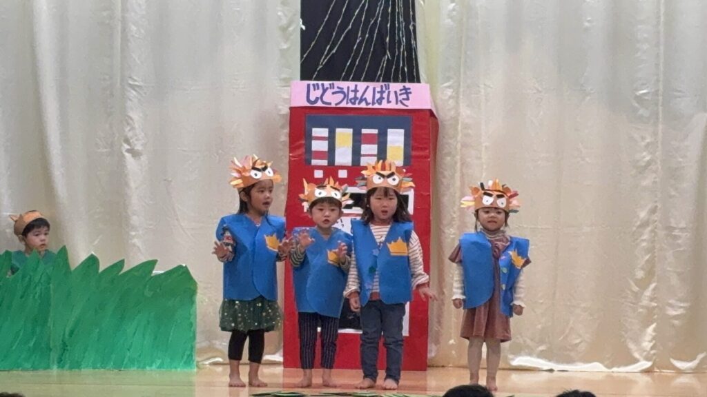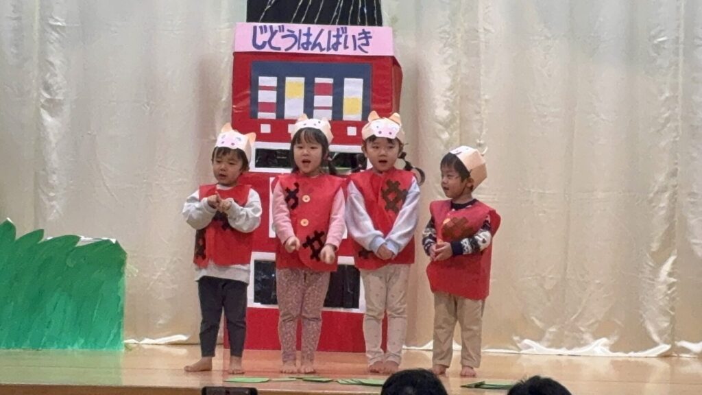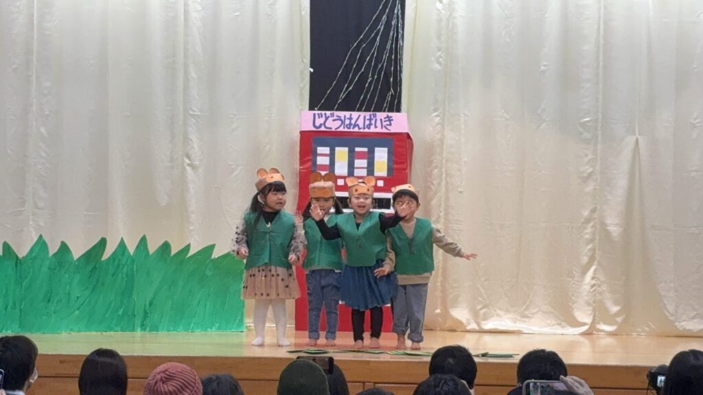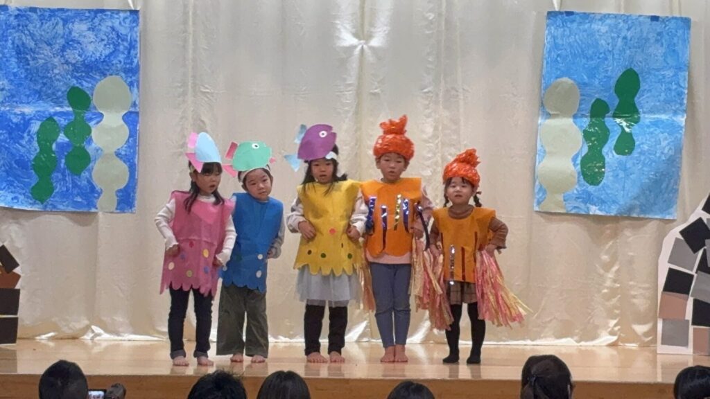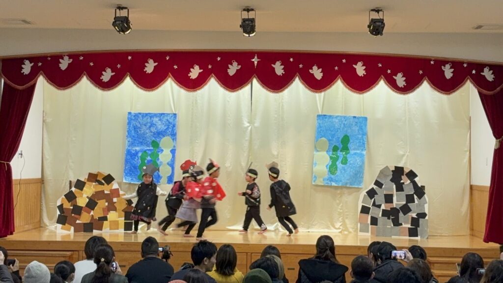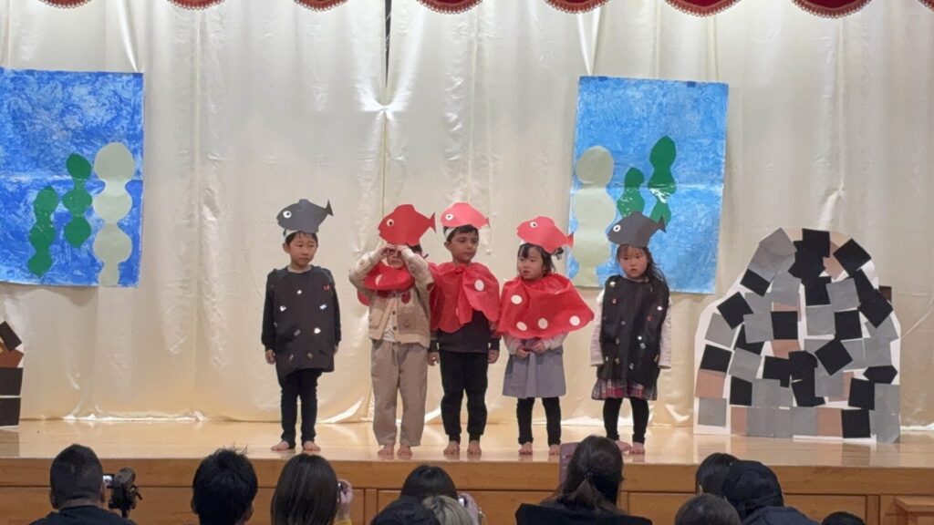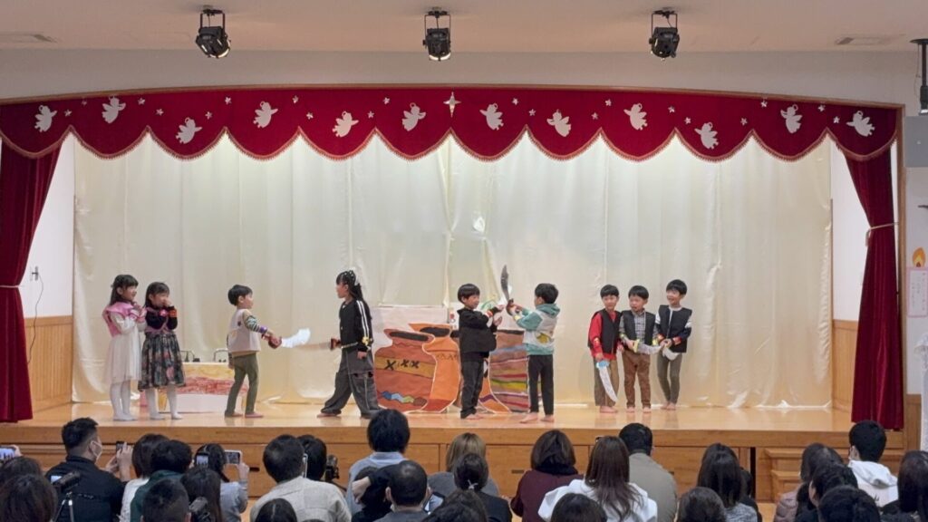 アリババの劇が上手に出来たことで自信が付き、緊張感がほぐれ、落ち着いて堂々と発表することができていました。お客様に分るようにゆっくりはっきり話す事を意識して頑張る姿が印象的でした。子ども達の頑張りが家族にも伝わり感動して下さる方もいました。子ども達も自分のお母さんが感動している姿に気付きとっても嬉しそうでした!