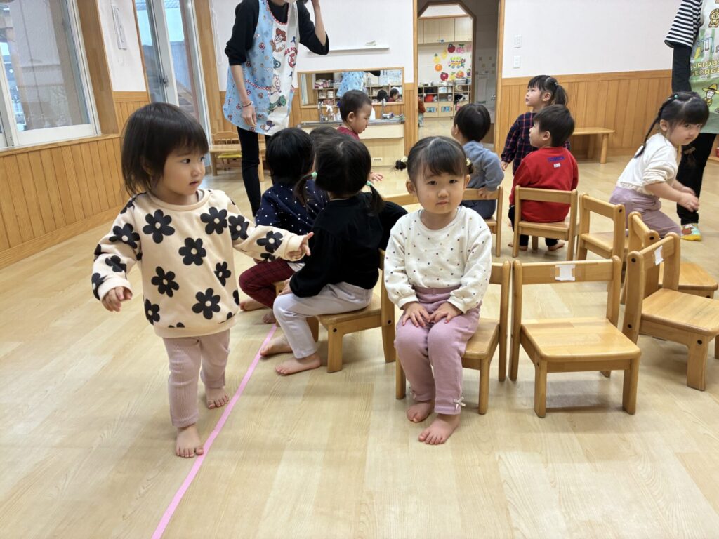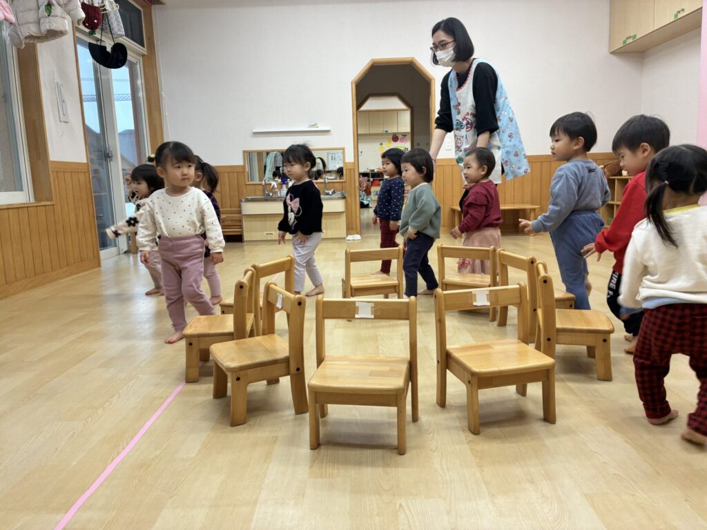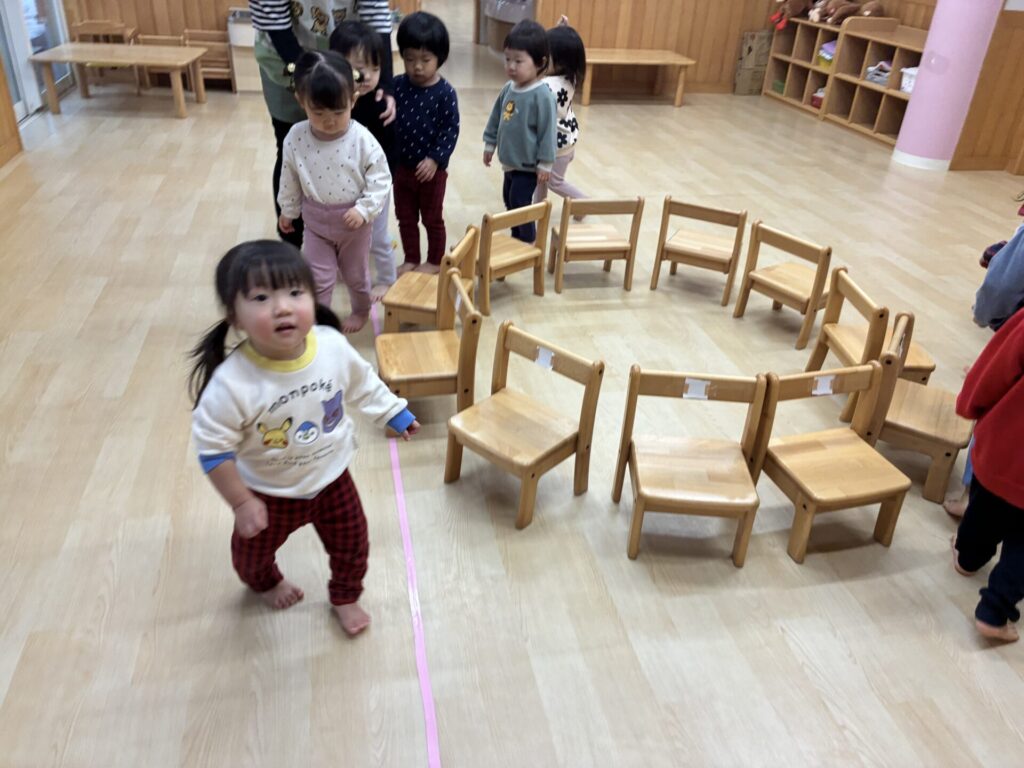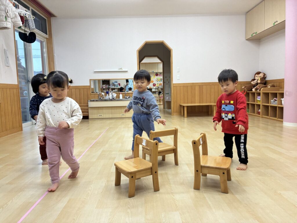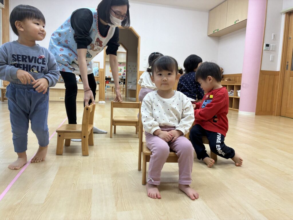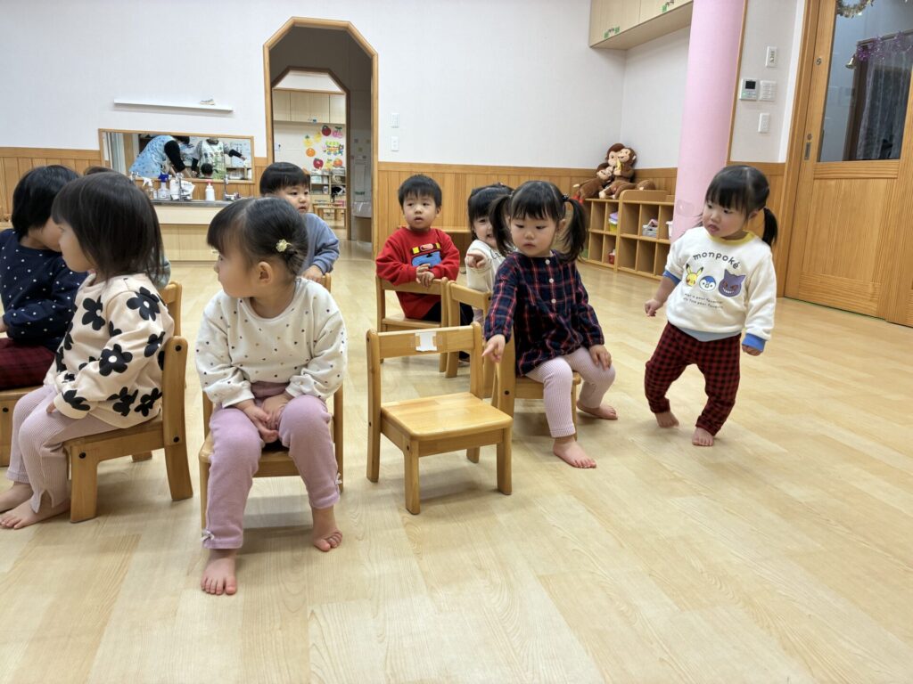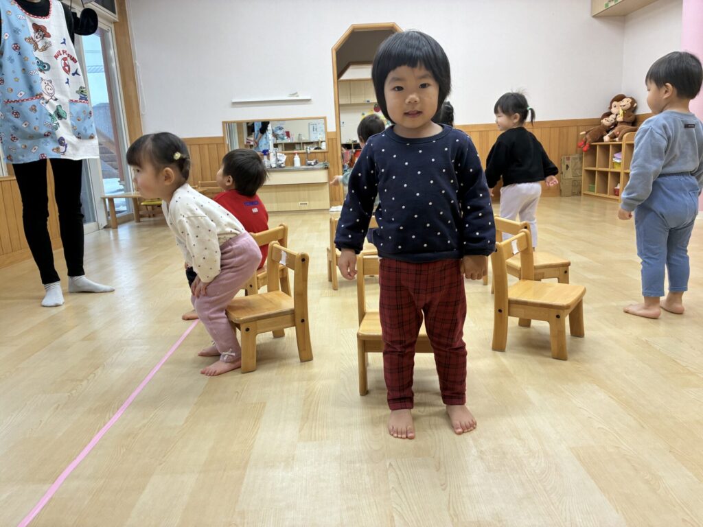 今日のクリームちゃんの活動です😊クリームちゃんはイス取りゲームをしました✨少しずつルールがわかり、自分からイスに座れる子が増えてきました🎶負けてしまい、悔し泣きをする子もいます😭集団遊びの楽しさを少しずつ味わって行こうと思います✨
