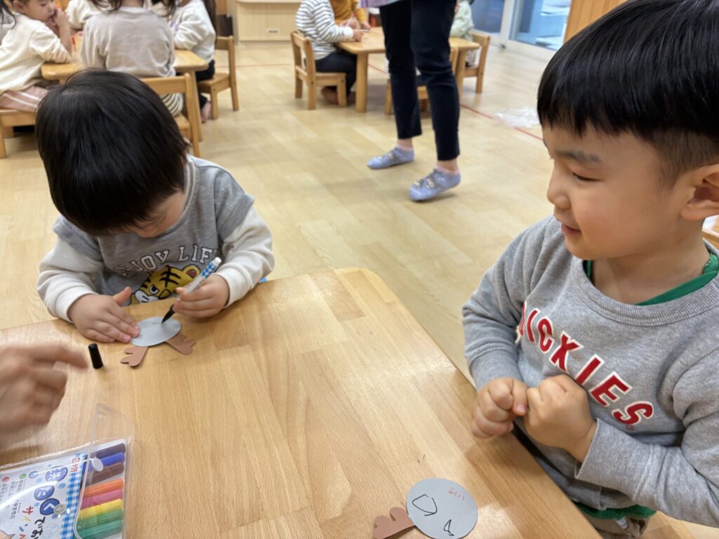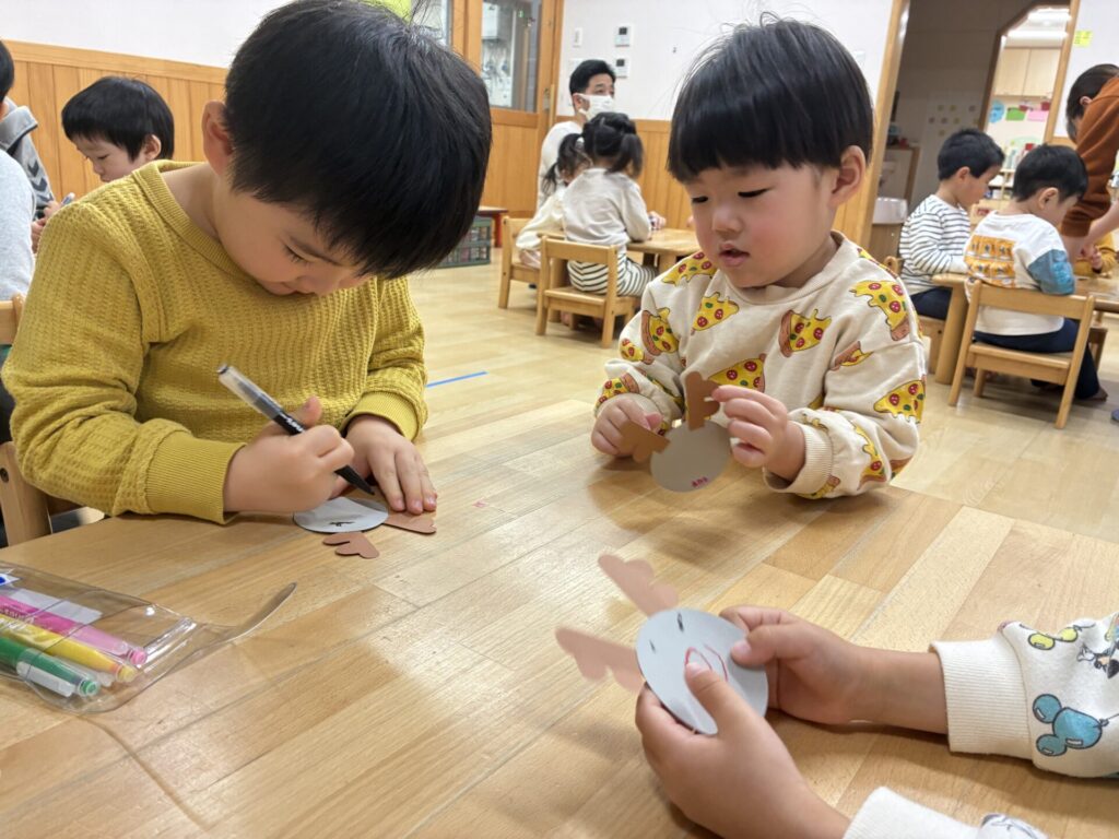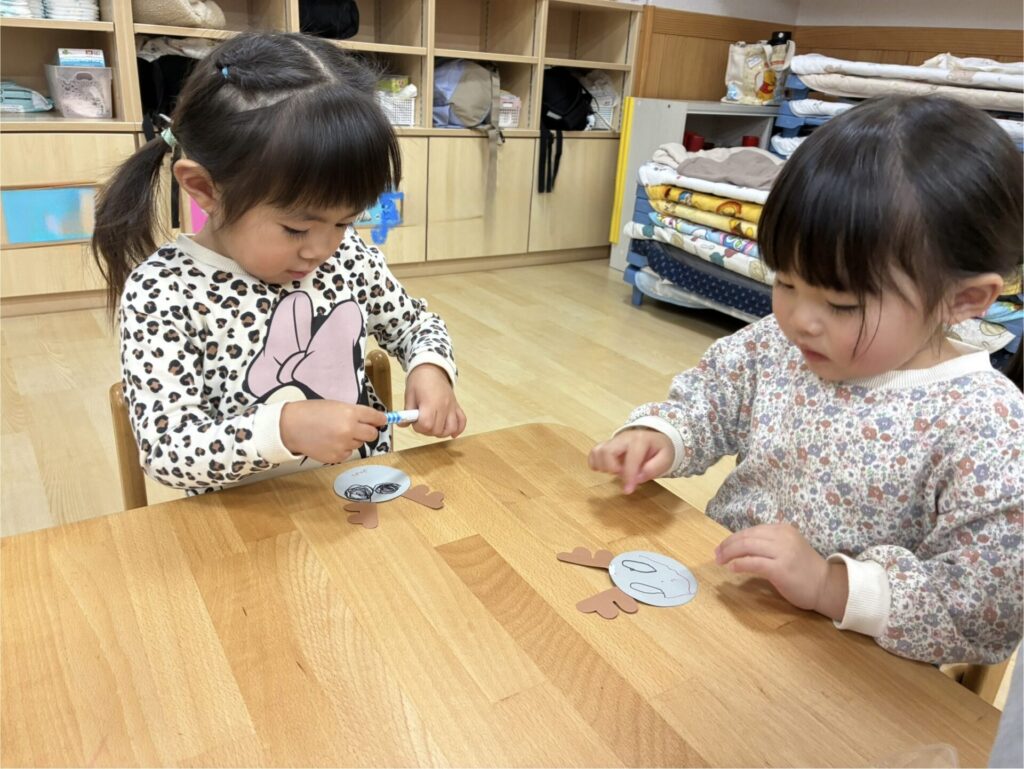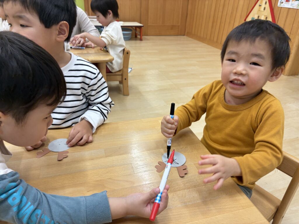 チョコちゃんは、クリスマスに向けて製作をしました✨サンタさんや、トナカイ、雪だるまを作っています😊「サンタさんに○○もらうんだぁ🥰」「いつサンタさんくるの?」などと、お友だち同士可愛らしい会話をしながら参加していましたよ🥰クリスマスが待ち遠しいですね😆🎶