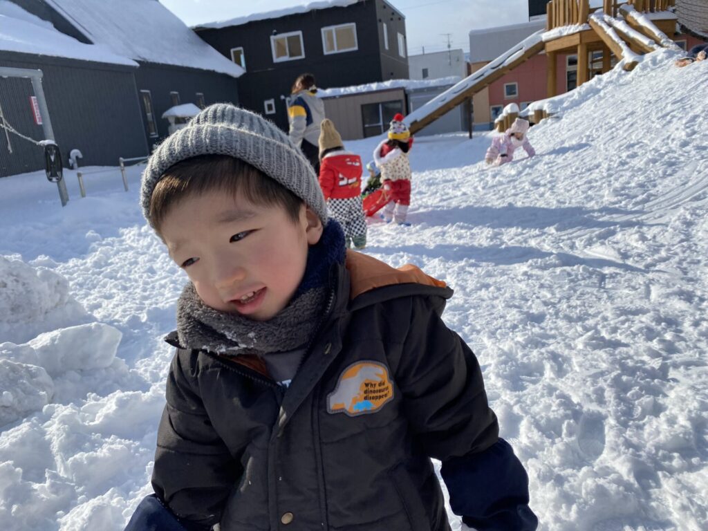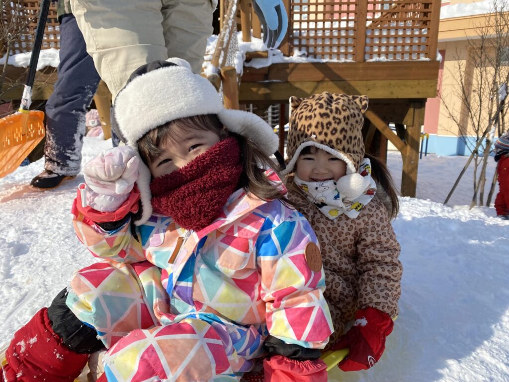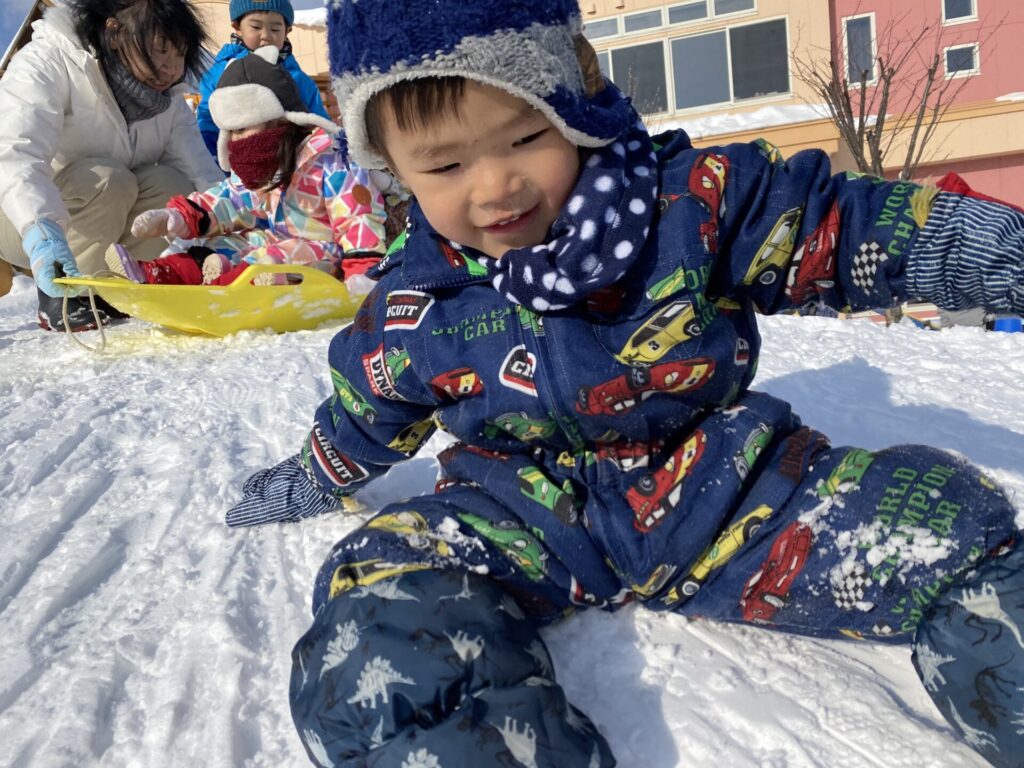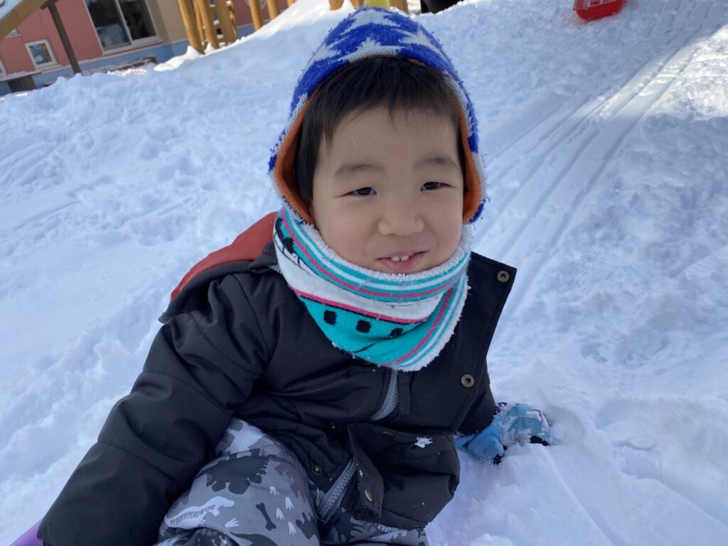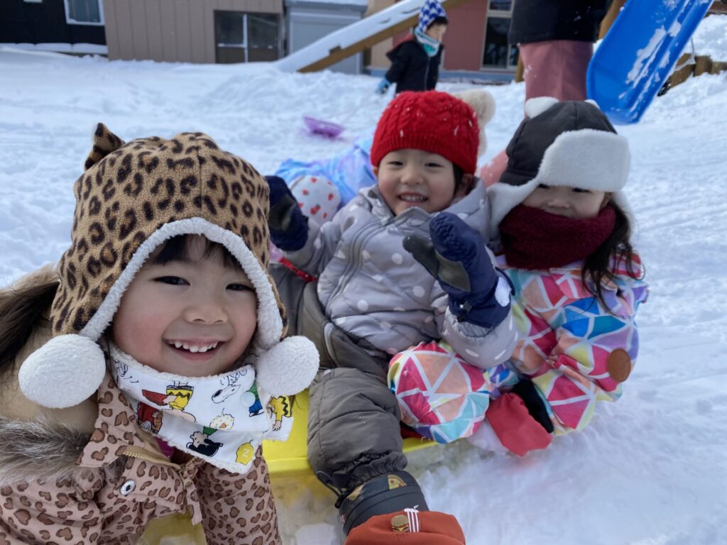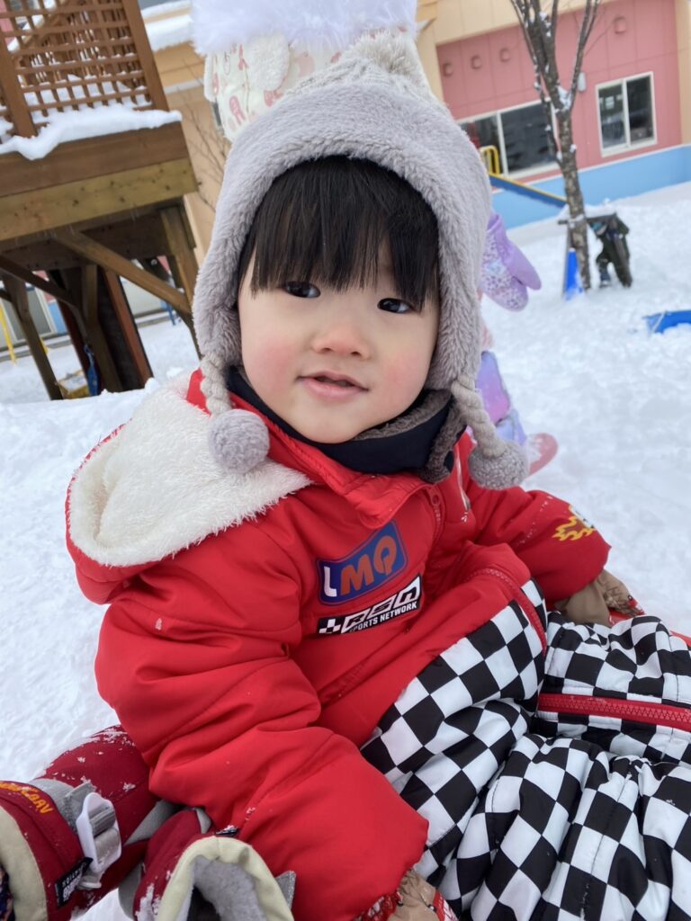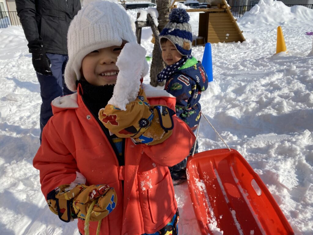 チョコさんは、雪遊びをしました😊今日は、暖かかったのでみんな元気に遊んでいます✨ソリ滑りや雪玉を作りたくさん遊びました‼️