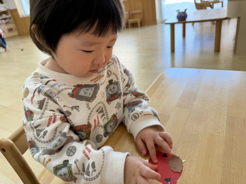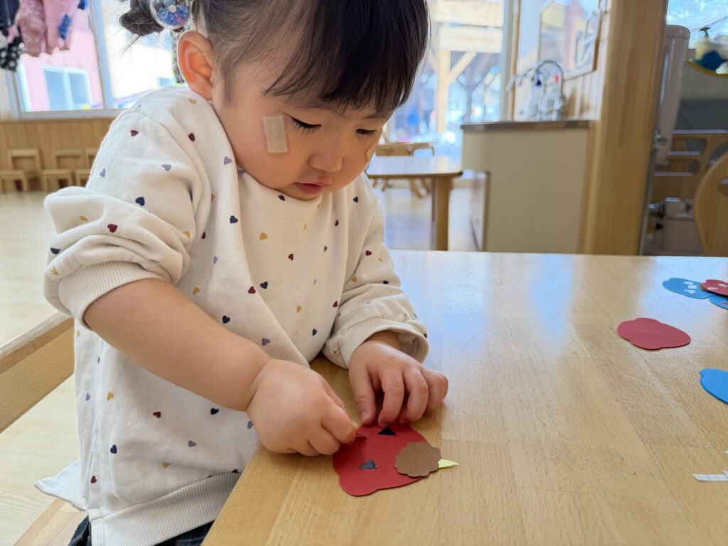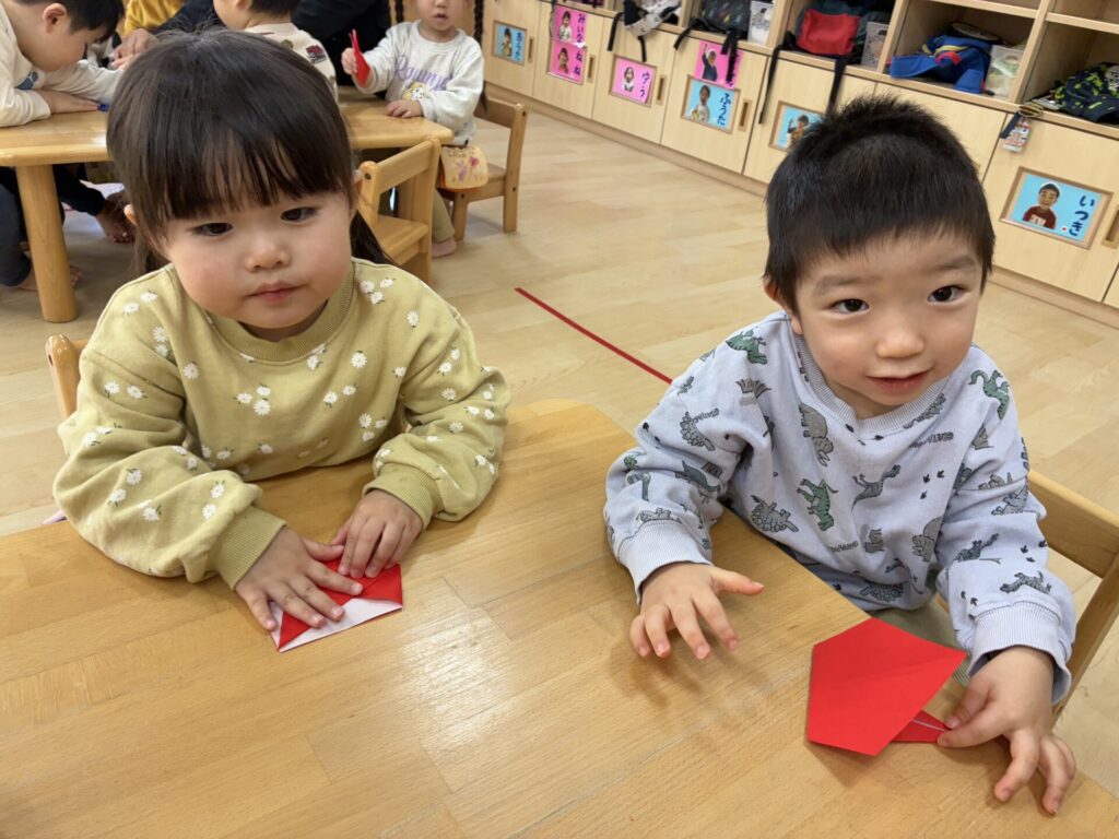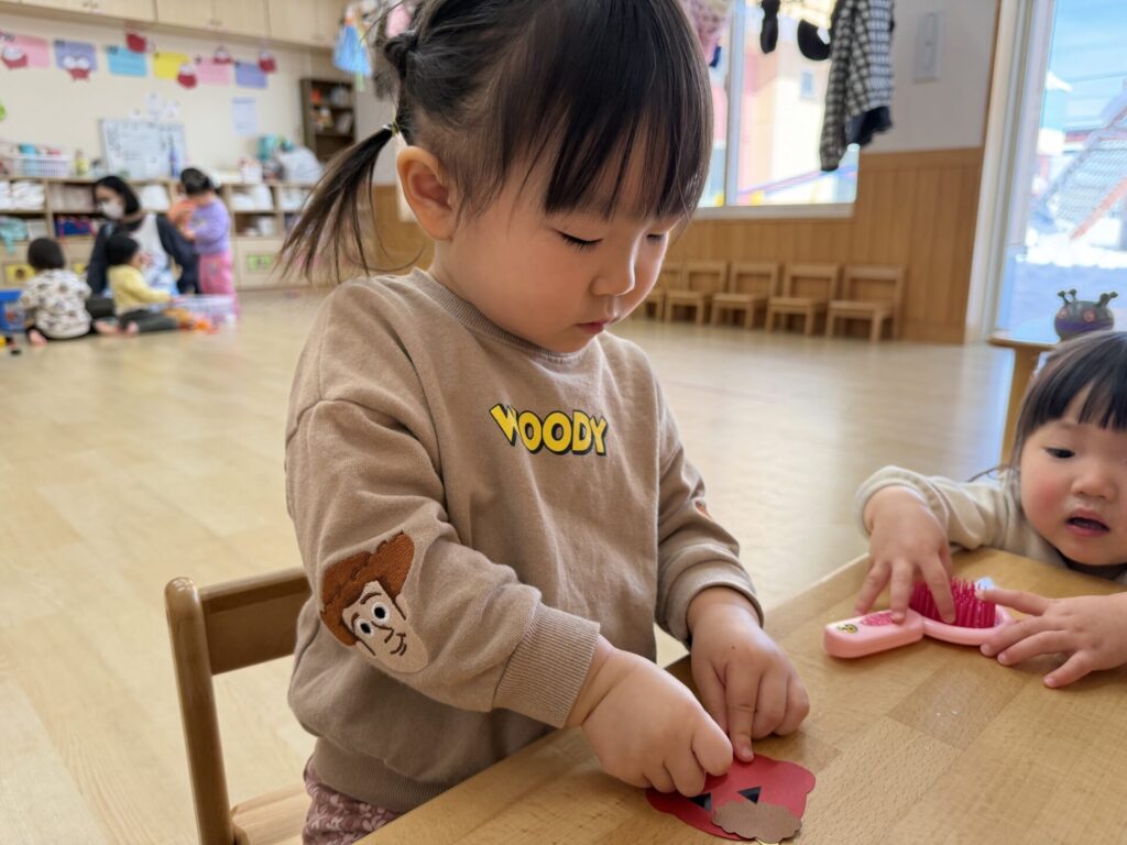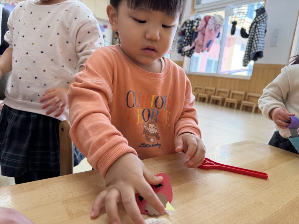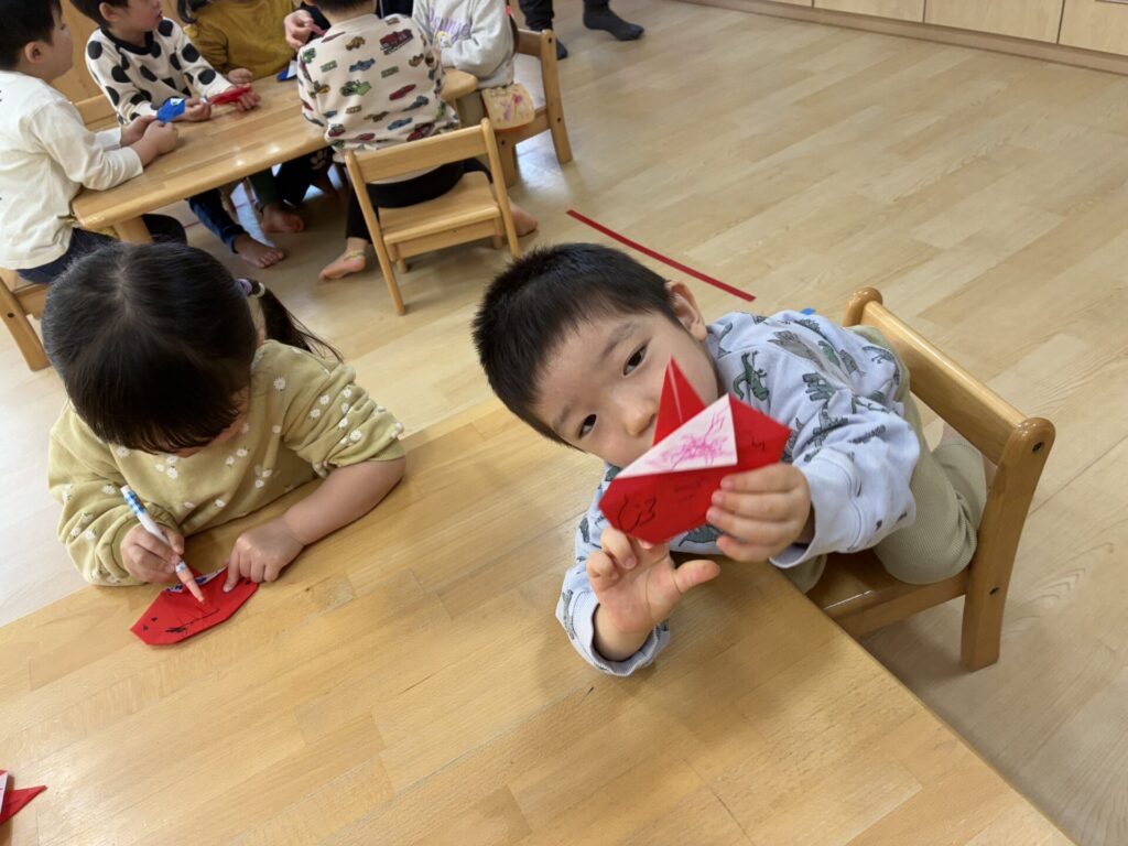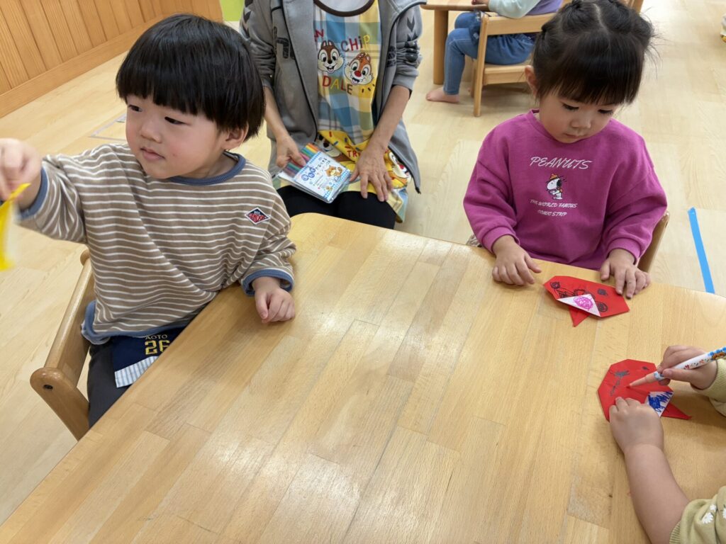 チョコちゃんです😆チョコちゃんも節分に向けて製作をしました😆先生の説明を聞きながら、頑張って折っていましたよ🥰チョコちゃんの鬼の顔も、それぞれ個性あふれる可愛い顔をしていました✨