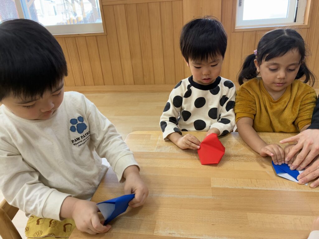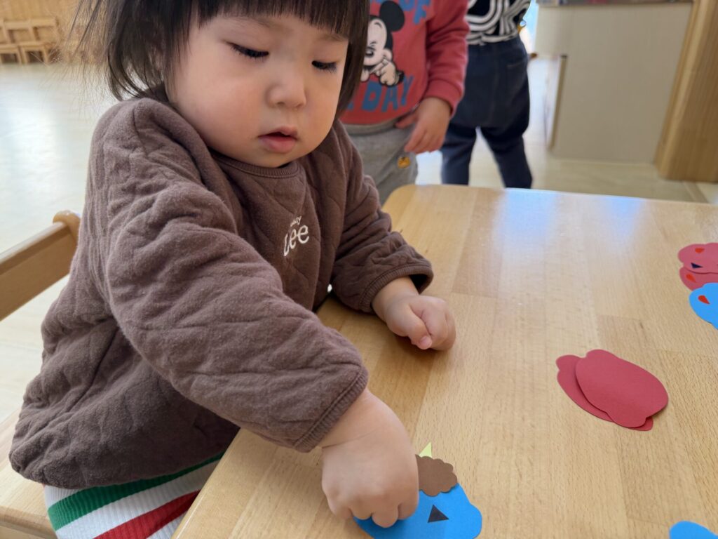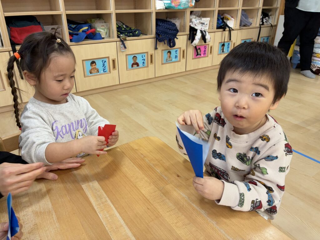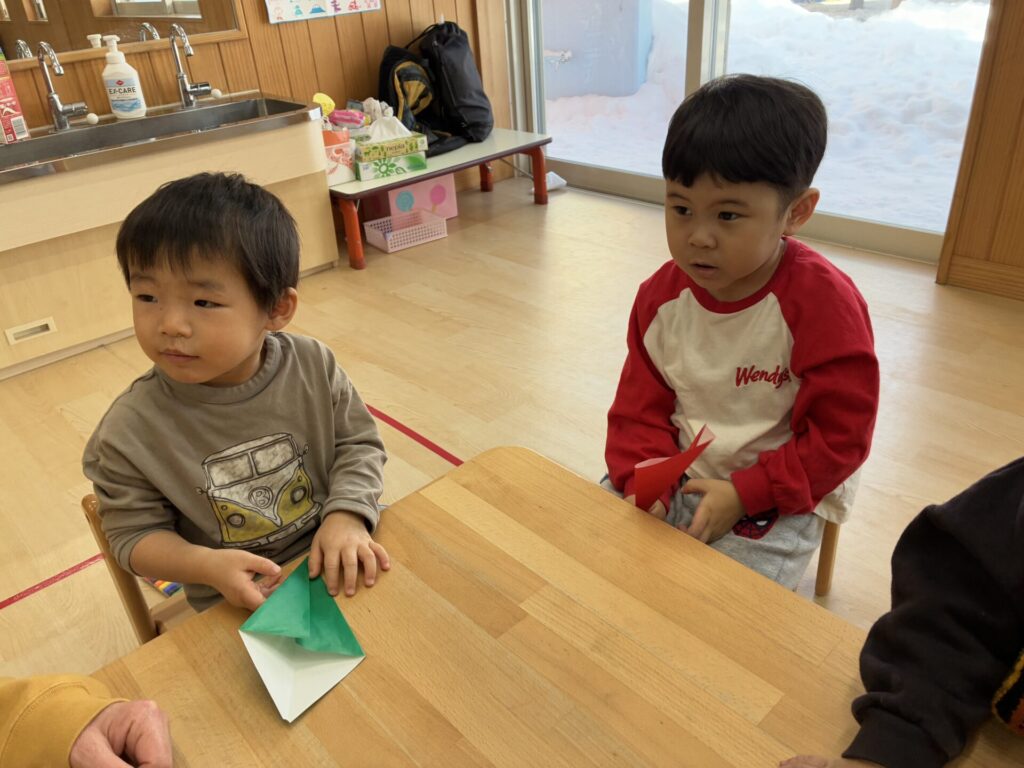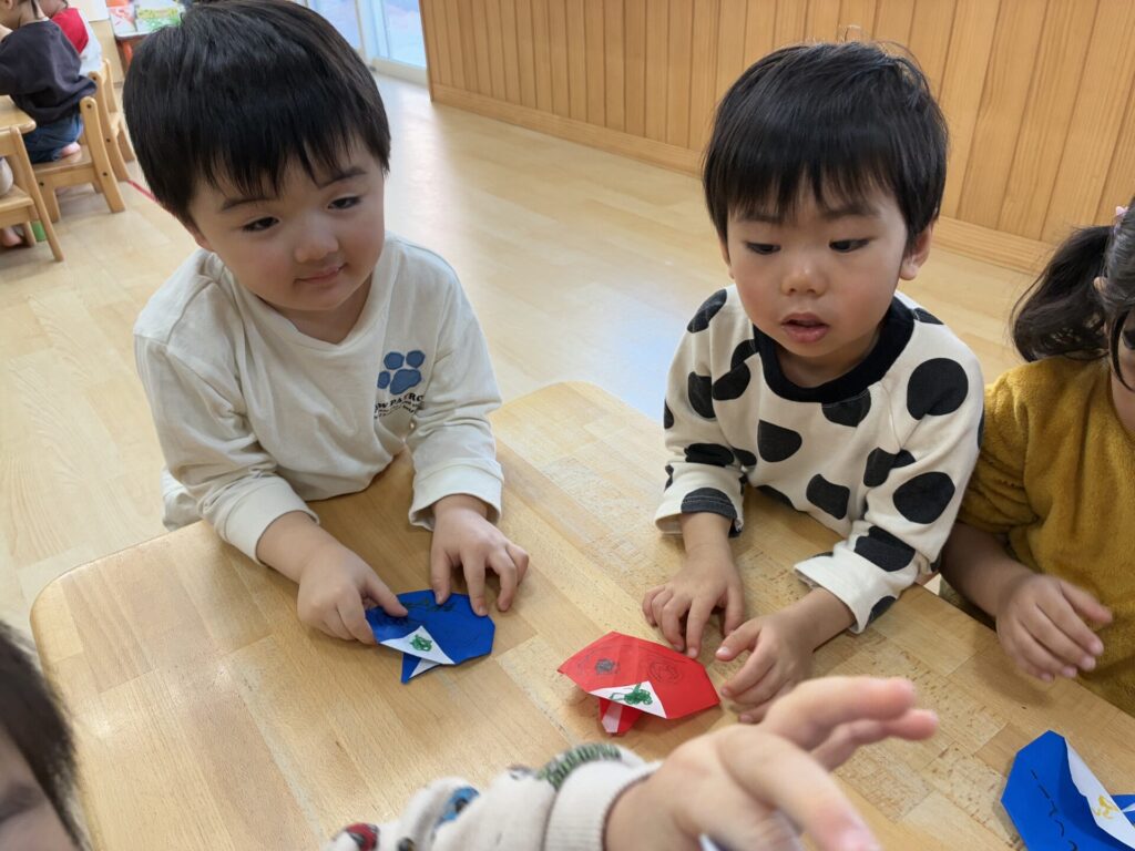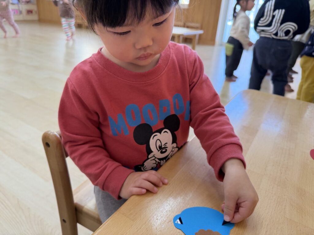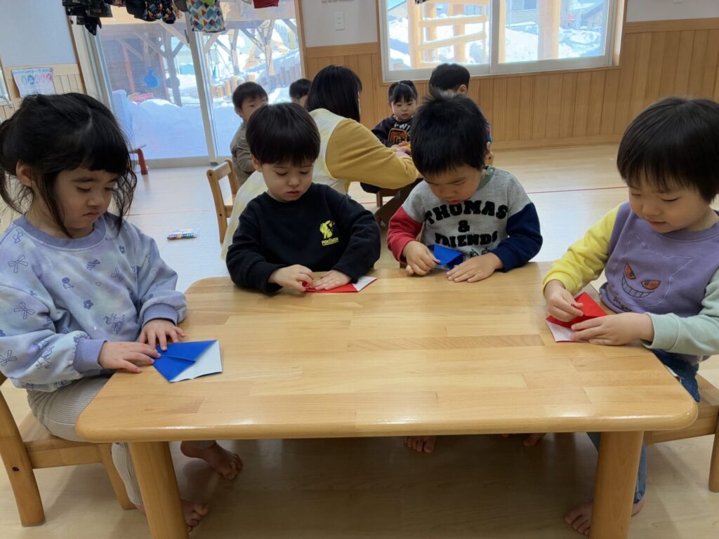 チョコちゃんです😆チョコちゃんも節分に向けて製作をしました😆先生の説明を聞きながら、頑張って折っていましたよ🥰チョコちゃんの鬼の顔も、それぞれ個性あふれる可愛い顔をしていました✨