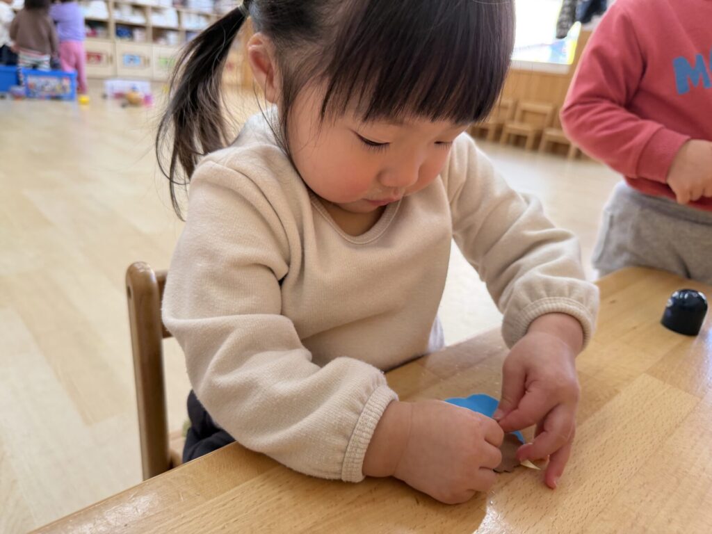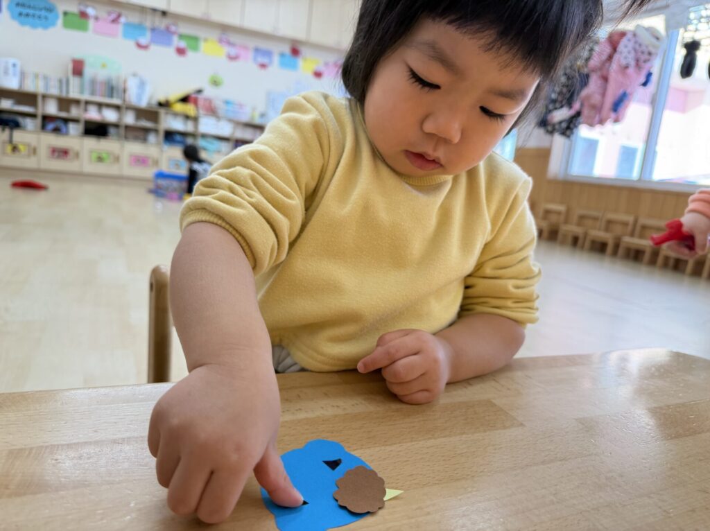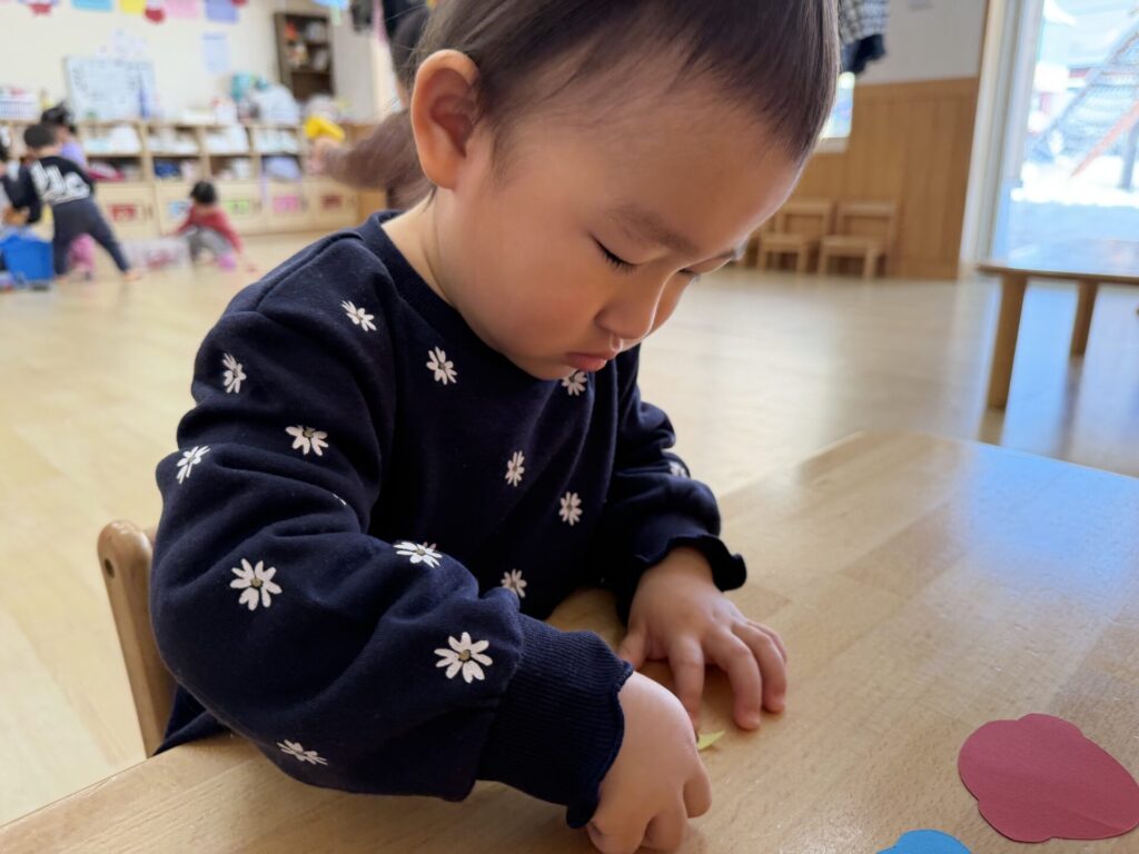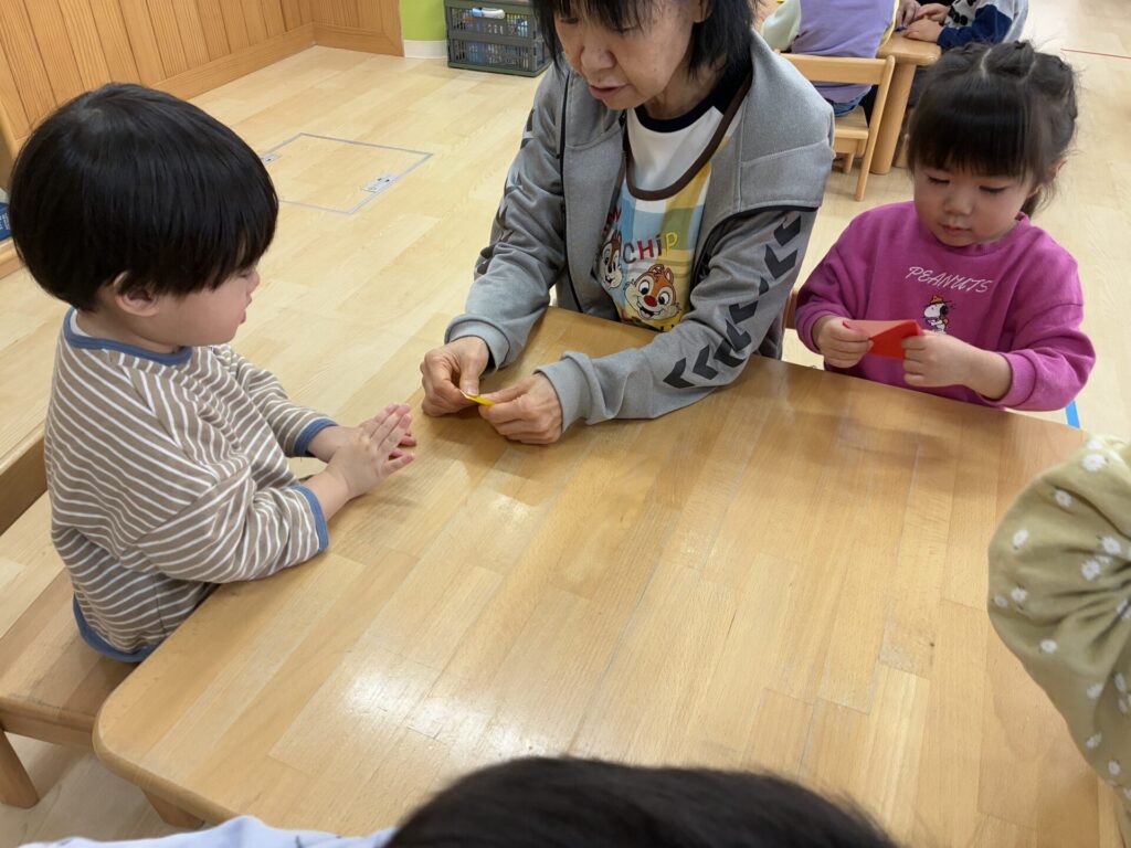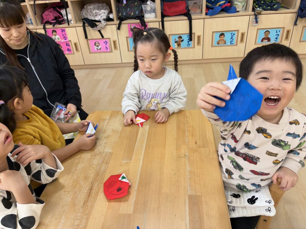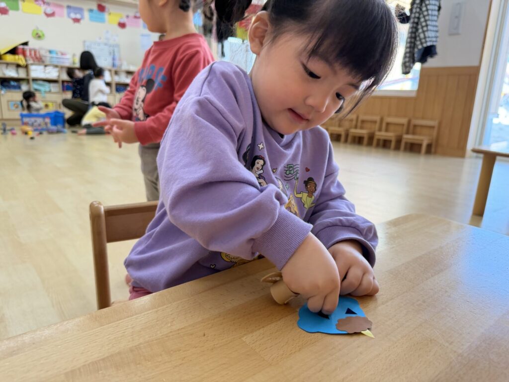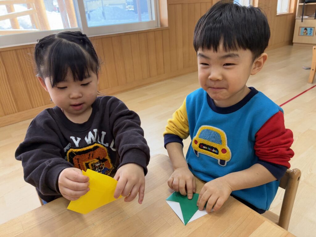 チョコちゃんです😆チョコちゃんも節分に向けて製作をしました😆先生の説明を聞きながら、頑張って折っていましたよ🥰チョコちゃんの鬼の顔も、それぞれ個性あふれる可愛い顔をしていました✨