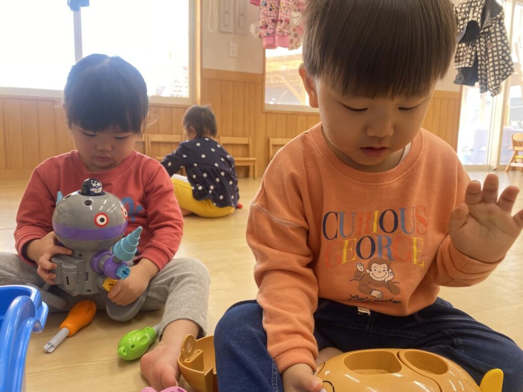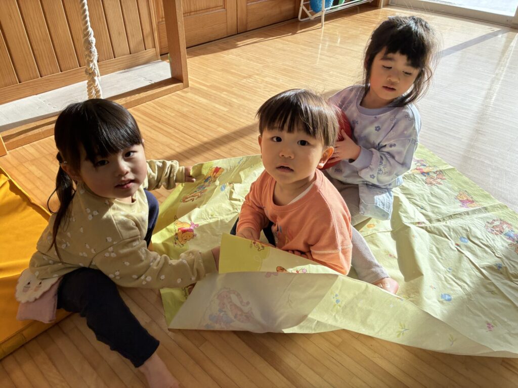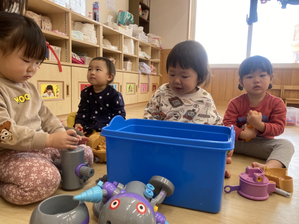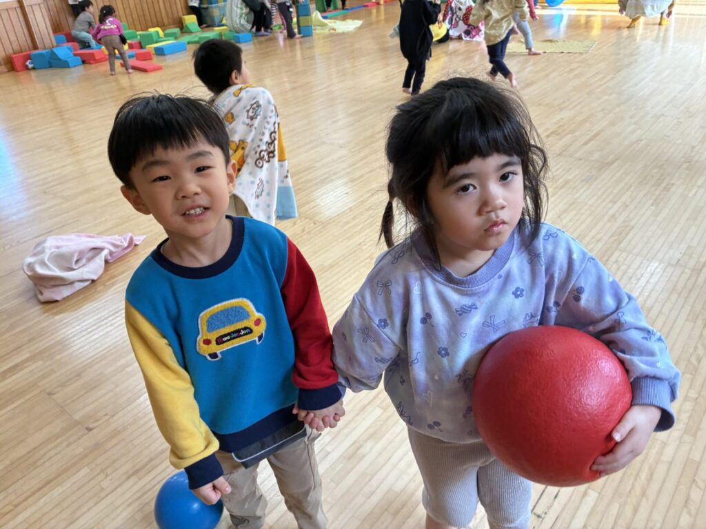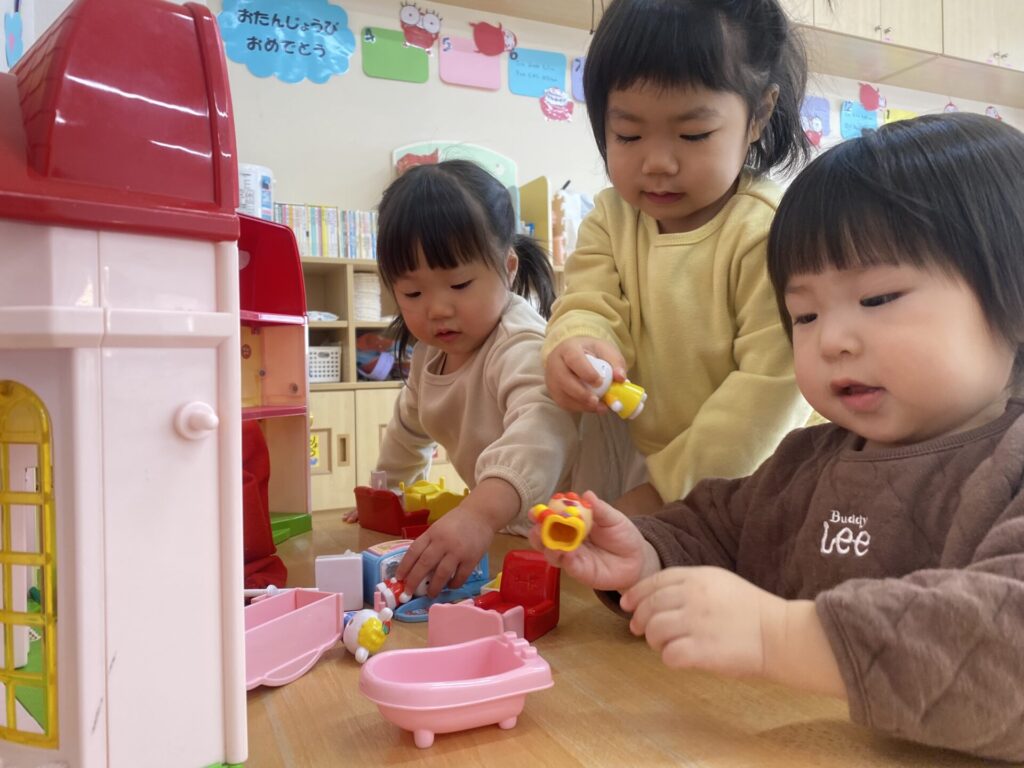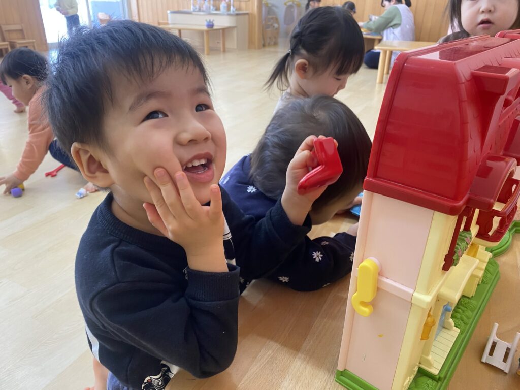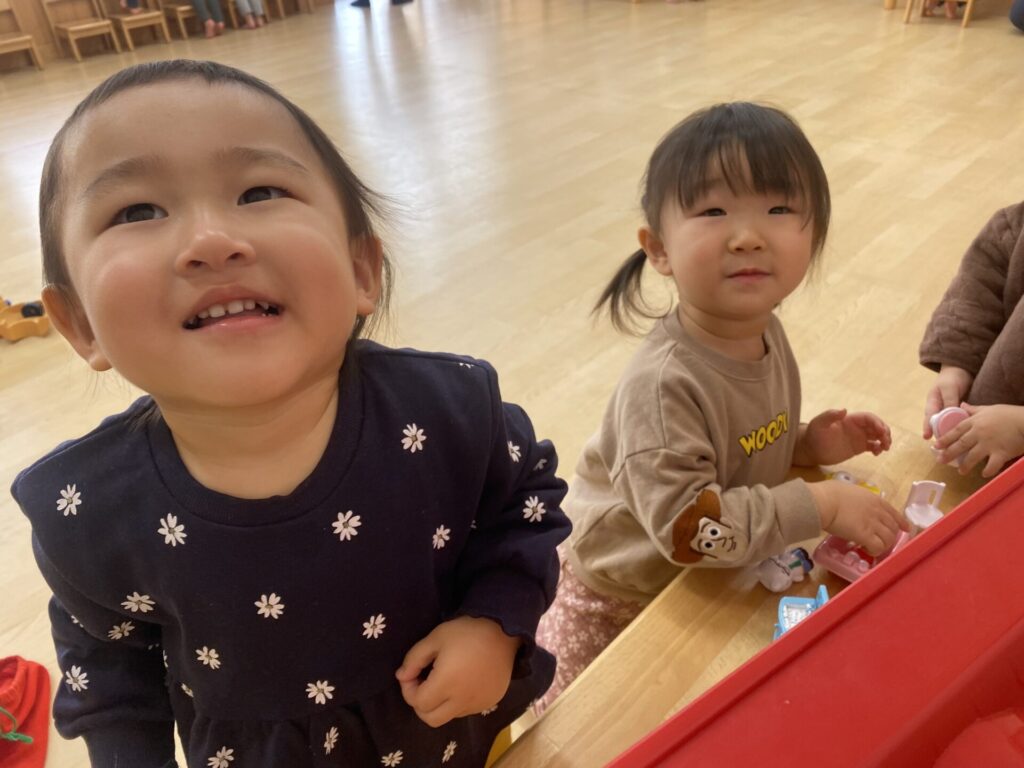 朝のホール遊びの様子です😊チョコちゃん、クリームちゃん、ひよこちゃん一緒に遊んでいます😊チョコちゃんが、小さいお友だちに優しくお世話をする様子も多く見られるようになってきました✨