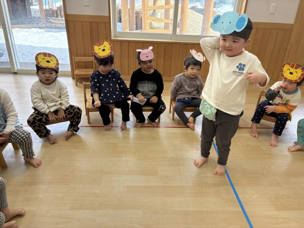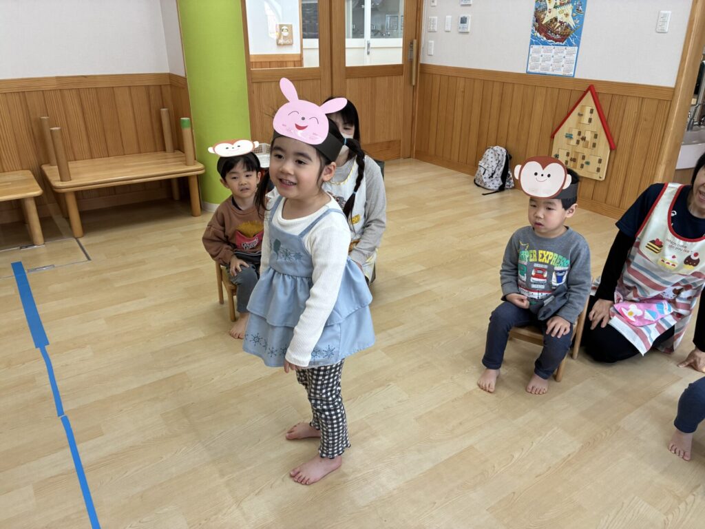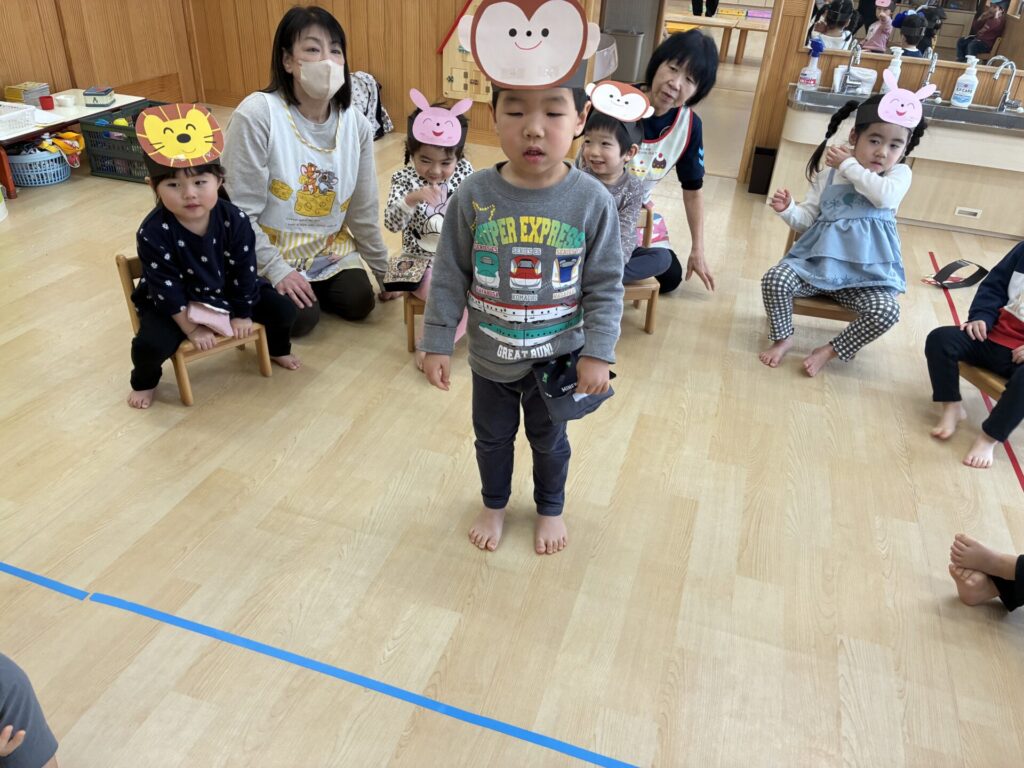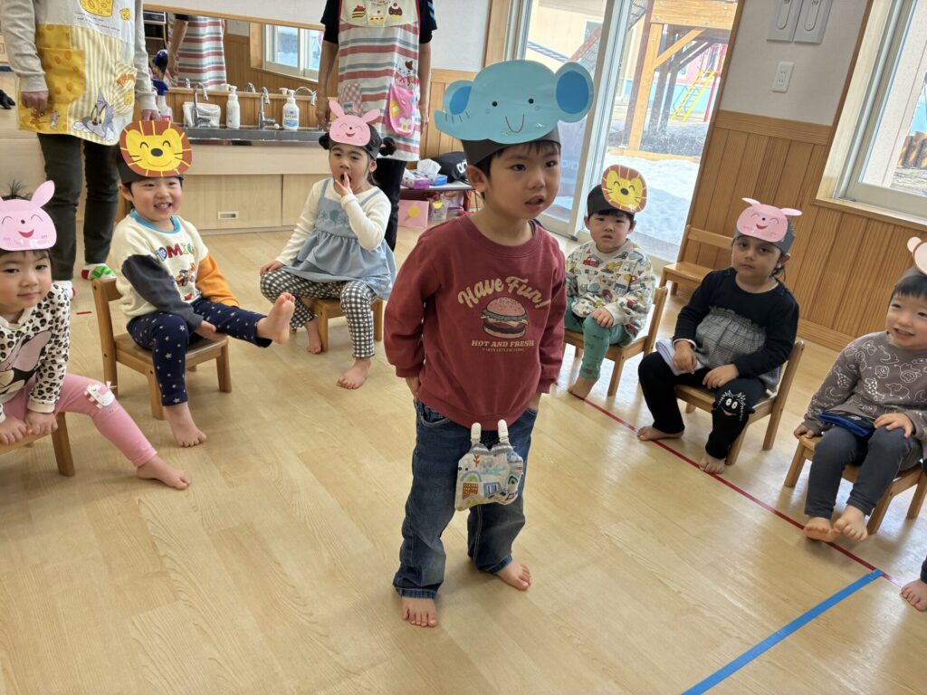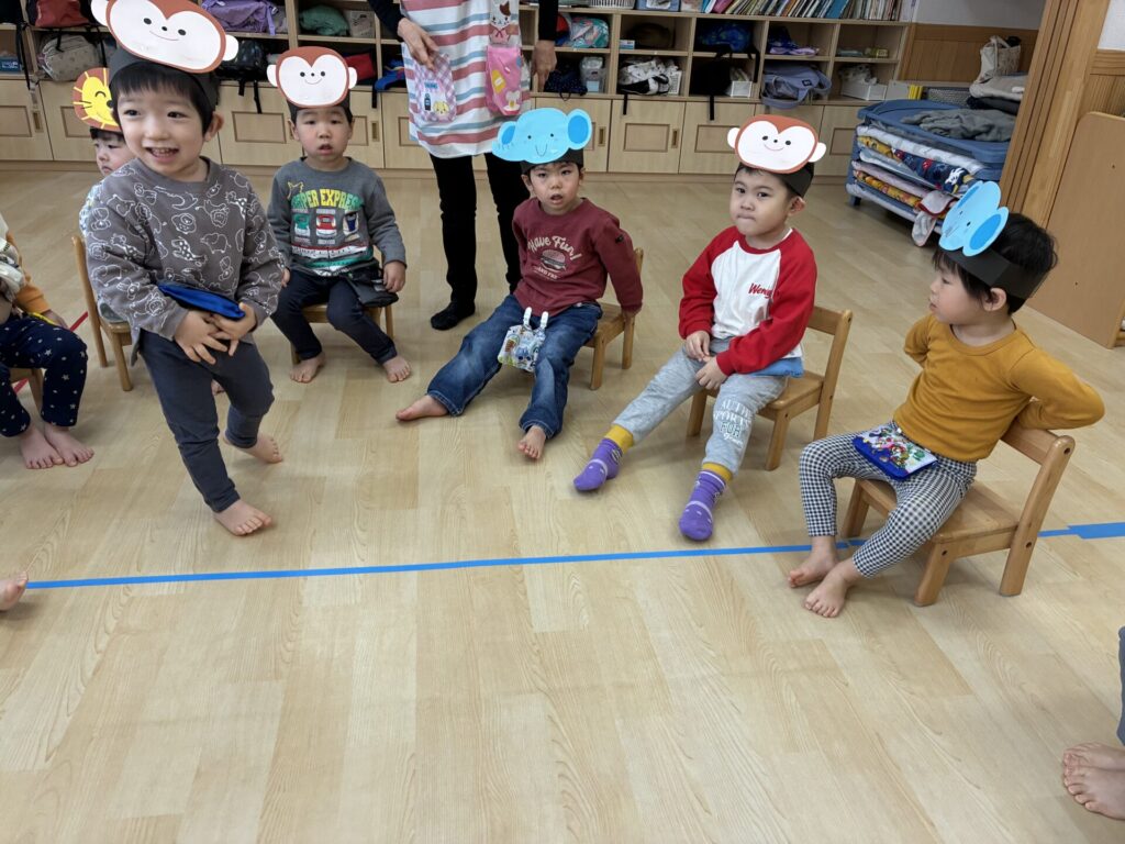 チョコちゃんはクリームちゃんと一緒に英語に参加し子どもたちも、「アップ!サイド!ダウン!」と言いながら楽しんで参加していました‼️その後は、お部屋で動物のお面を付けて『フルーツバスケット』をしました😊久しぶりでルールを忘れていた子もいましたが、最後はみんな楽しんでゲームに参加していた子どもたちです✨