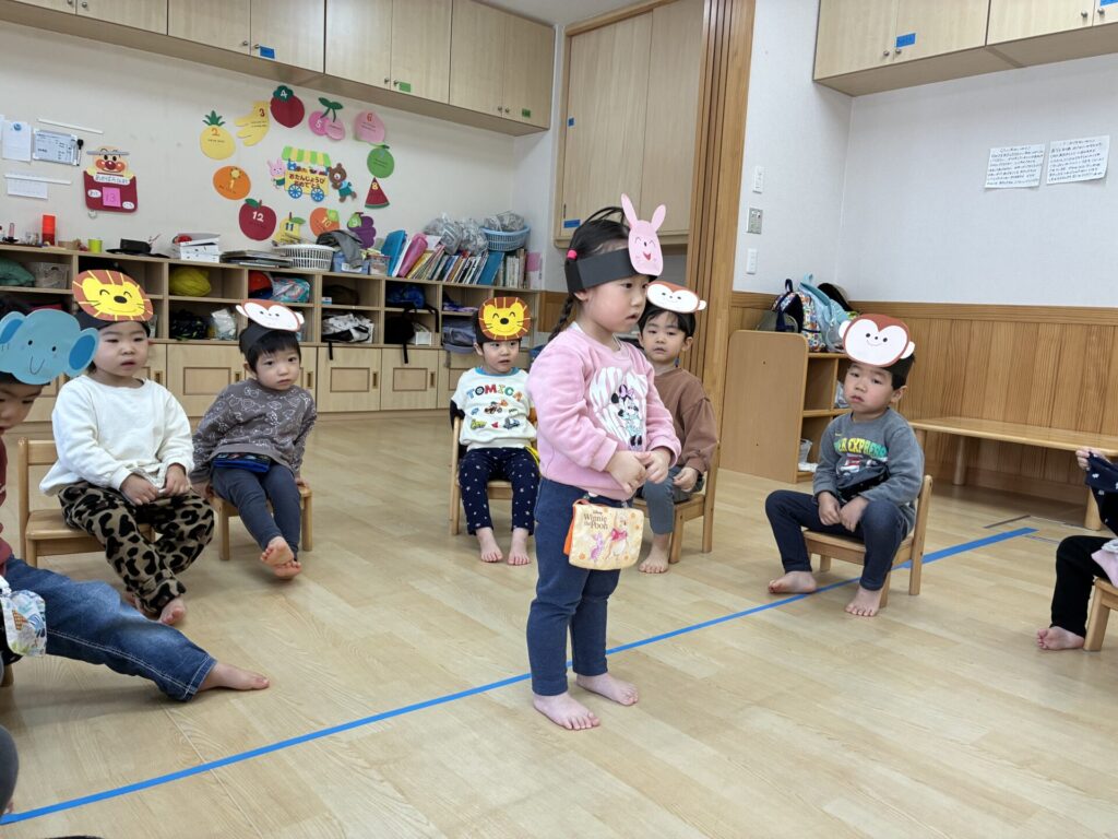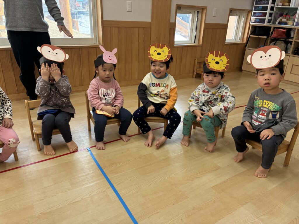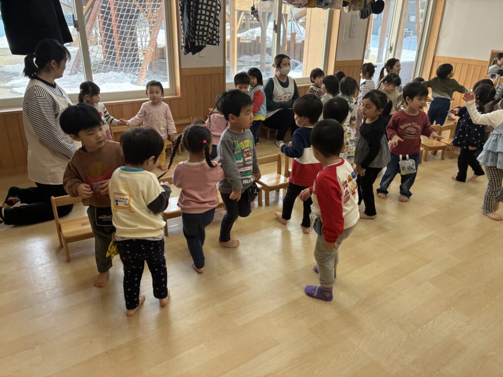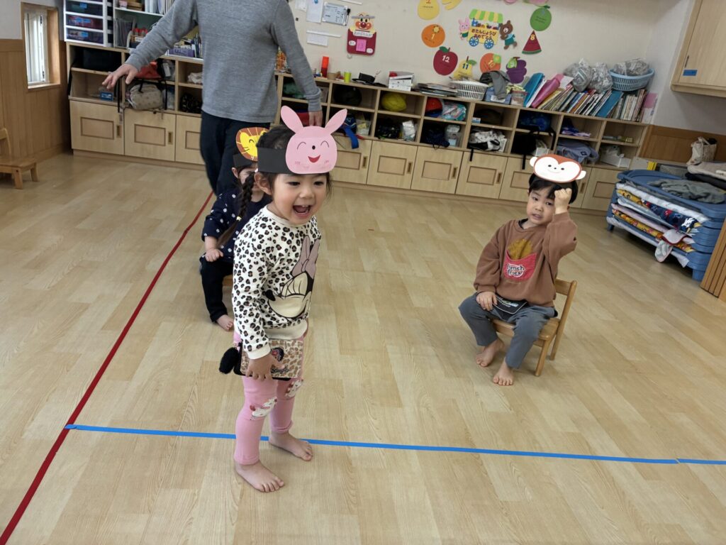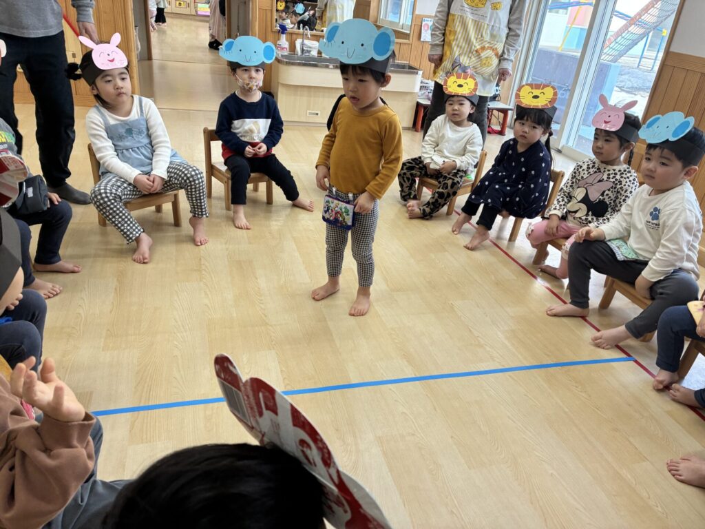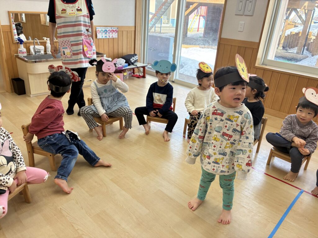 チョコちゃんはクリームちゃんと一緒に英語に参加し子どもたちも、「アップ!サイド!ダウン!」と言いながら楽しんで参加していました‼️その後は、お部屋で動物のお面を付けて『フルーツバスケット』をしました😊久しぶりでルールを忘れていた子もいましたが、最後はみんな楽しんでゲームに参加していた子どもたちです✨