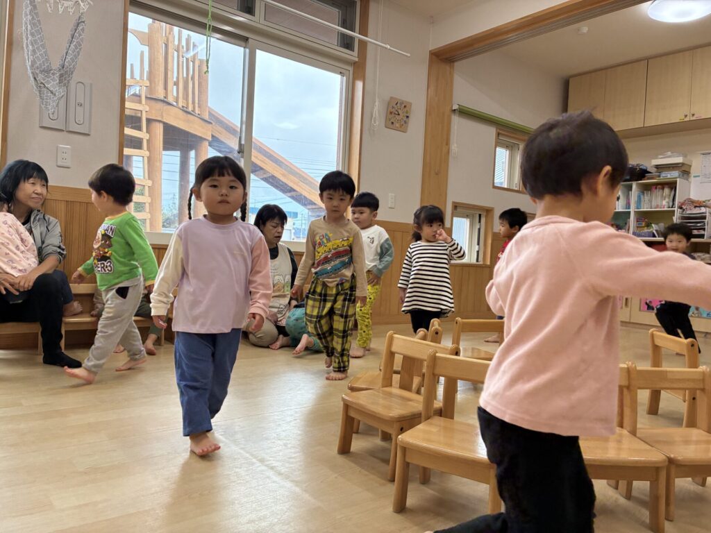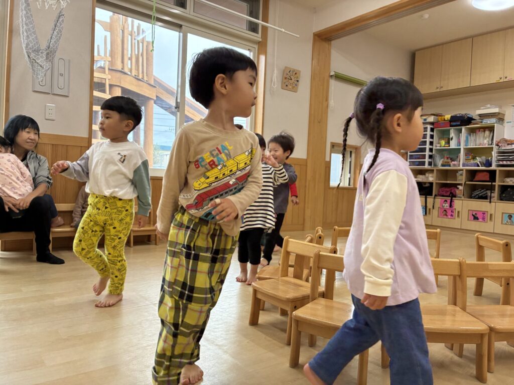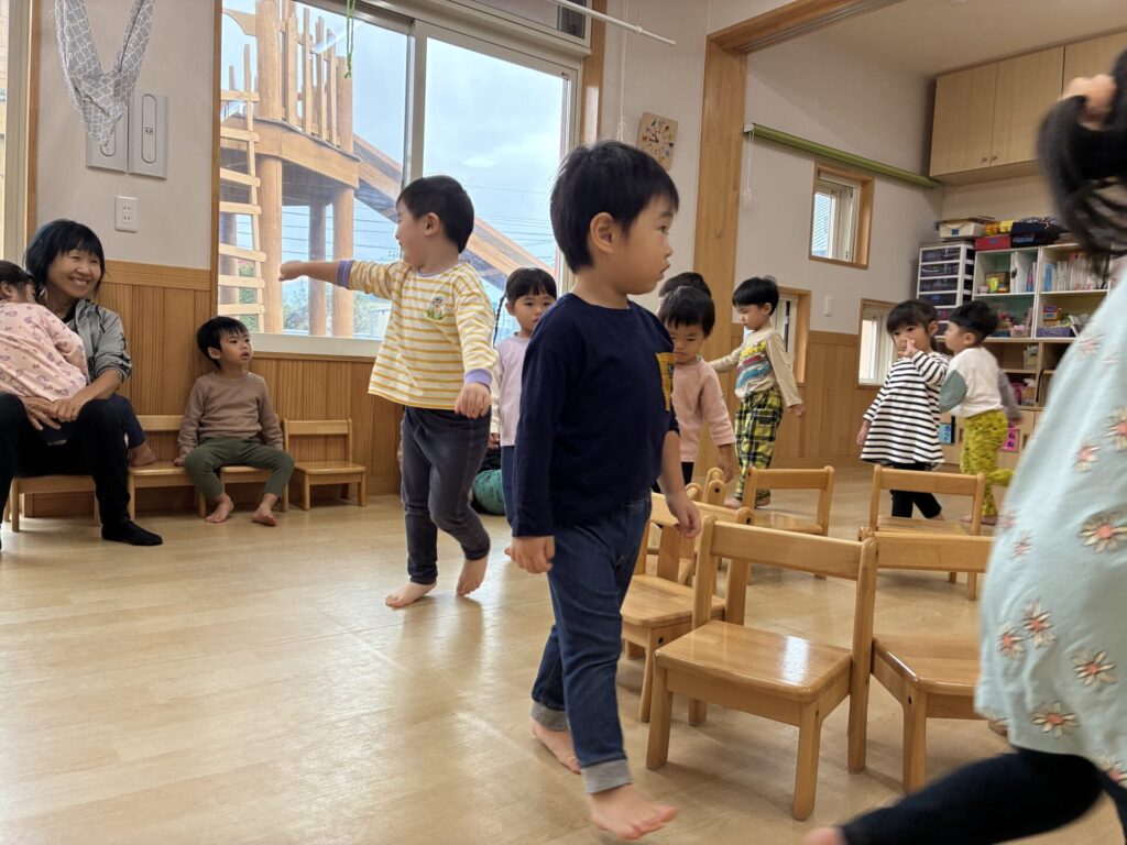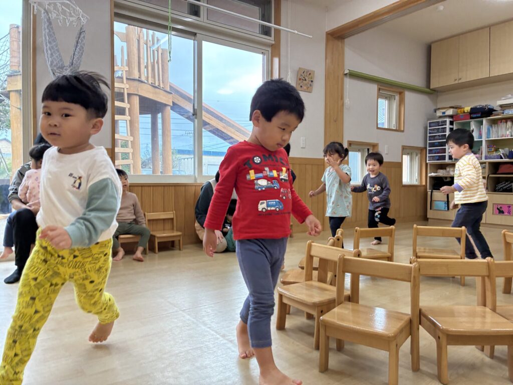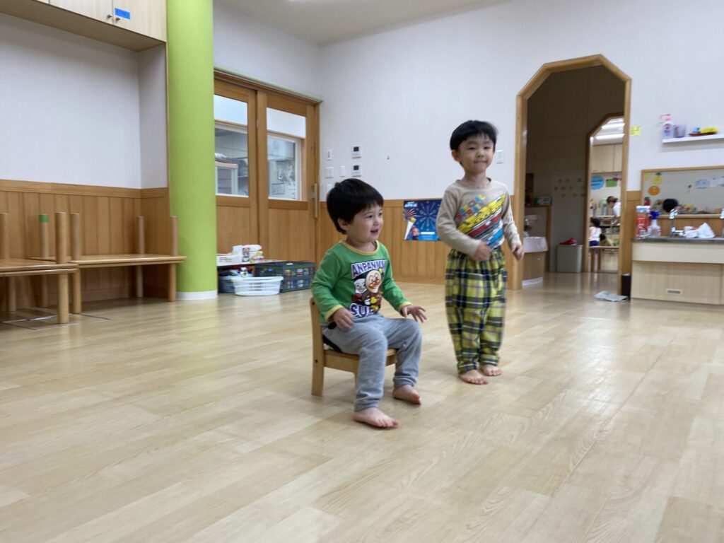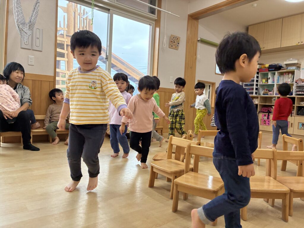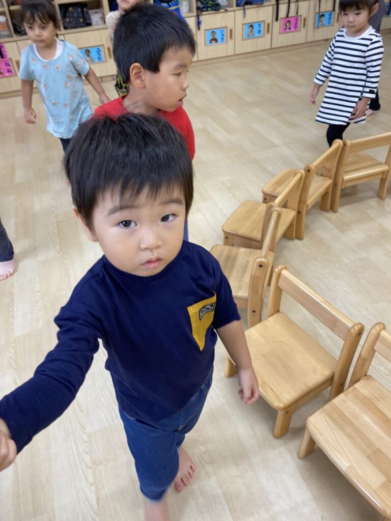 座れなくて涙する子もいましたが、「またやりたい!」と言う声も聞こえてきました😆ルールのある遊びにも楽しんで参加できるようになっています😊