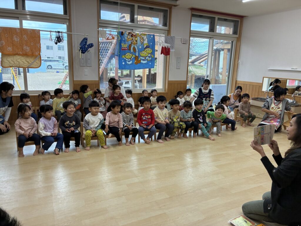 今日はマリ先生の英語の日で、みんなで参加しています⭐英語の歌をみんなで歌ったり、絵カードを見ながら、英語で答えています😊