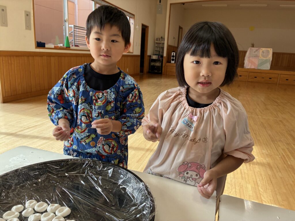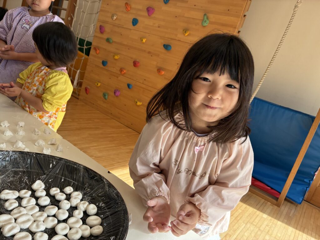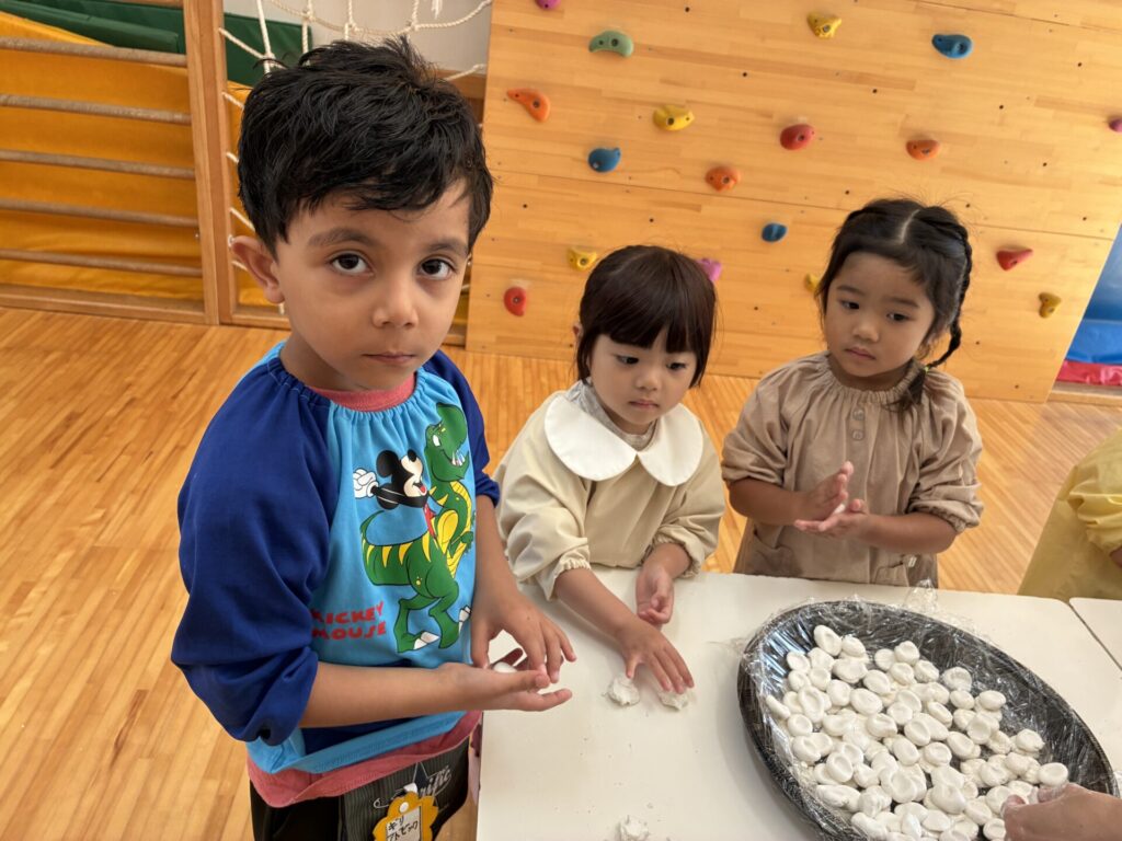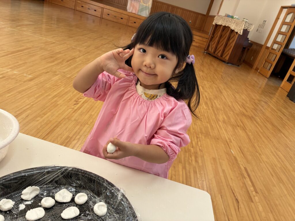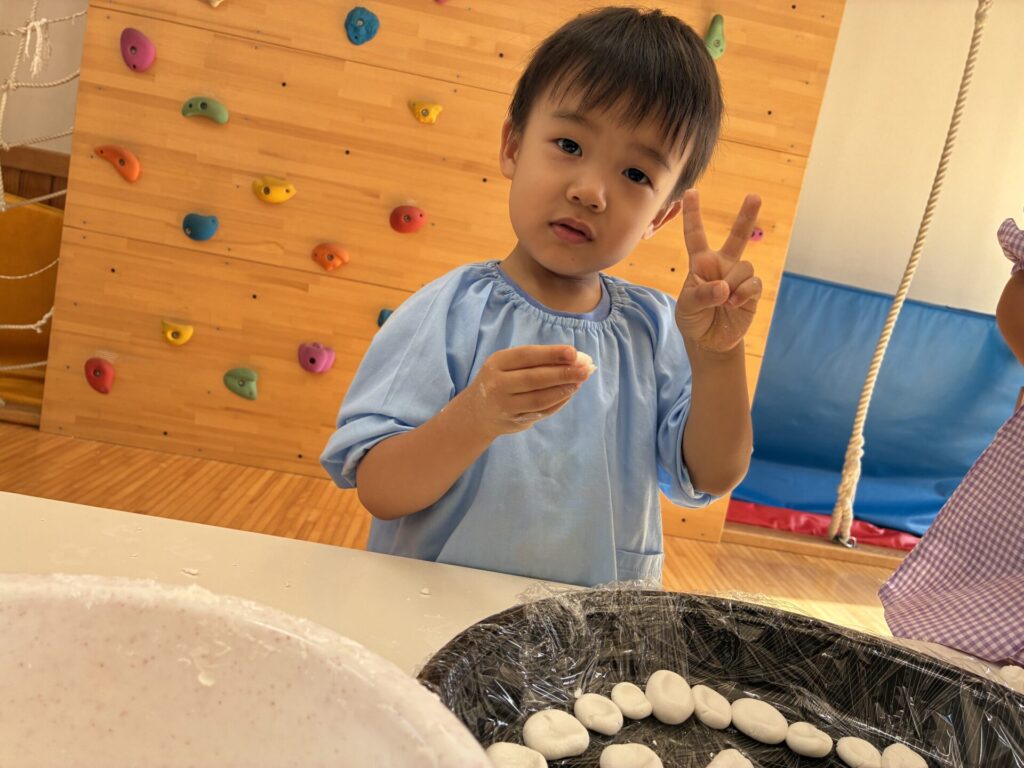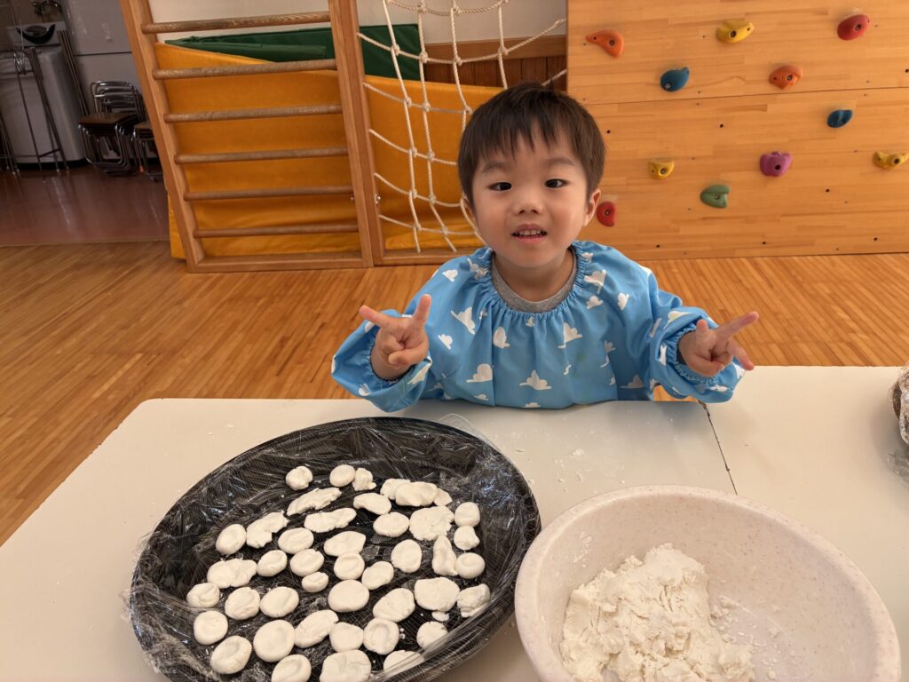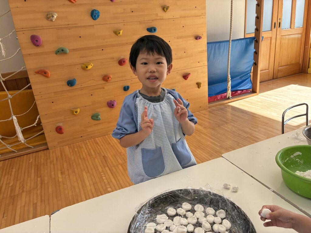 登園して手洗いうがい、スモックを着たらお団子づくり!みんな丸めるのがとても上手でした!「もちもちしてる!」「何個でもお団子作れそう!」と楽しみながらお団子を作ってくれました😊