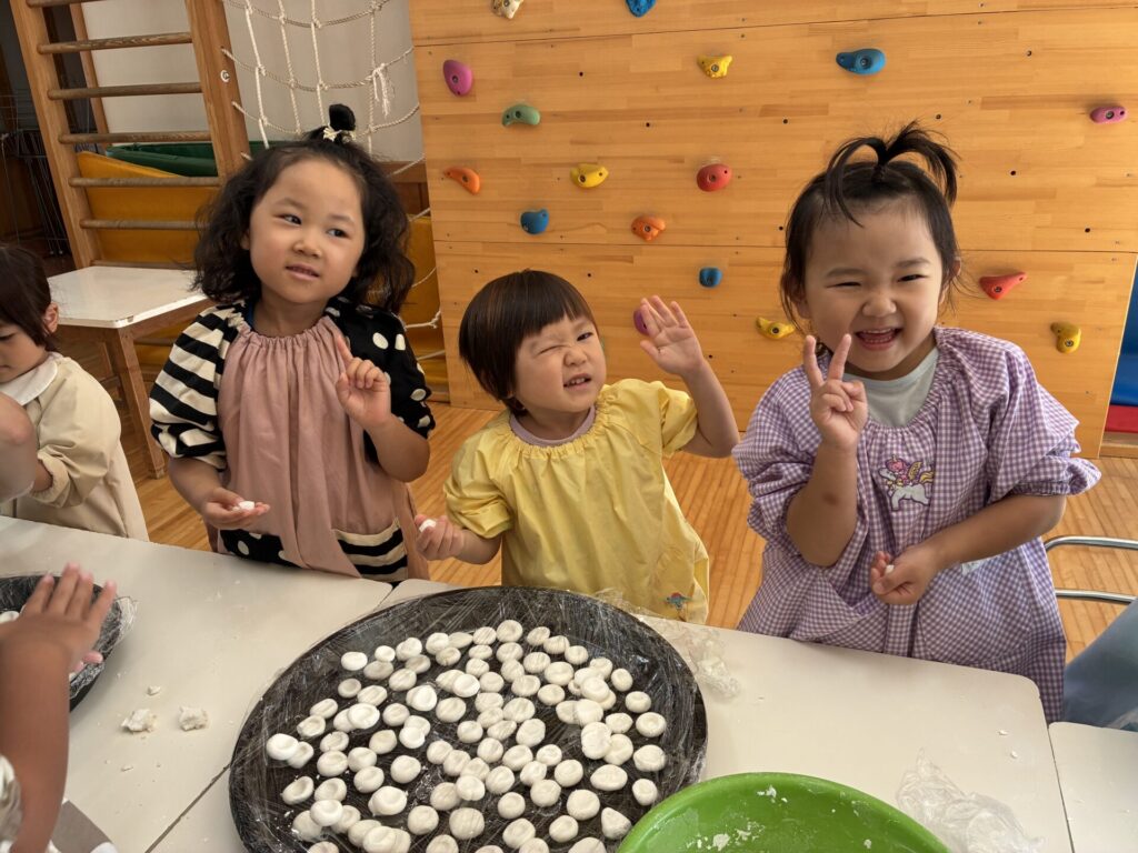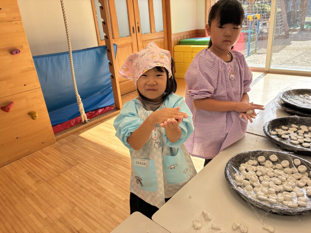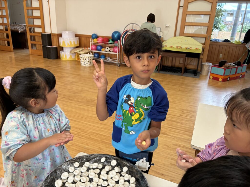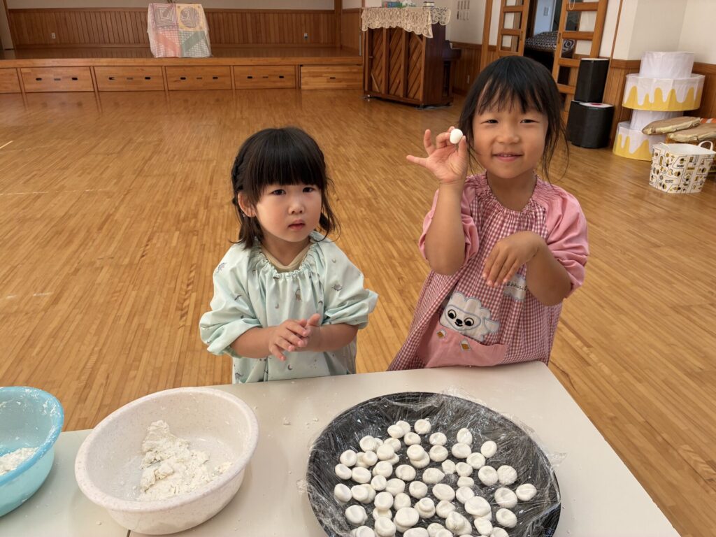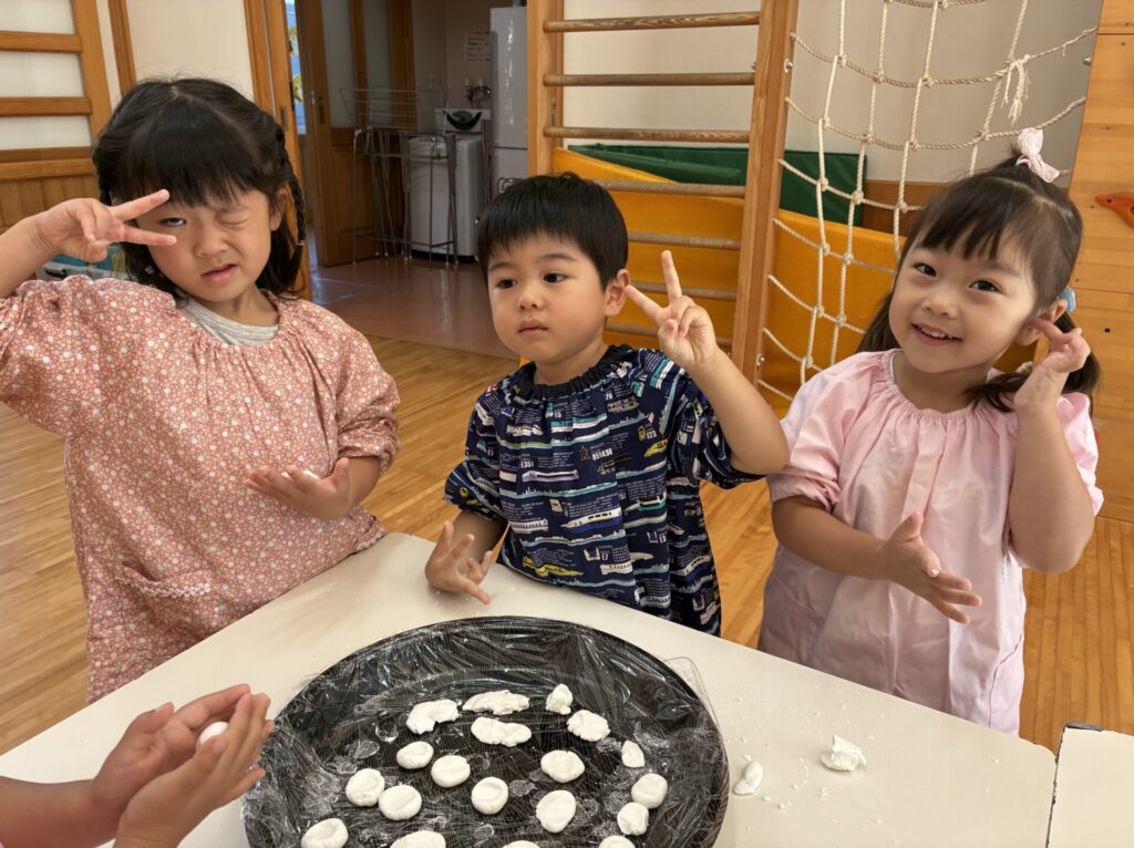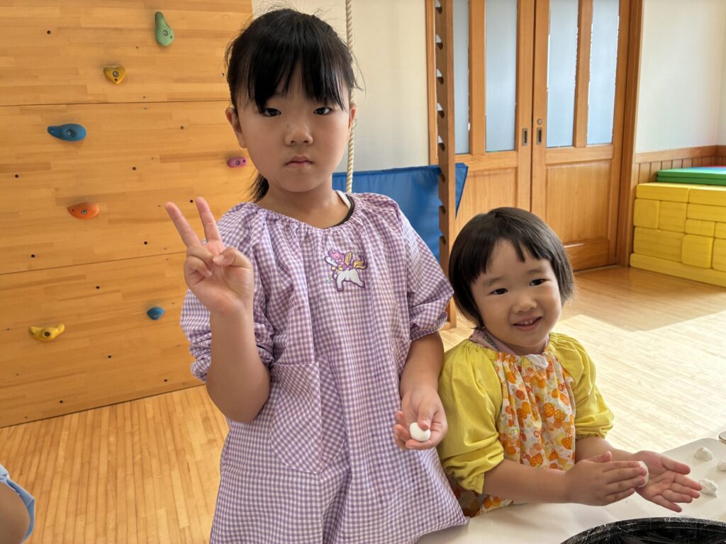 登園して手洗いうがい、スモックを着たらお団子づくり!みんな丸めるのがとても上手でした!「もちもちしてる!」「何個でもお団子作れそう!」と楽しみながらお団子を作ってくれました😊