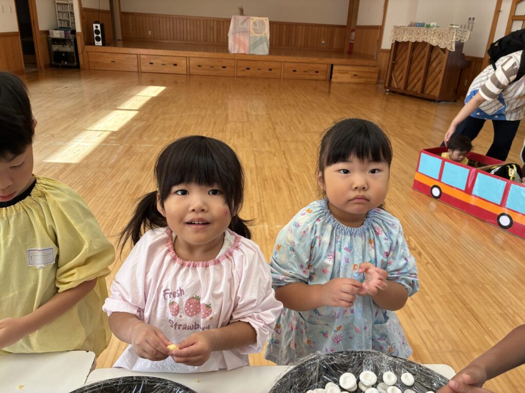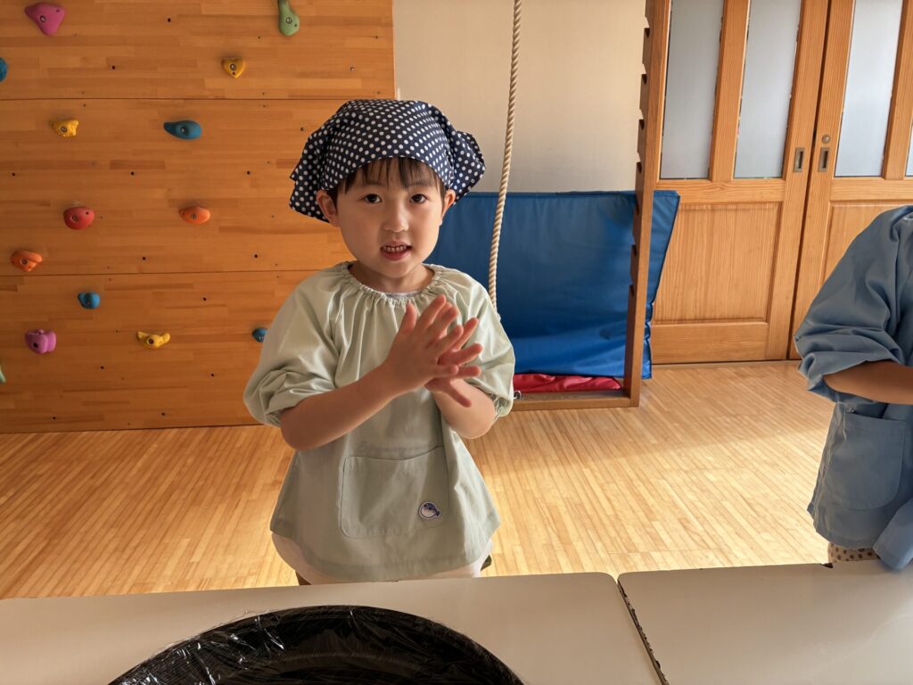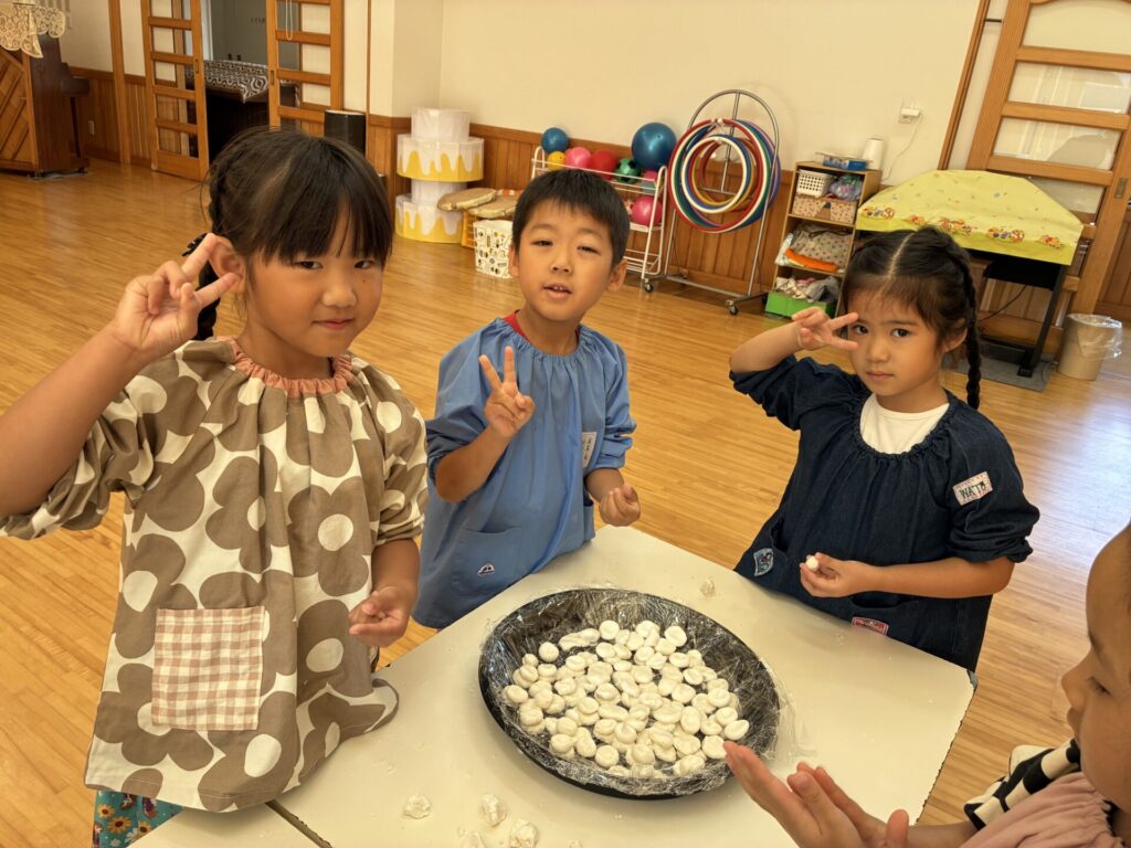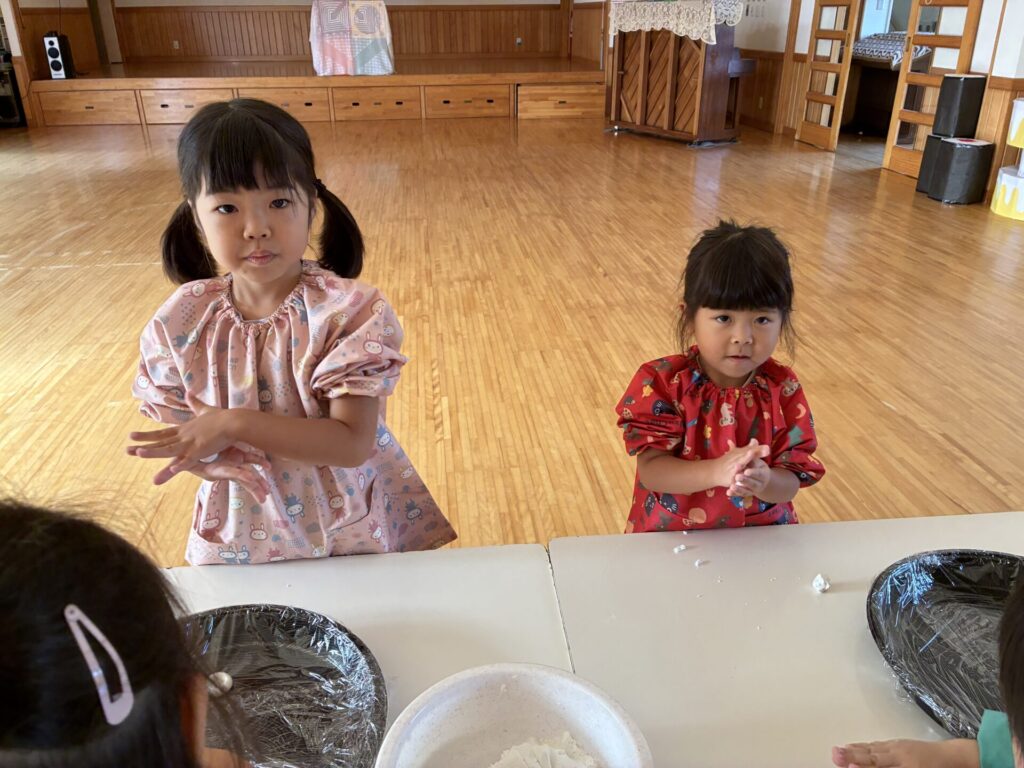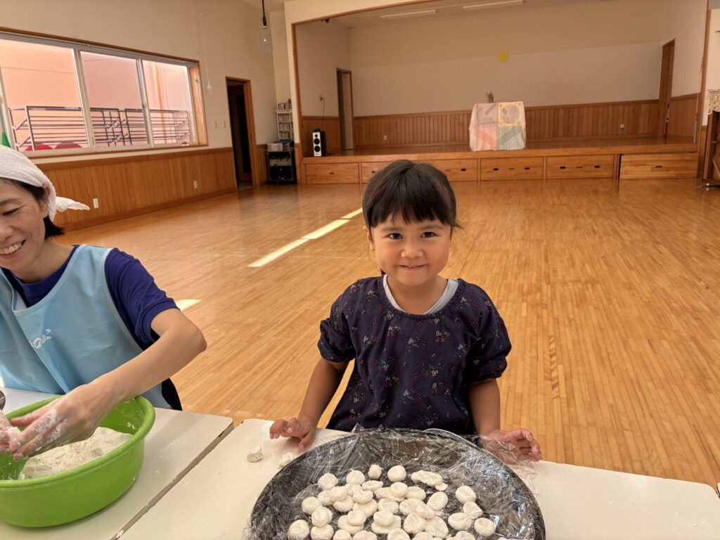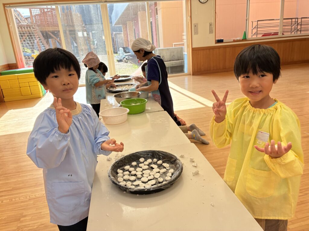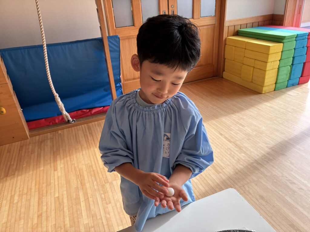 登園して手洗いうがい、スモックを着たらお団子づくり!みんな丸めるのがとても上手でした!「もちもちしてる!」「何個でもお団子作れそう!」と楽しみながらお団子を作ってくれました😊