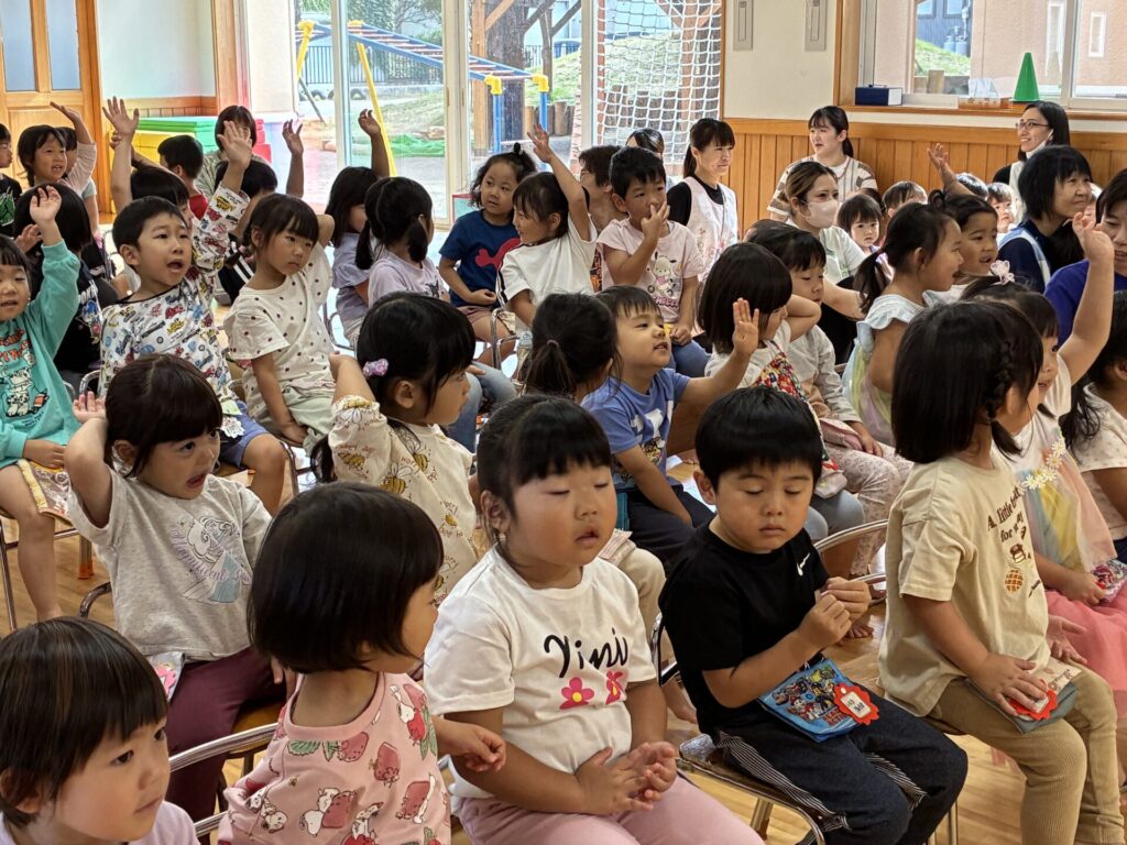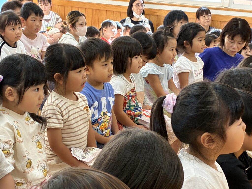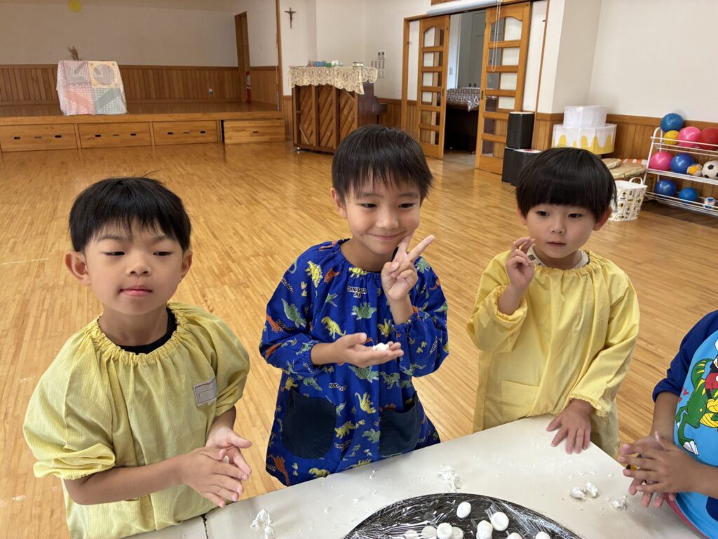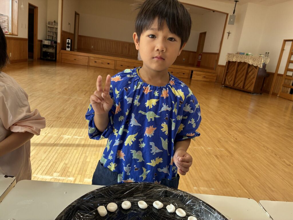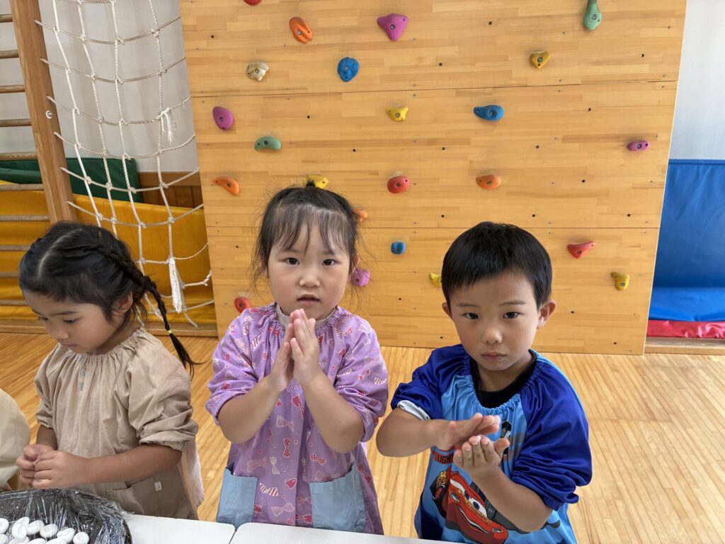 お団子づくりの後は、ホールに集まってみんなで十五夜さんのお話を聞いたり、十五夜クイズをしました🐇「十五夜さんにお供えするものは何でしょう?」「月にいるウサギはなにをしているでしょうか?」というクイズに全力で答えてくれました!その後はみんなで「つき」を歌いました🎵とっても素敵な歌声でしたよ✨