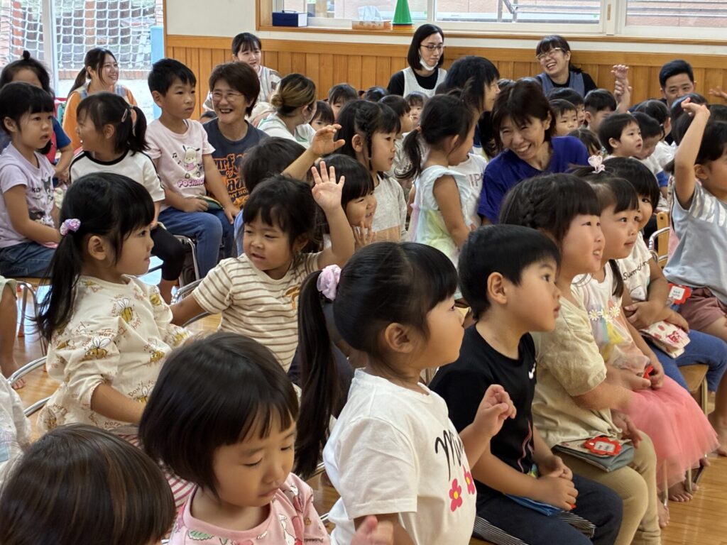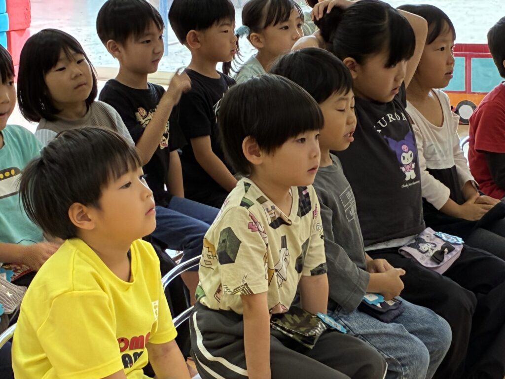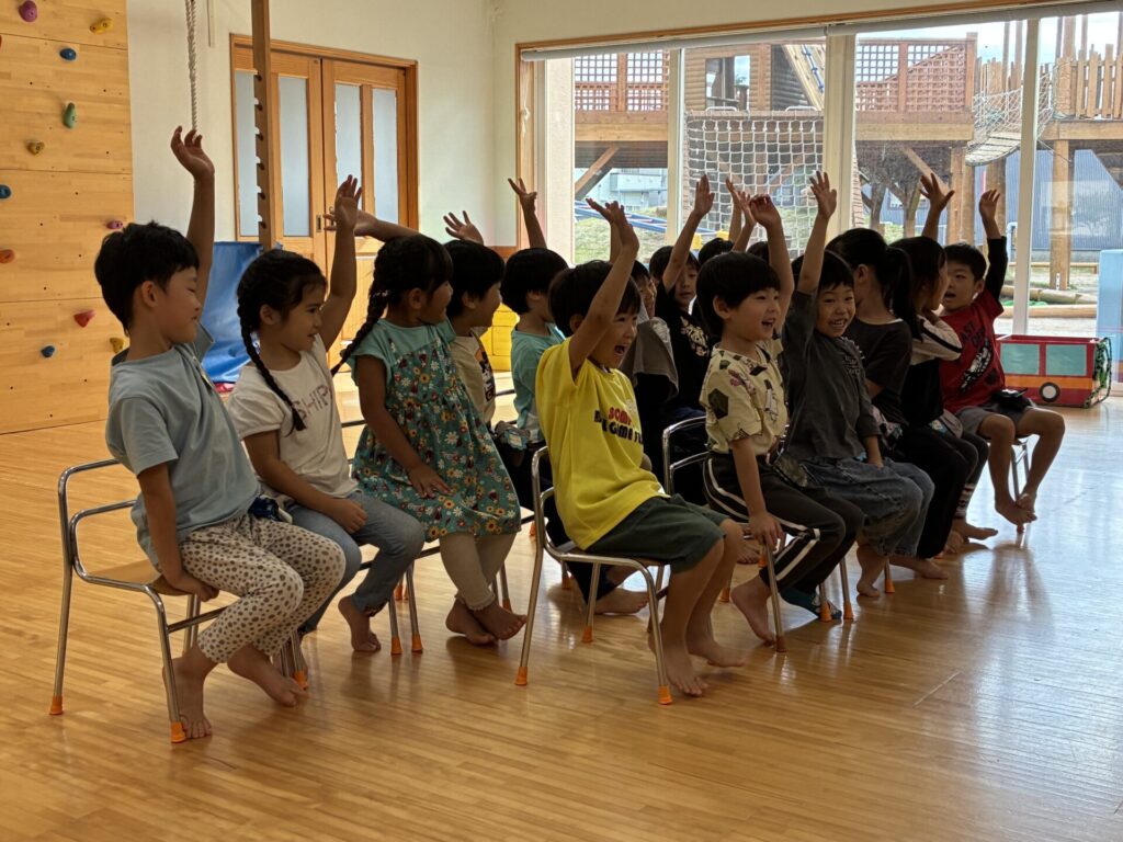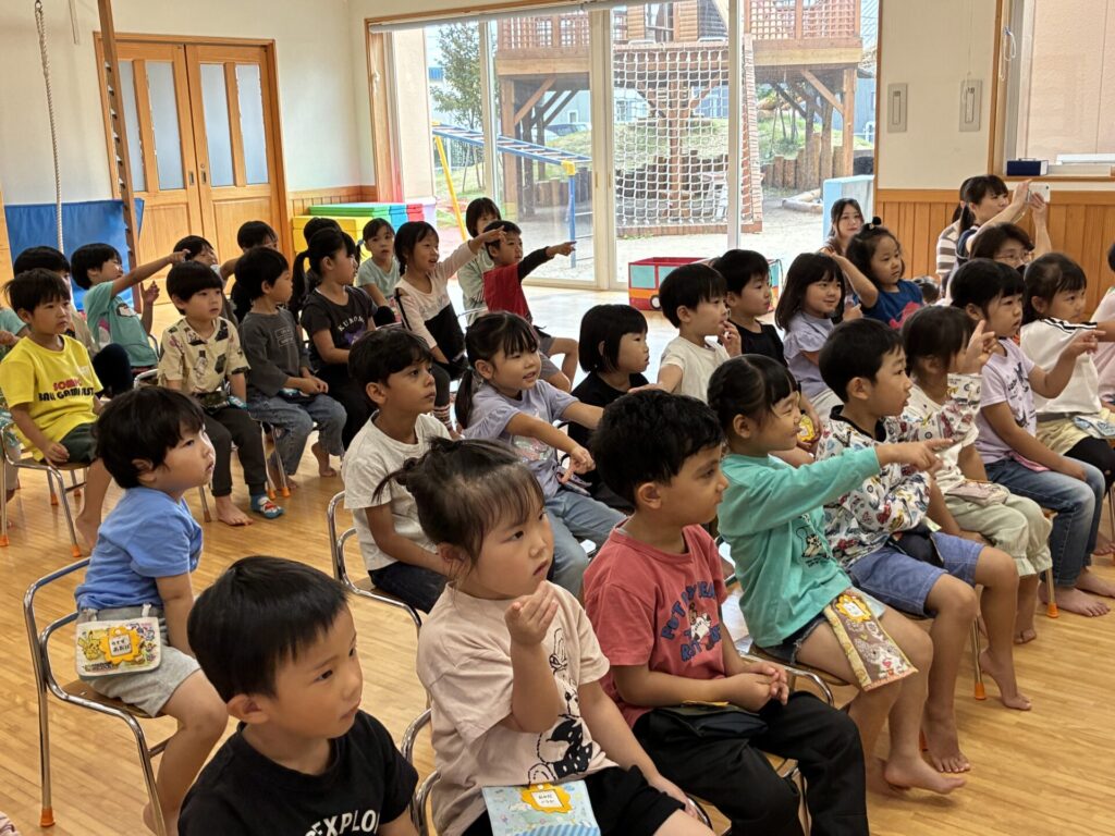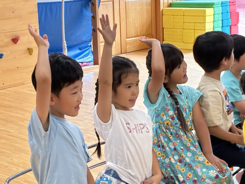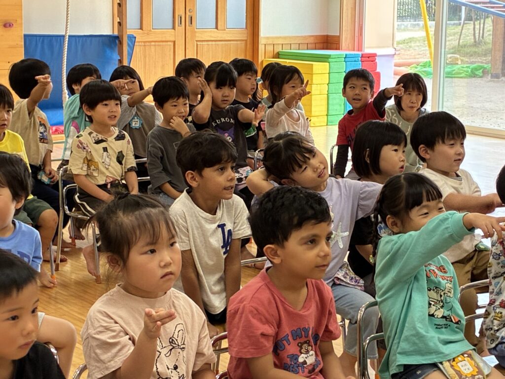 お団子づくりの後は、ホールに集まってみんなで十五夜さんのお話を聞いたり、十五夜クイズをしました🐇「十五夜さんにお供えするものは何でしょう?」「月にいるウサギはなにをしているでしょうか?」というクイズに全力で答えてくれました!その後はみんなで「つき」を歌いました🎵とっても素敵な歌声でしたよ✨