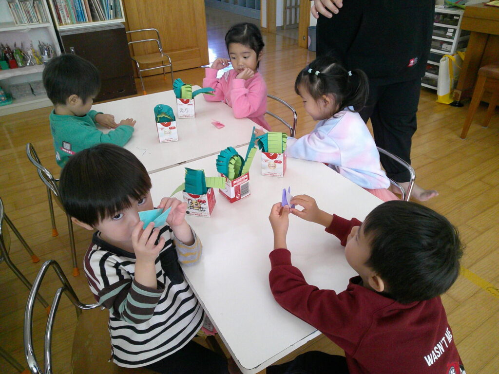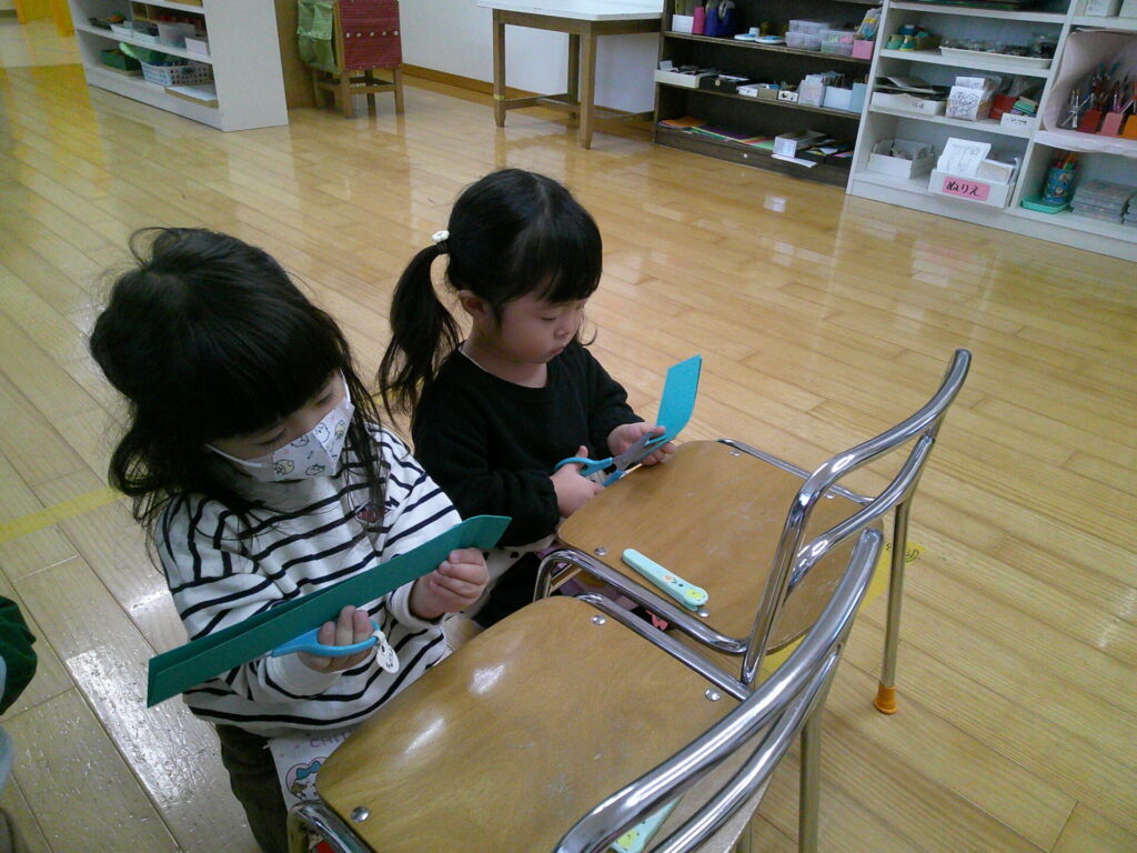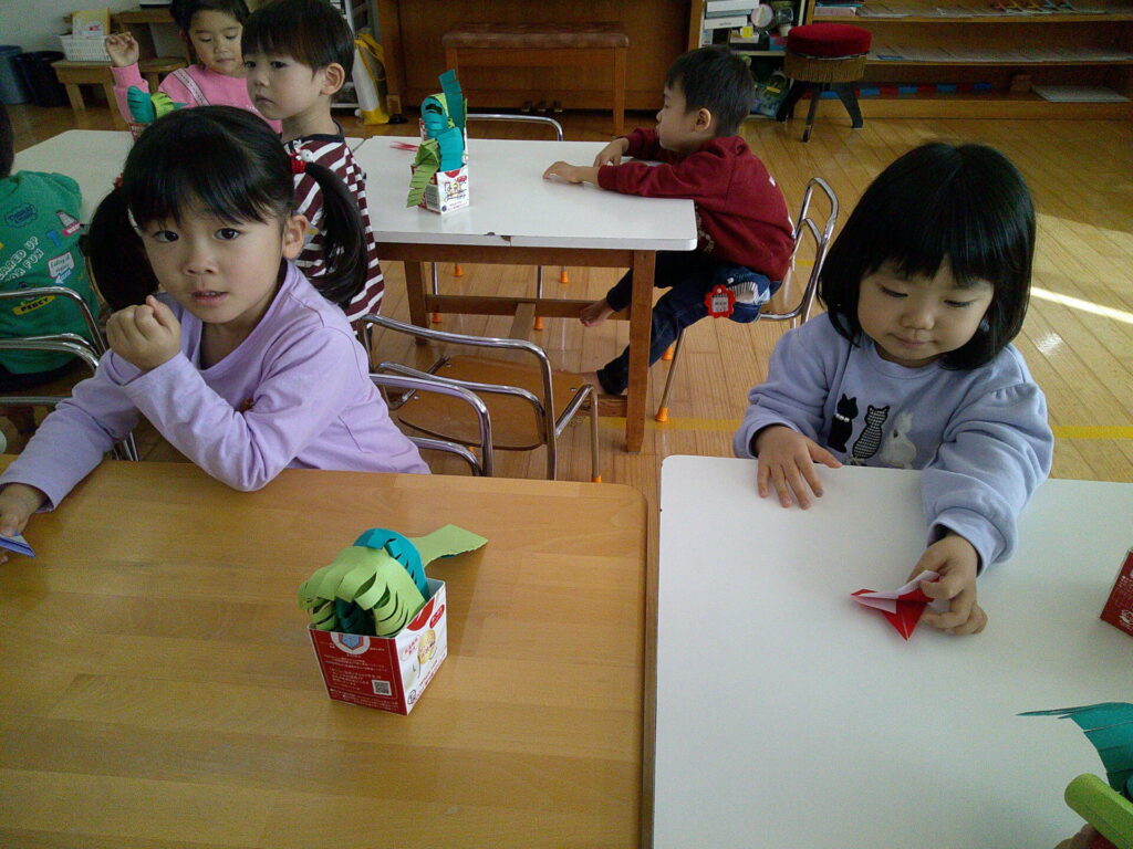 線の通りに切ろうと、真剣な表情の赤・ピンクバッチさんでした🎄折り紙でサンタさんも作りましたよ🎅