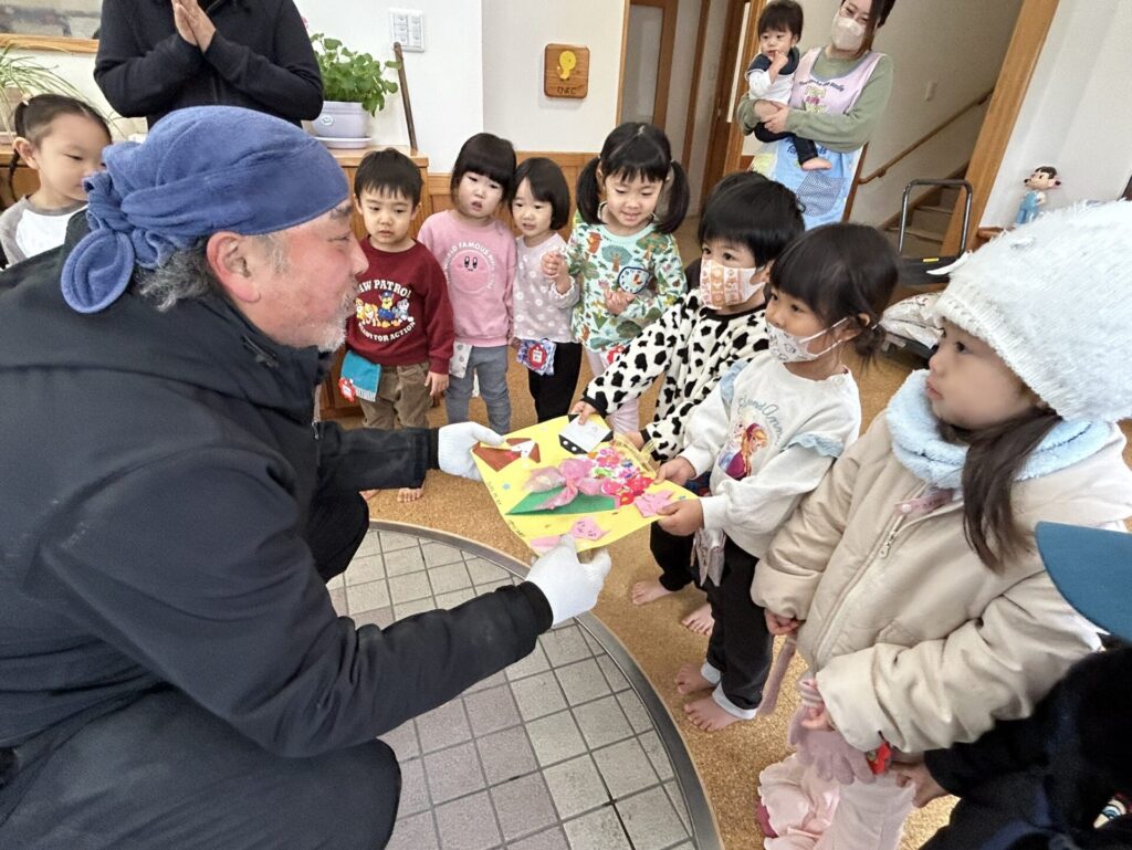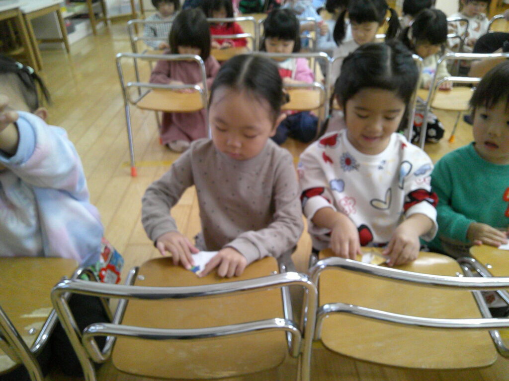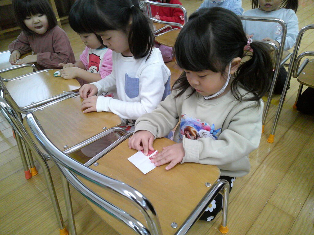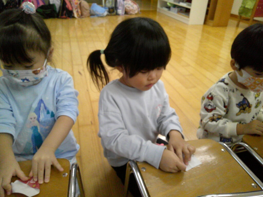 クリスマスの製作を行っています。折り紙でサンタクロースや、プレゼントを作りましたよ。