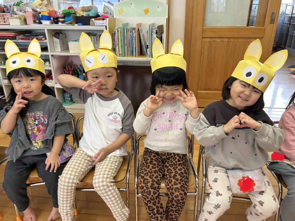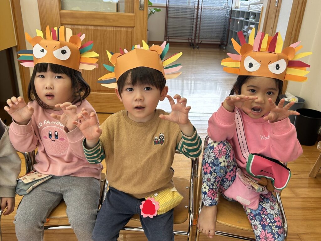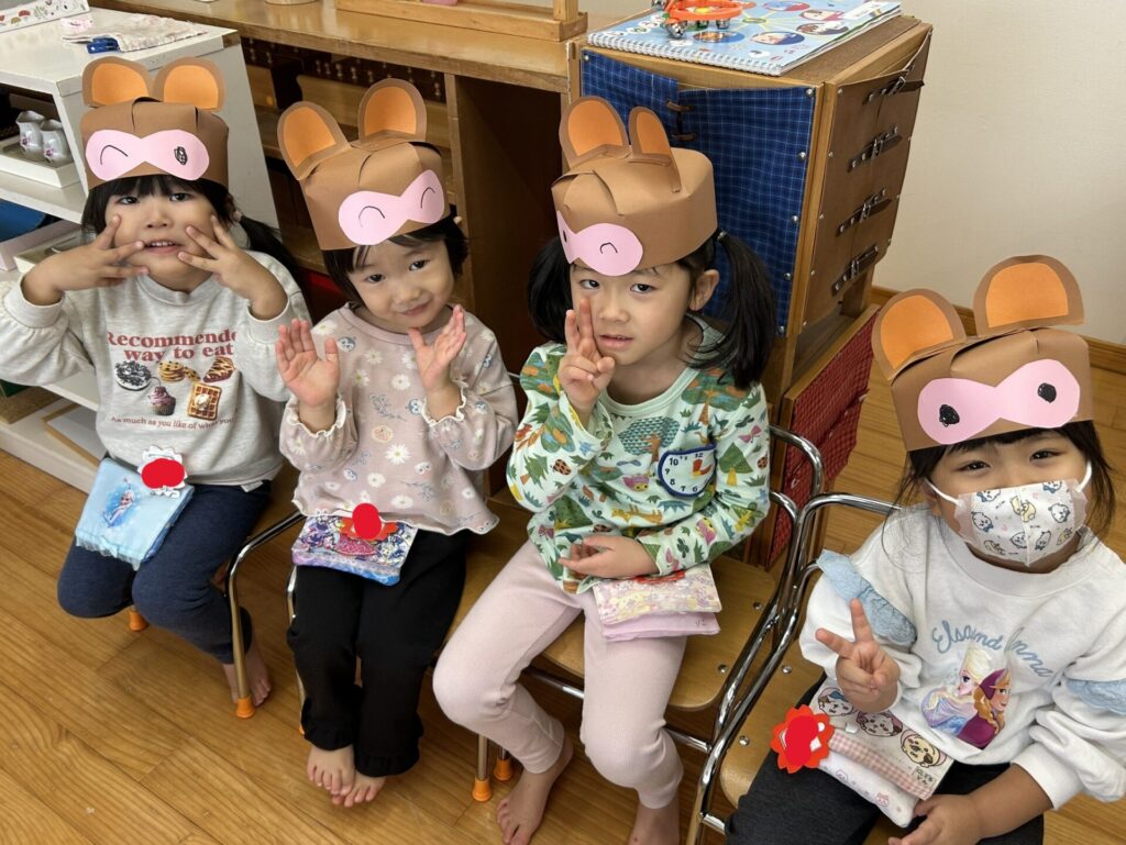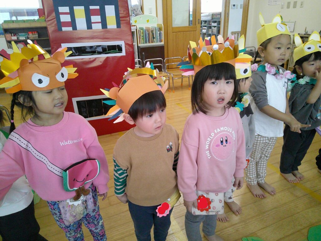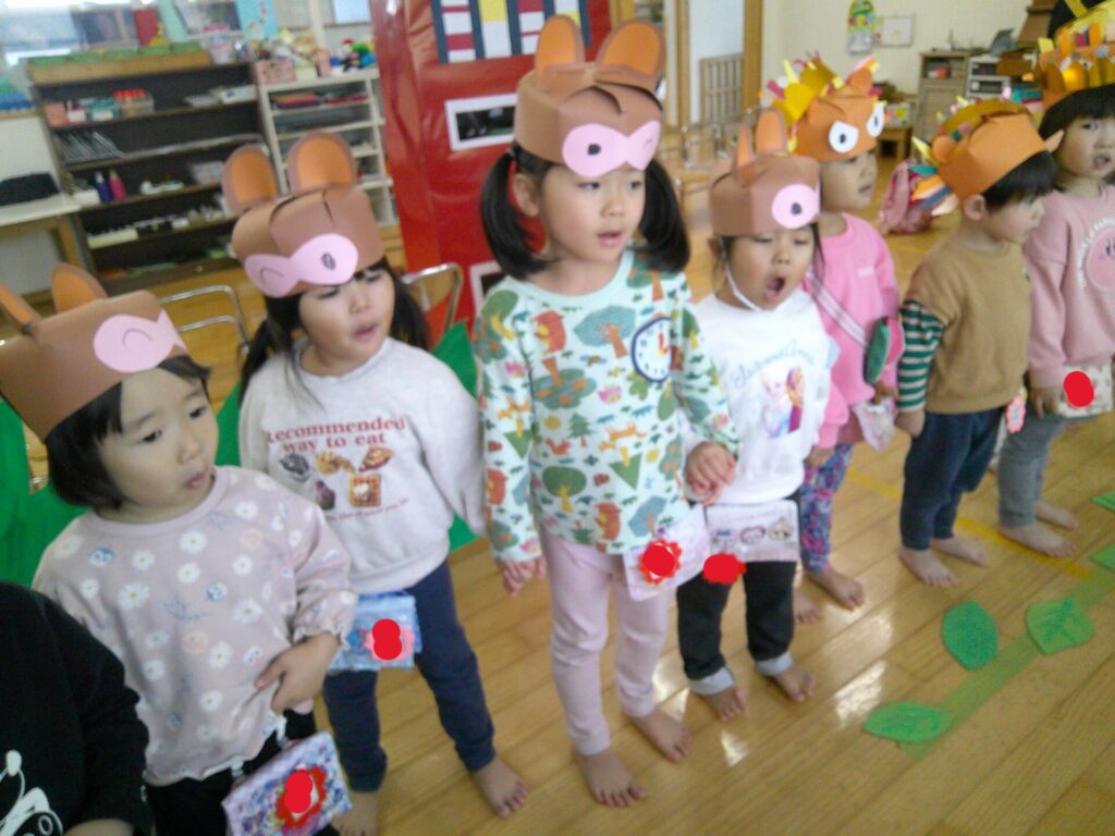 楽しんで劇の練習をしています☺️役に合わせた帽子をかぶり、益々やる気が出る、赤・ピンクバッチさんです。