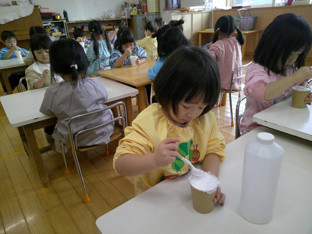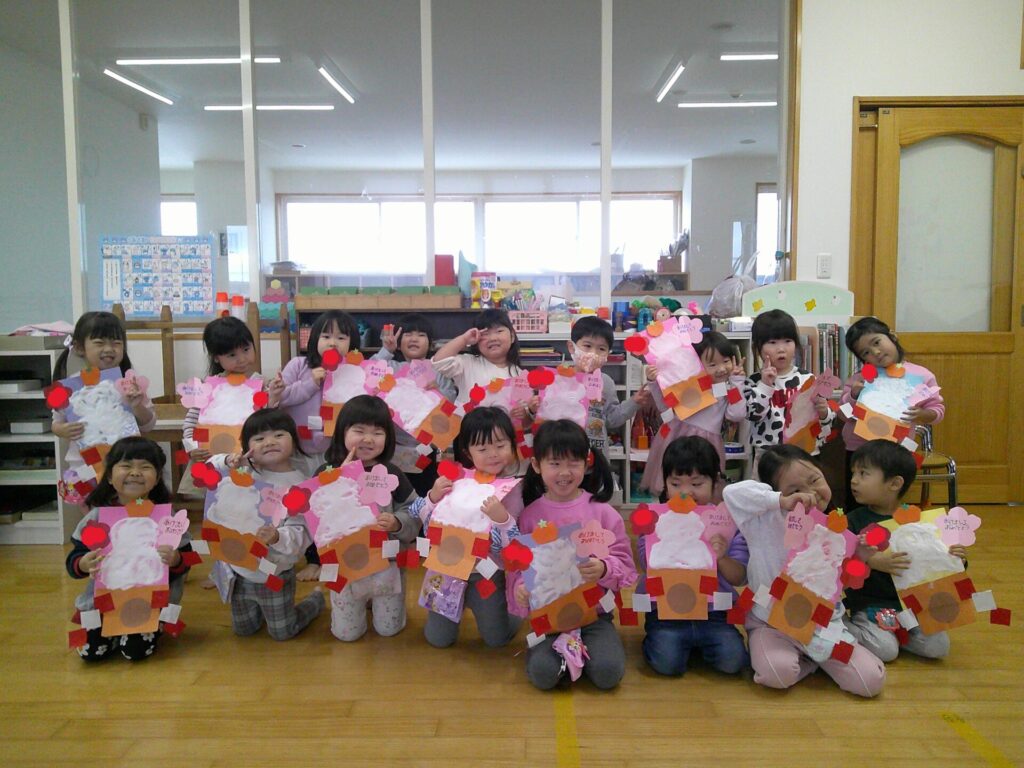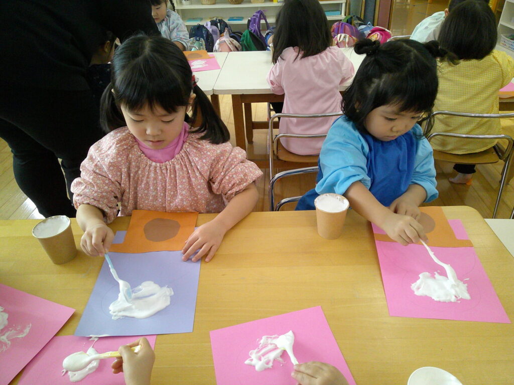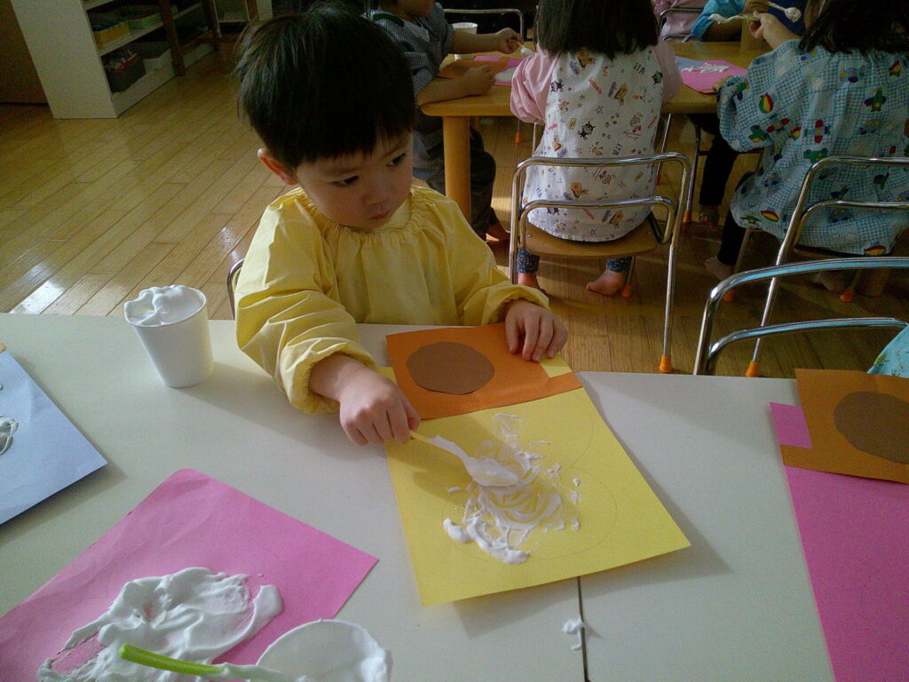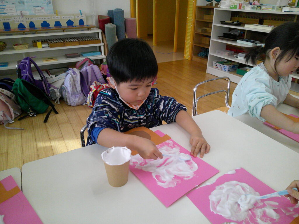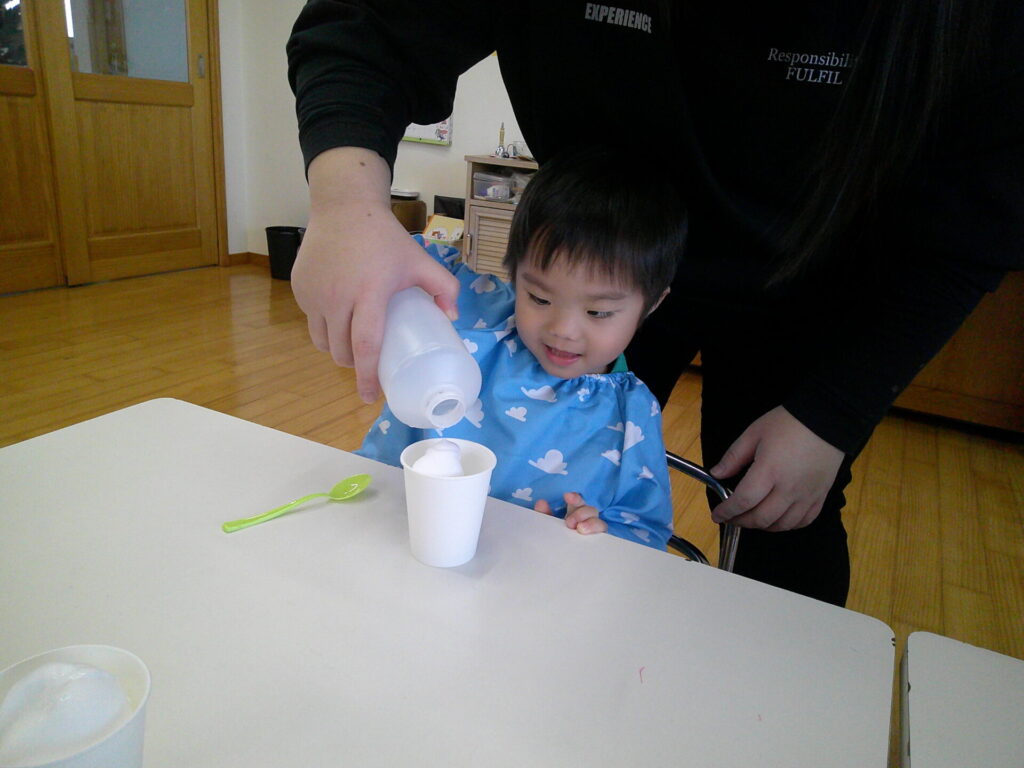 洗濯のり、シェービングフォーム、ボンドを混ぜ混ぜ🌀コップの中身を、キラキラ✨した目で見ながら、混ぜていましたよ!混ぜていくと、ふわふわな物が出来上がり、餅に見立てて、画用紙に塗りました😊美味しそうな大きな餅の完成です🥰作品は、先日の、「はぴあ」で飾られた作品と一緒に持って帰るので、飾ってあげて下さいね🥰