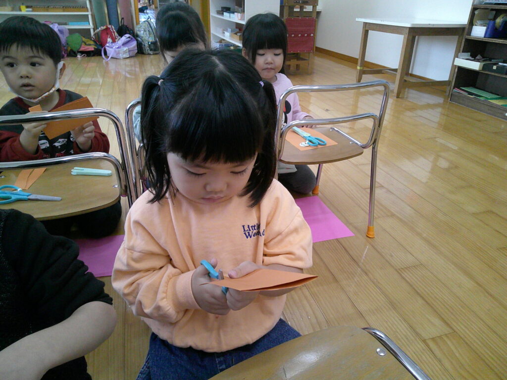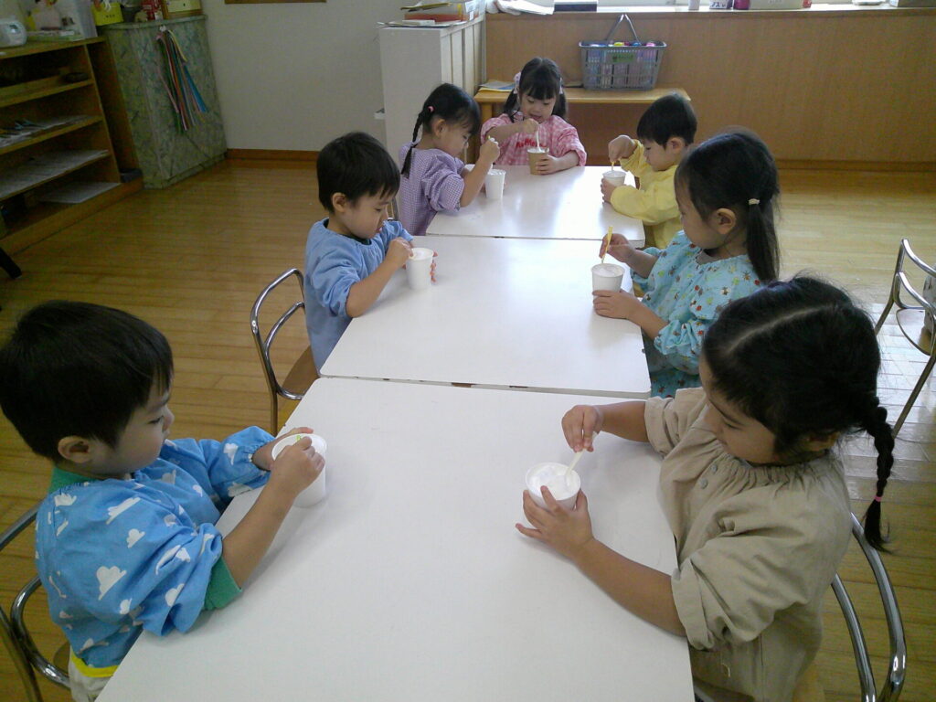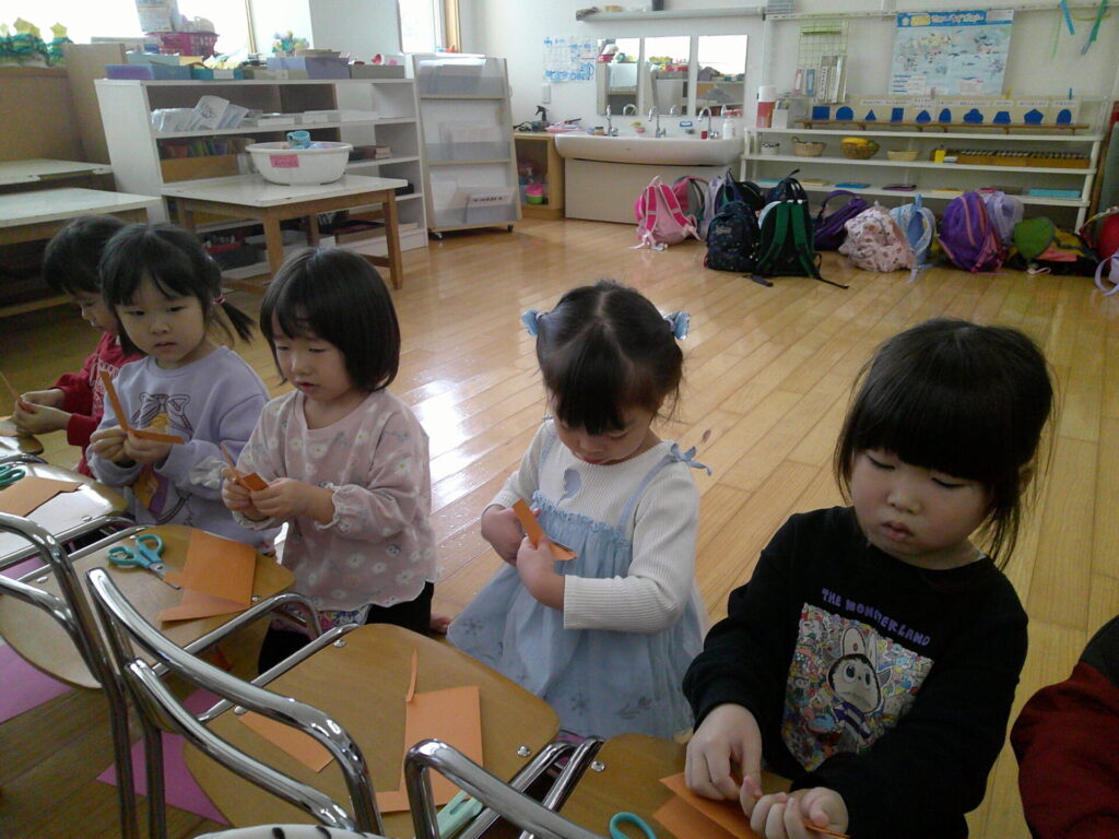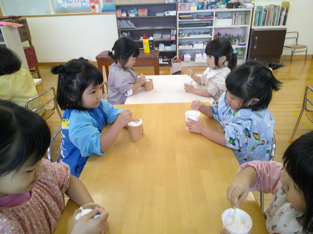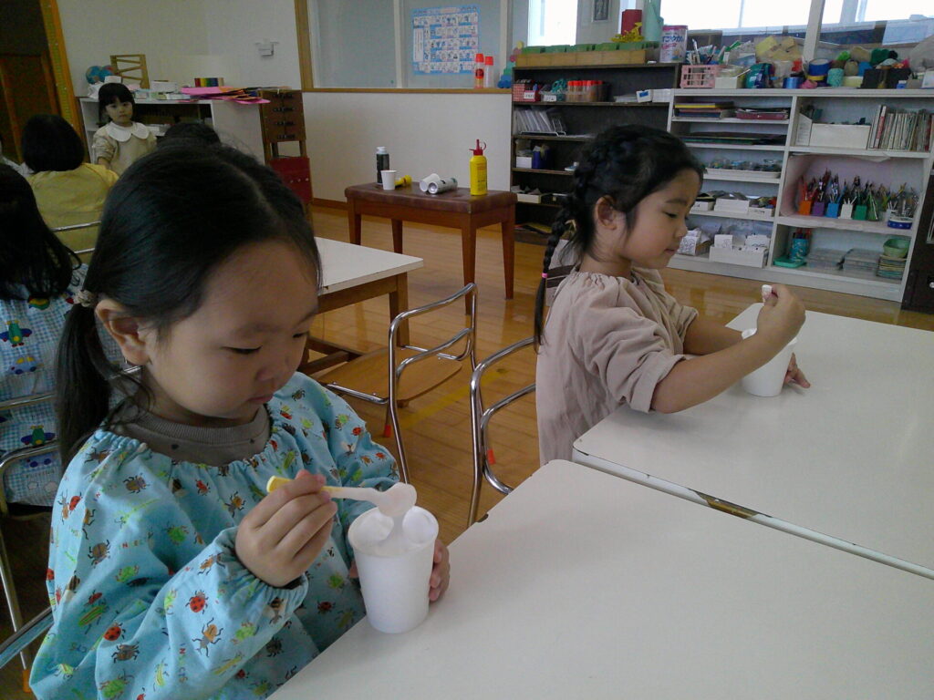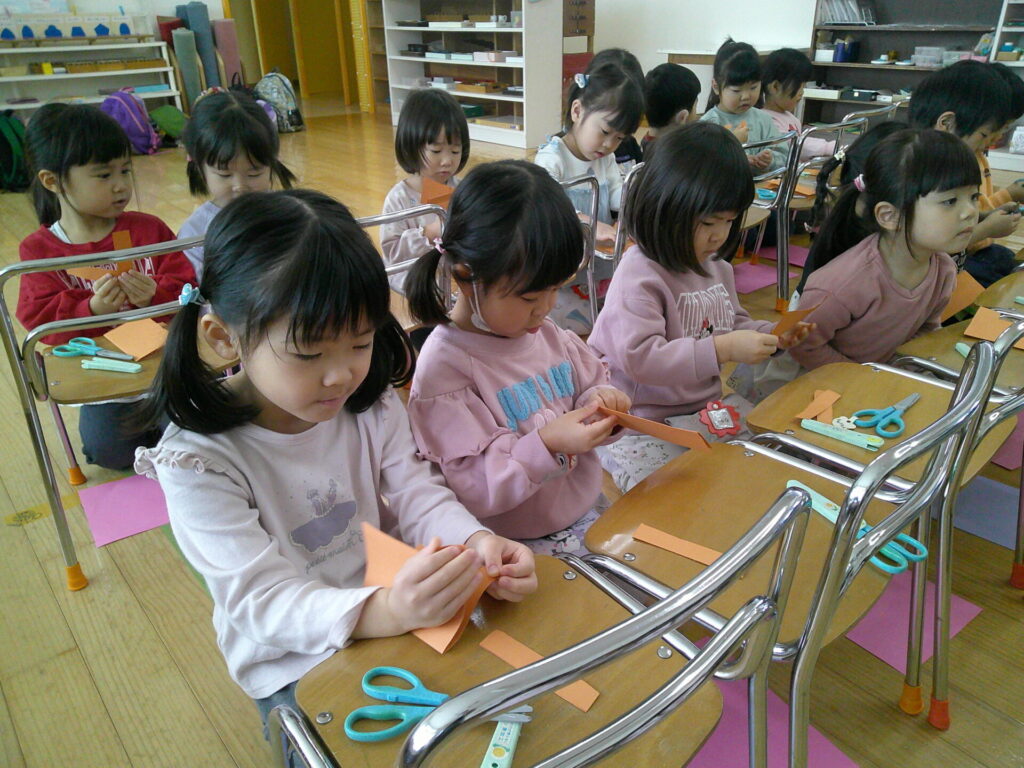 洗濯のり、シェービングフォーム、ボンドを混ぜ混ぜ🌀コップの中身を、キラキラ✨した目で見ながら、混ぜていましたよ!混ぜていくと、ふわふわな物が出来上がり、餅に見立てて、画用紙に塗りました😊美味しそうな大きな餅の完成です🥰作品は、先日の、「はぴあ」で飾られた作品と一緒に持って帰るので、飾ってあげて下さいね🥰