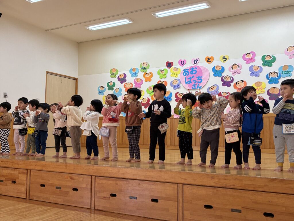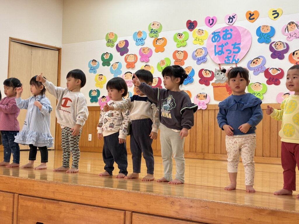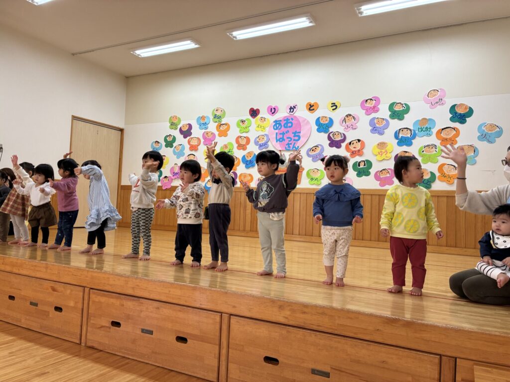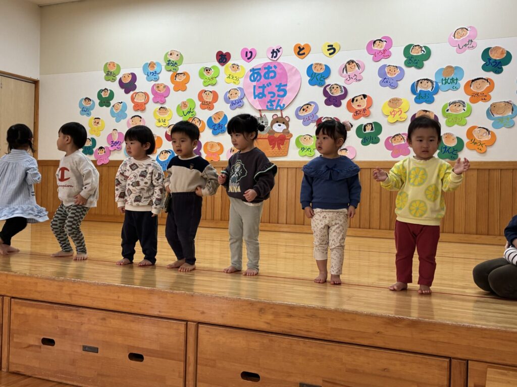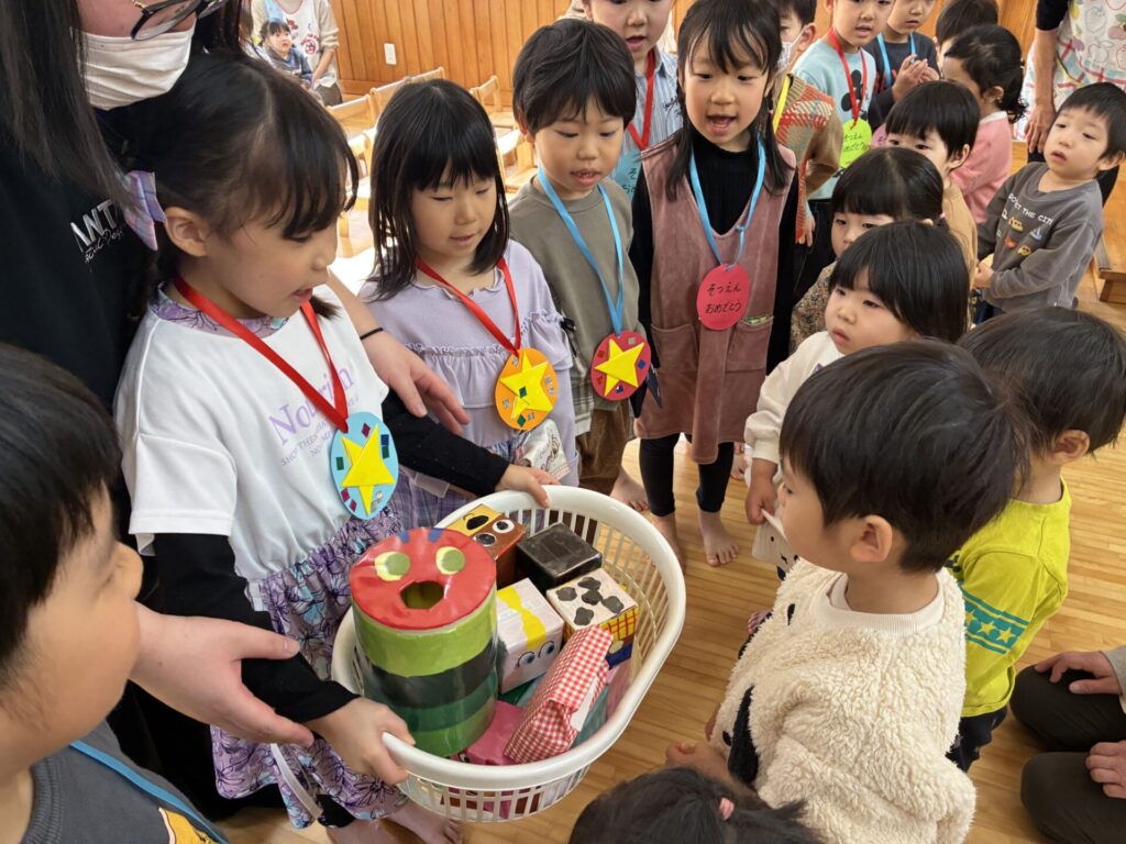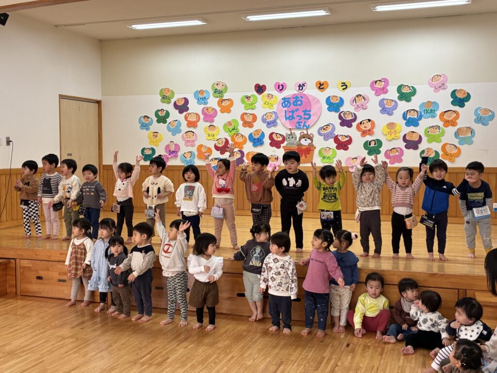 今日は青バッチさんのお別れ会がありました‼️青バッチさんにプレゼントを渡して、青バッチさんからも手作りおもちゃのプレゼントを未満児さんにもらいました。チョコさんが「ありがとう🎶」と代表して受け取り大きな声でお礼をしっかりと言う事ができていました🥰