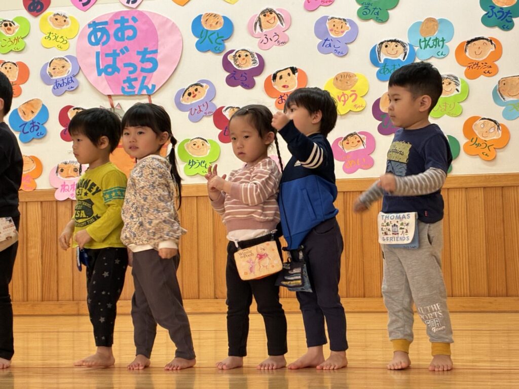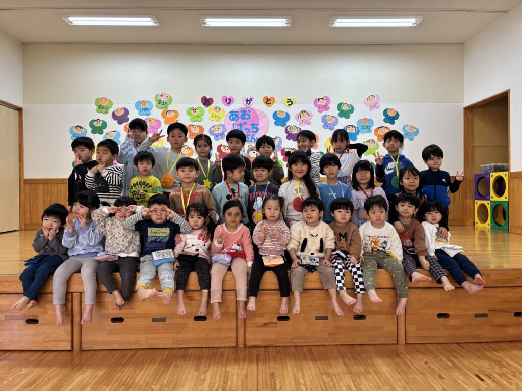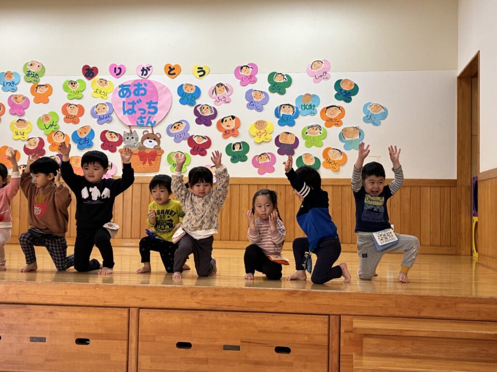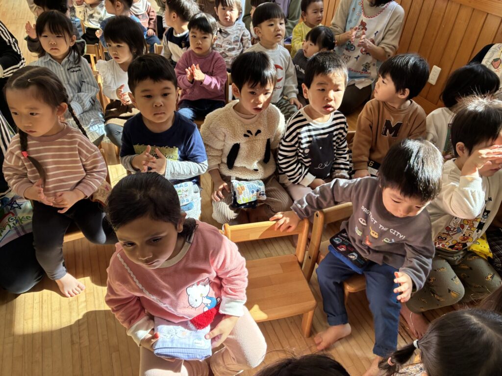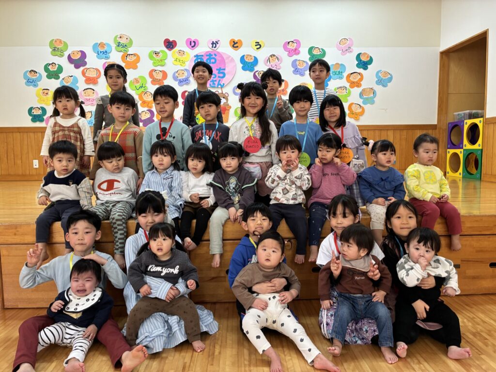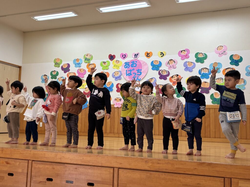 今日は青バッチさんのお別れ会がありました‼️青バッチさんにプレゼントを渡して、青バッチさんからも手作りおもちゃのプレゼントを未満児さんにもらいました。チョコさんが「ありがとう🎶」と代表して受け取り大きな声でお礼をしっかりと言う事ができていました🥰
