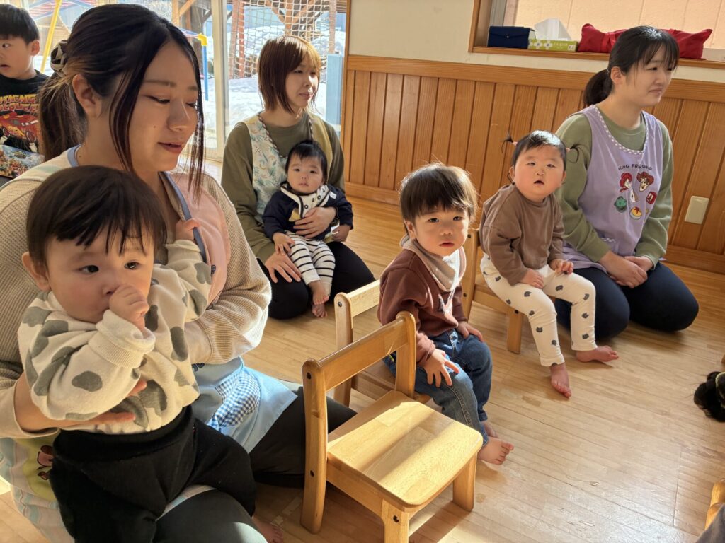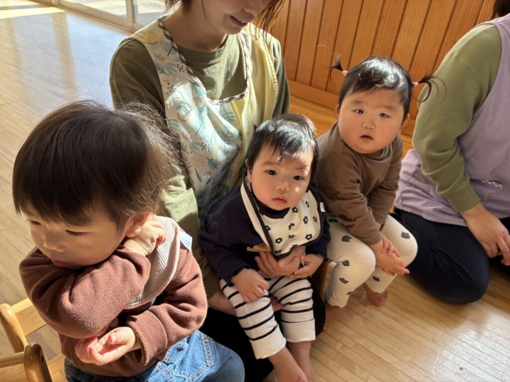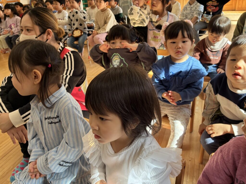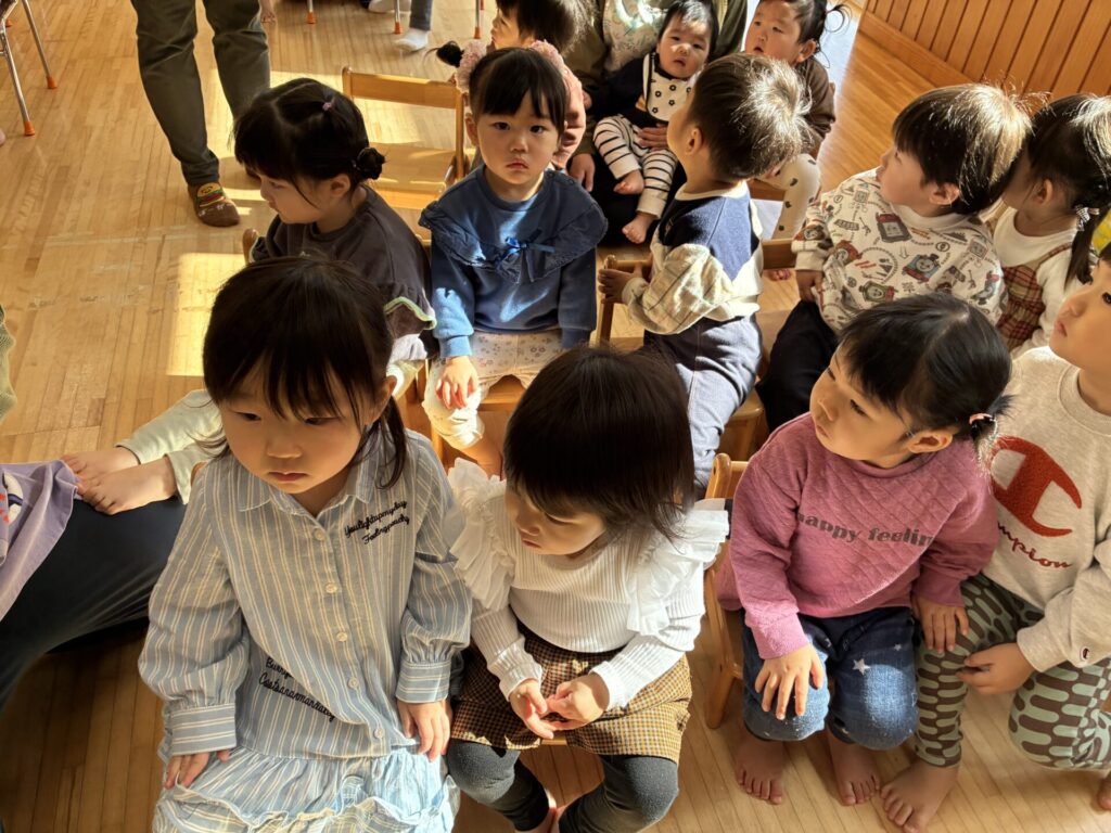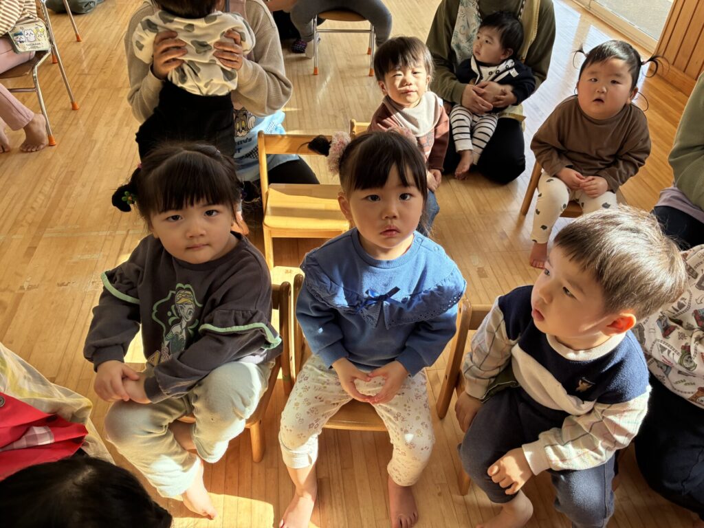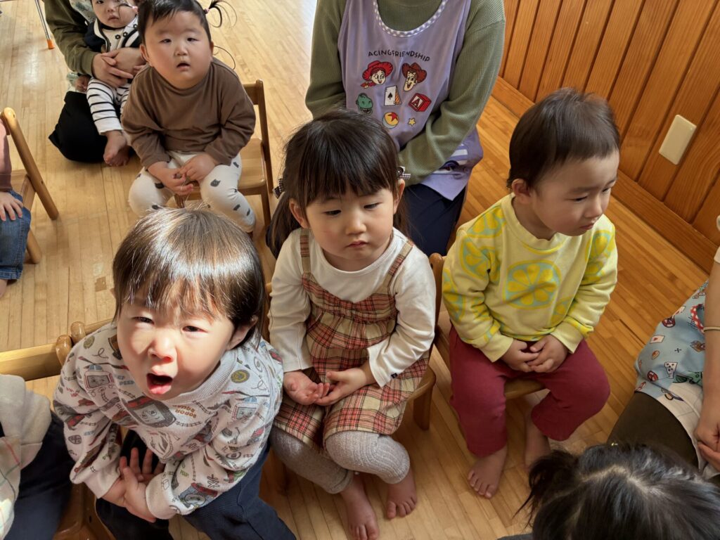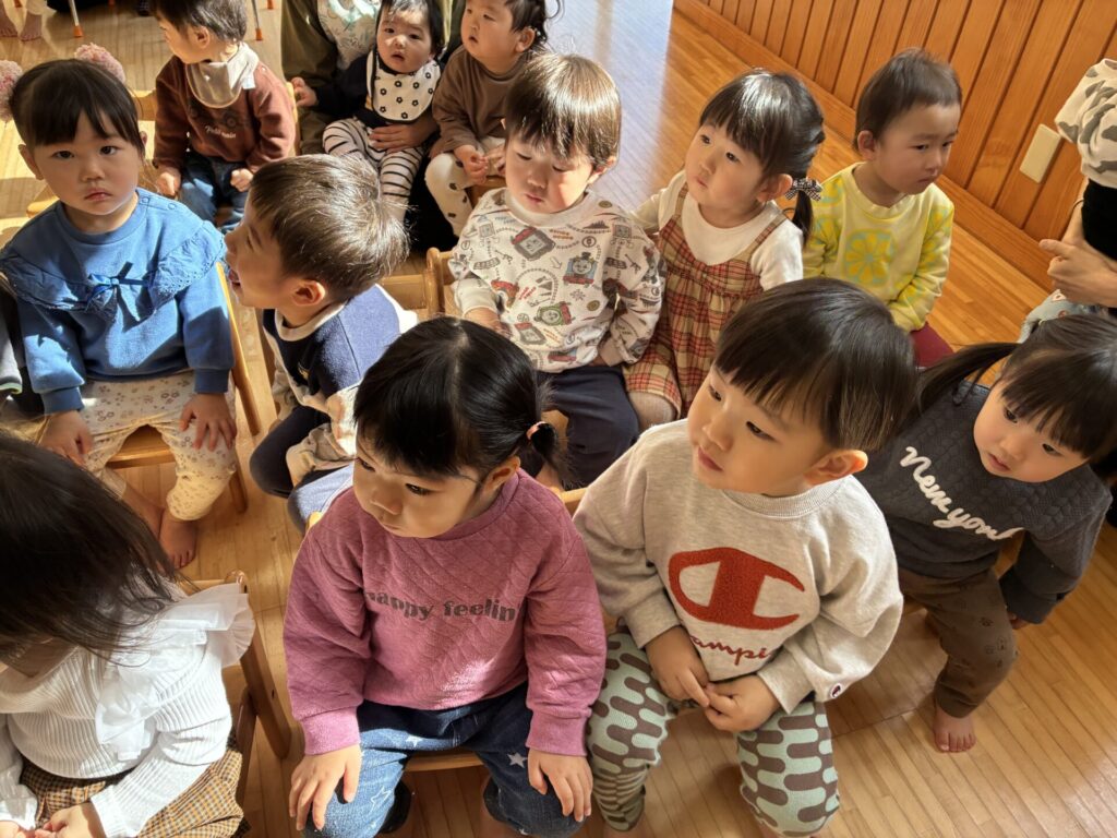 青バッチさんの楽器演奏も真剣に集中して聞いていた未満児さんの子どもたちです🎵