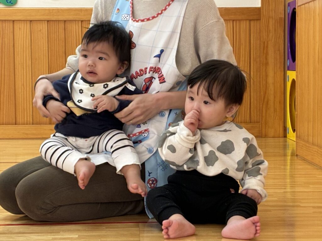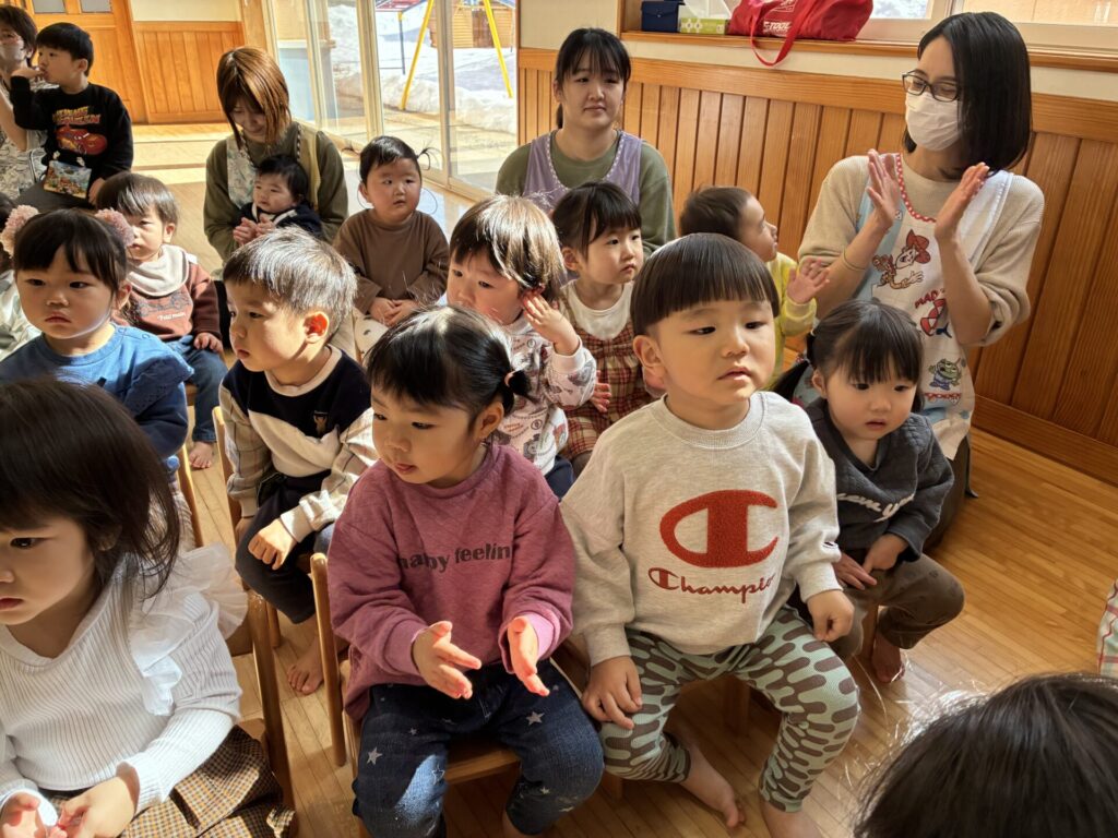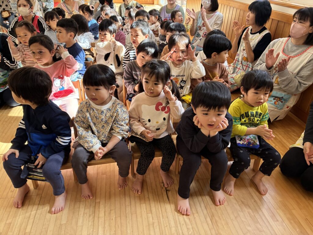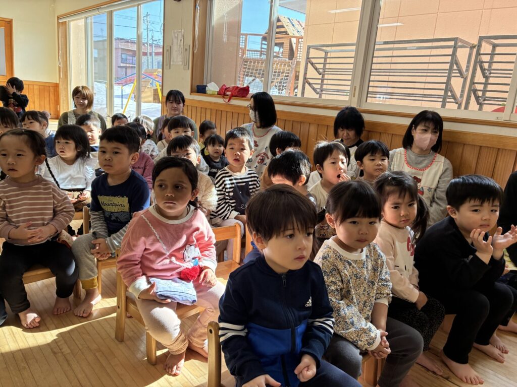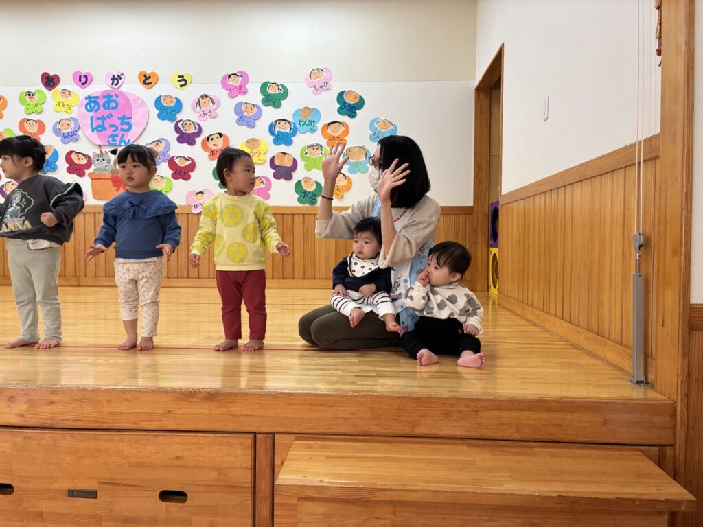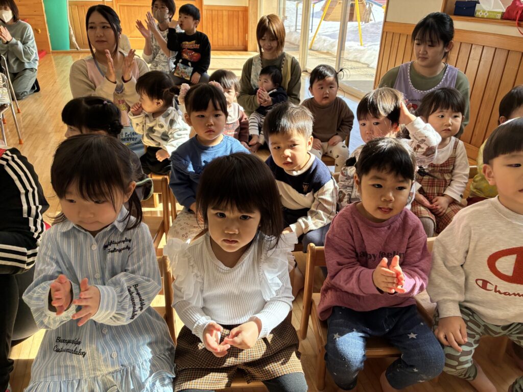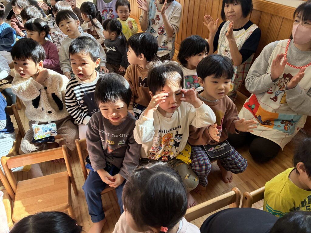 青バッチさんの楽器演奏も真剣に集中して聞いていた未満児さんの子どもたちです🎵