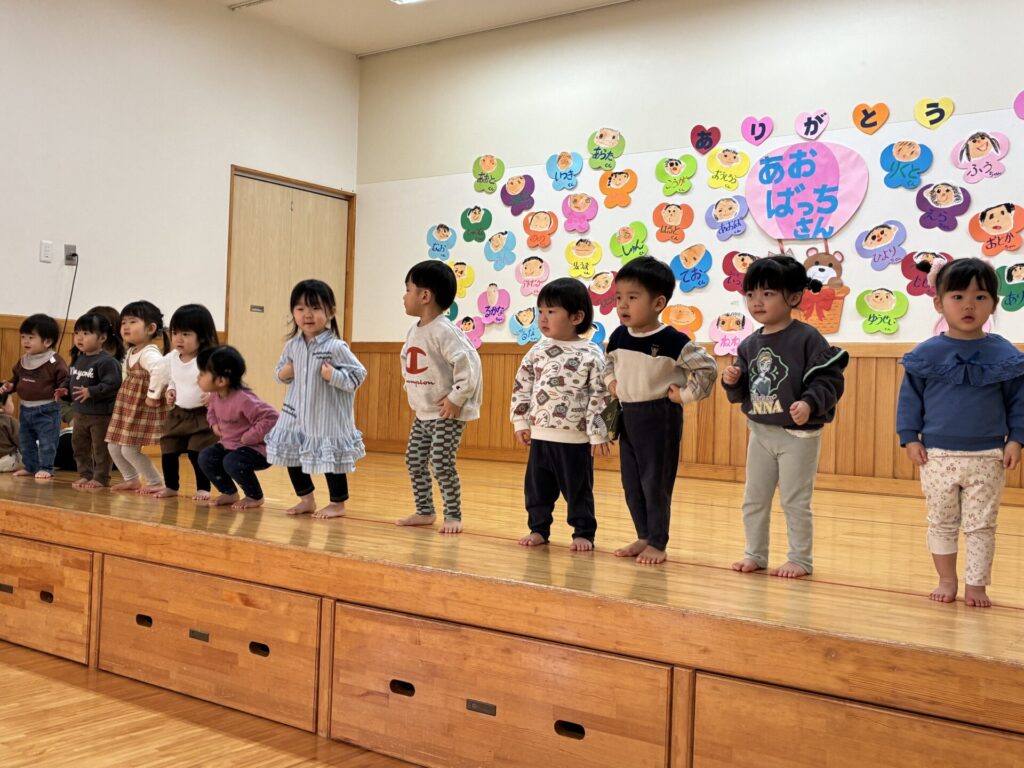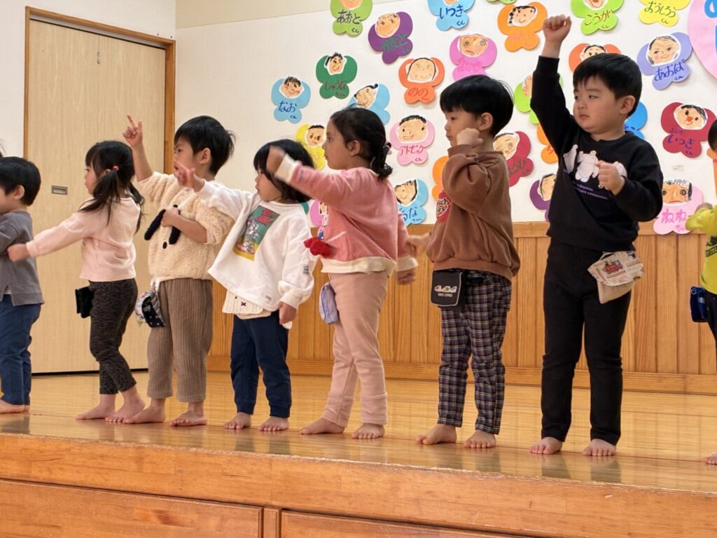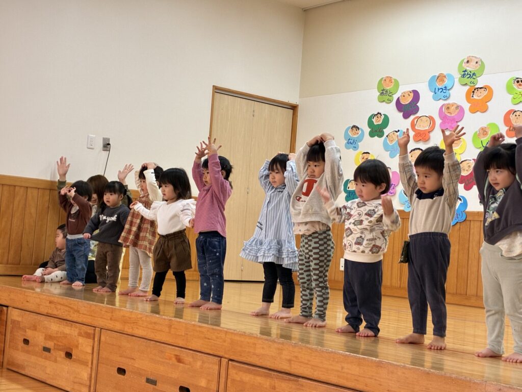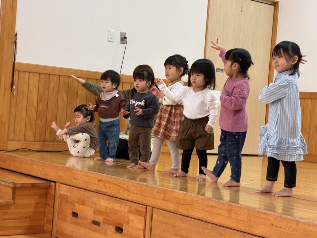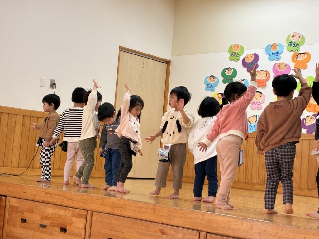 楽器演奏のお礼に未満児さんはダンスのプレゼントをしました。ひよこ・クリームちゃんは「はちゃめちゃわちゃライフ」チョコさんは「CarryingHappiness」を踊りました🤗照れながらもみんな上手に踊っていましたよ‼️
