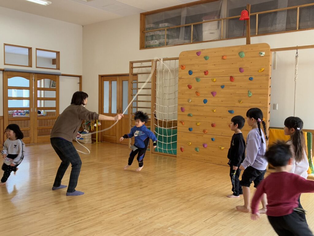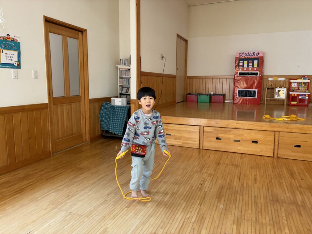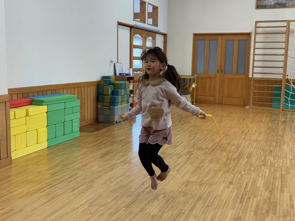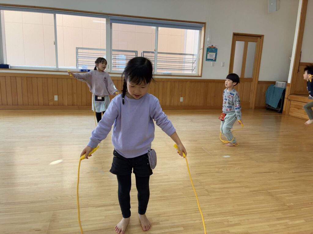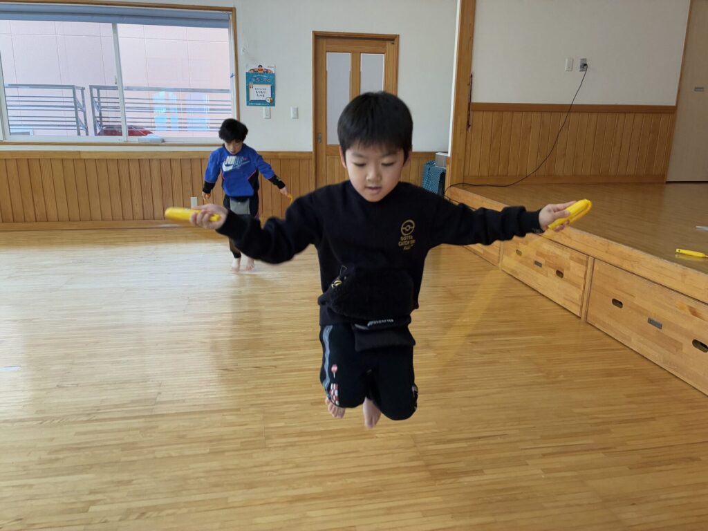 その後は、縄跳びと大縄跳びをしました。運動会で自信が付いた子ども達は、張り切って取り組んでくれましたよ!特に大繩では音楽に合わせてリズムよく跳び、「最高~~!楽しい!!」と、汗をかいて楽しんでくれていましたよ!縄跳びでは、後ろ跳びや、バッテン跳びなど新たな技にも挑戦しました!