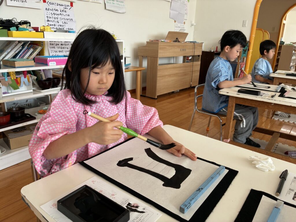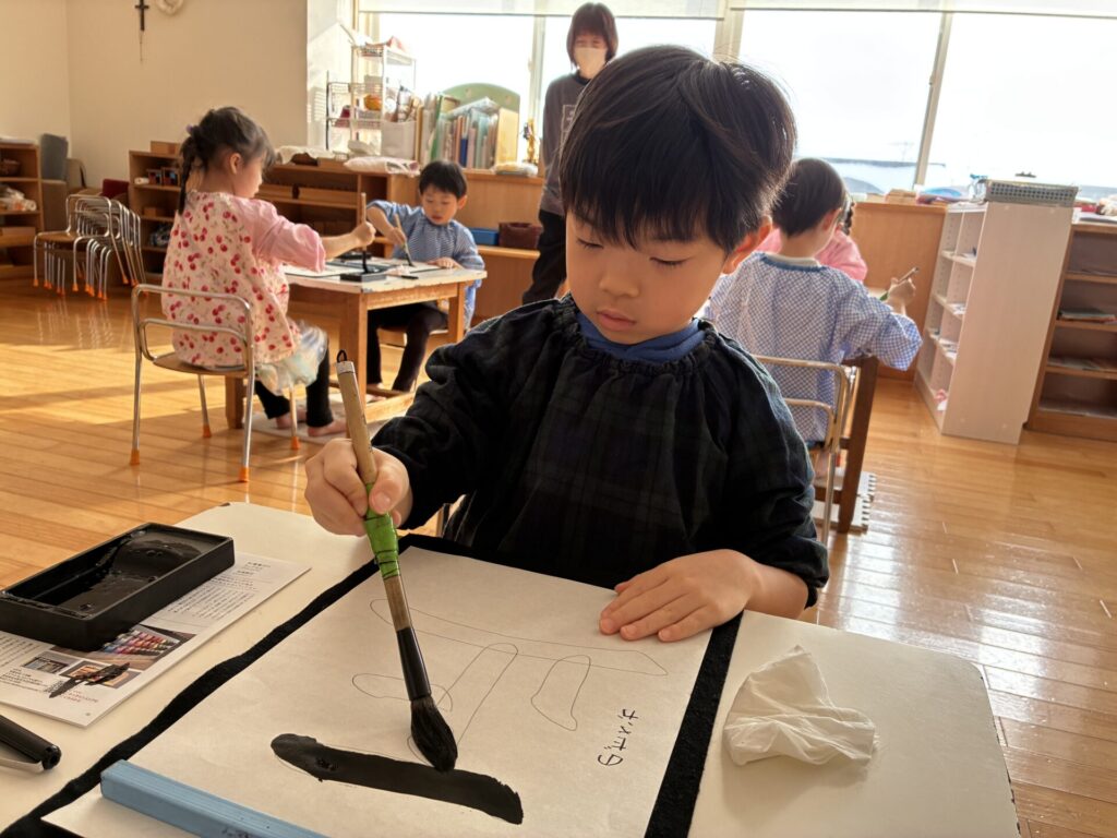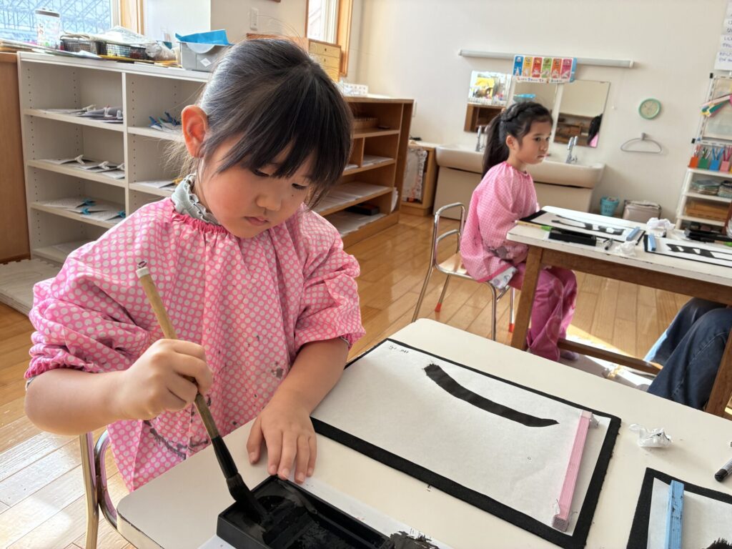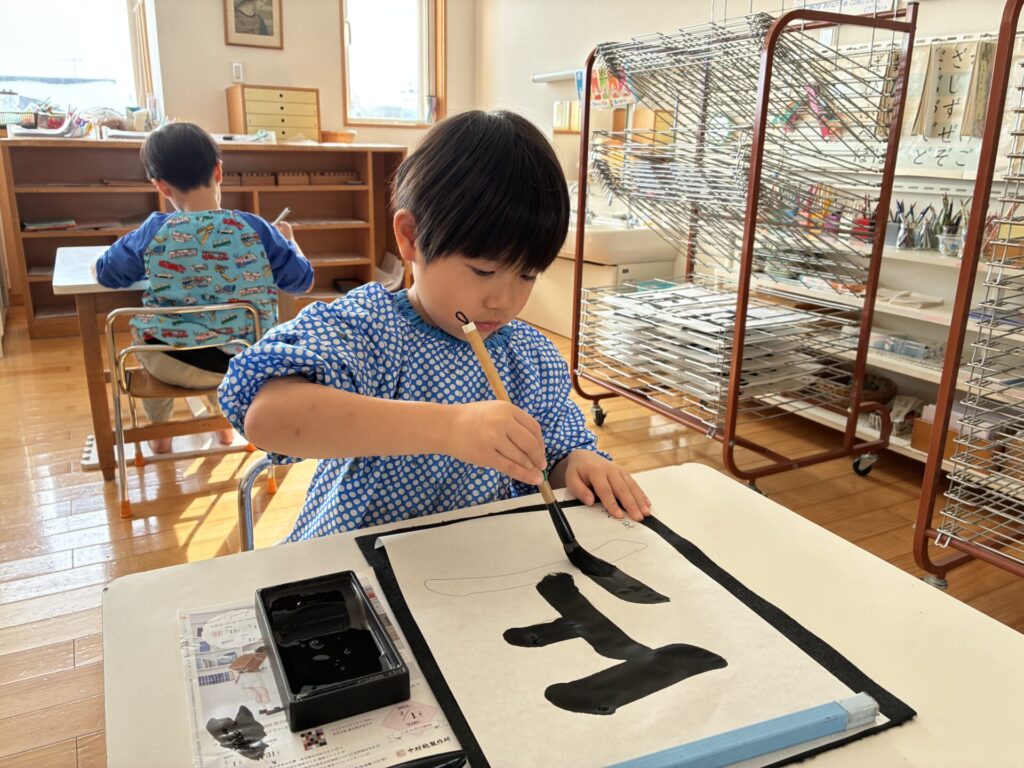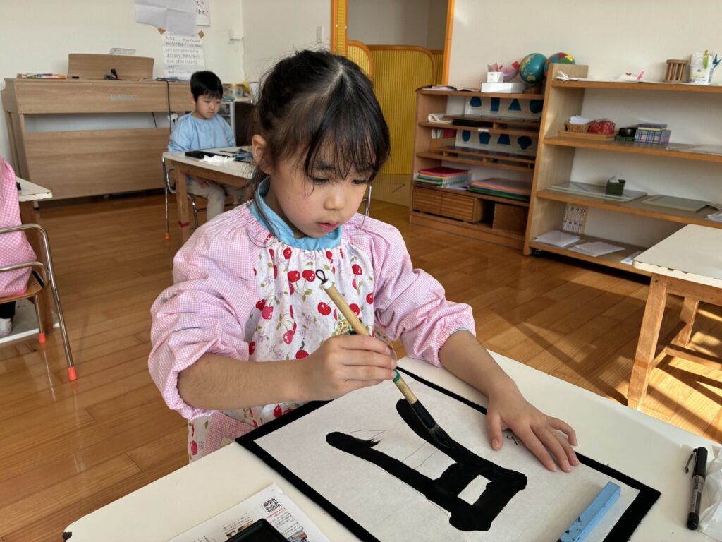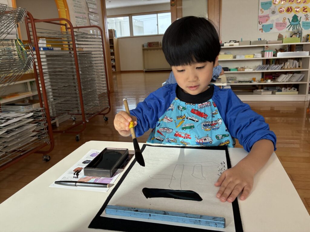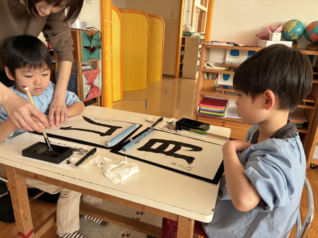 習字では、「正月」を書きました。物の準備もスムーズになり、かっこいい年長さん。
