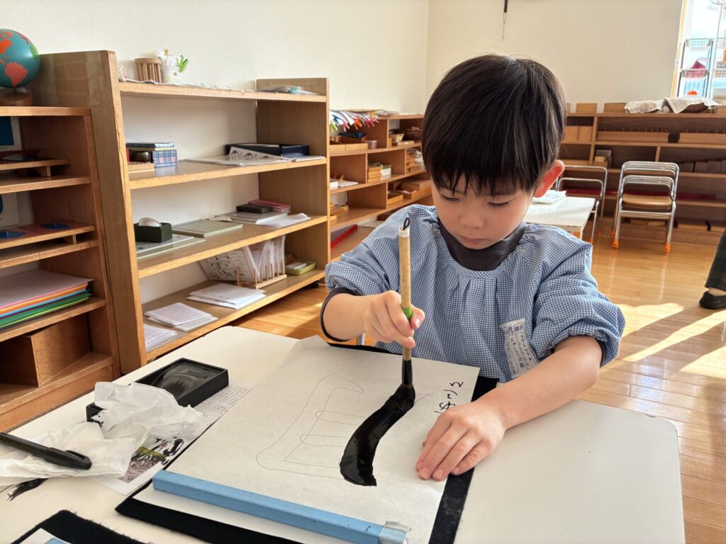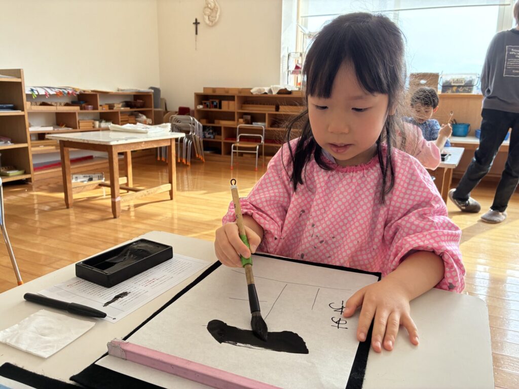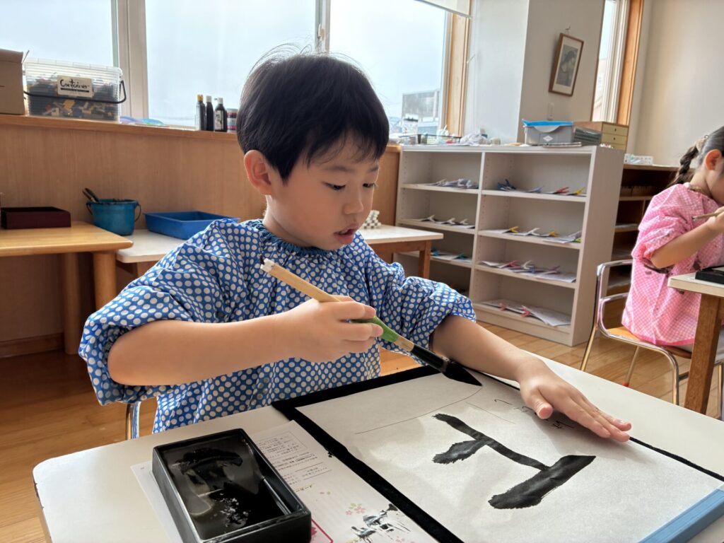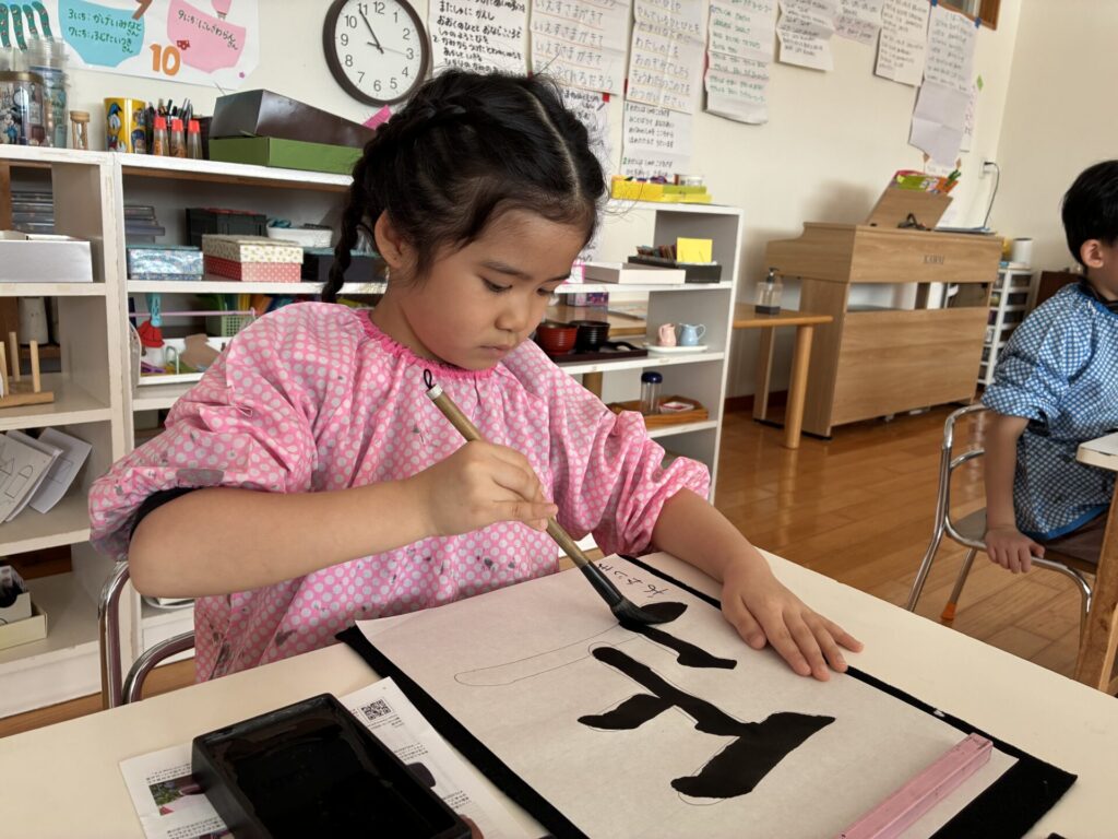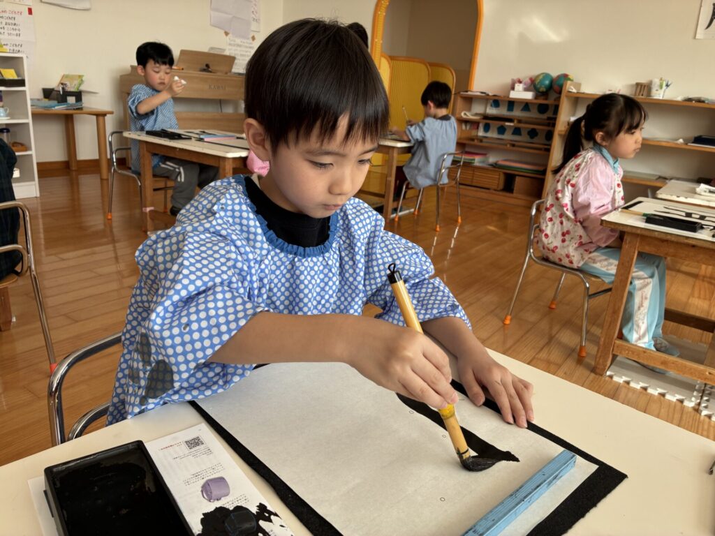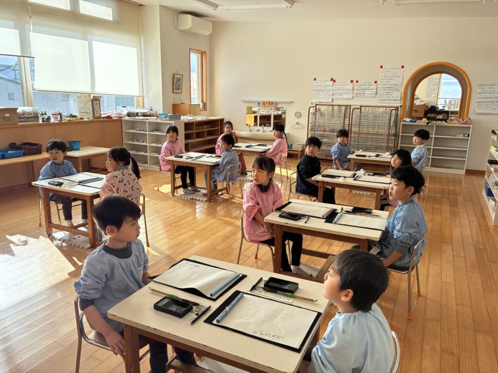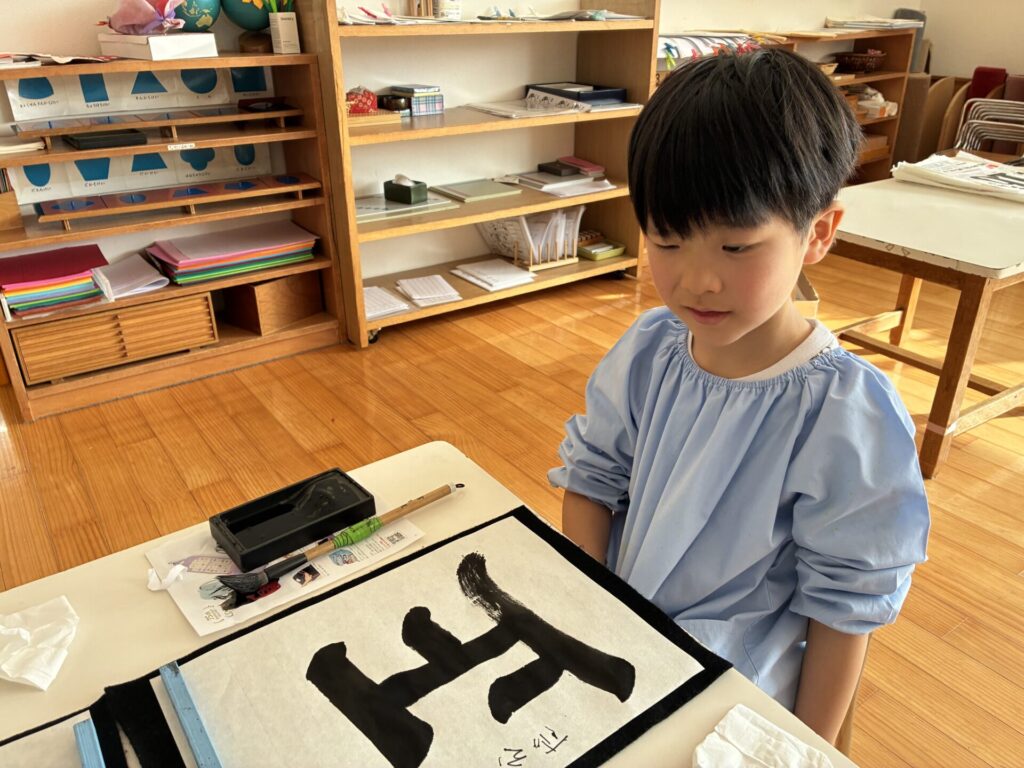 習字では、「正月」を書きました。物の準備もスムーズになり、かっこいい年長さん。