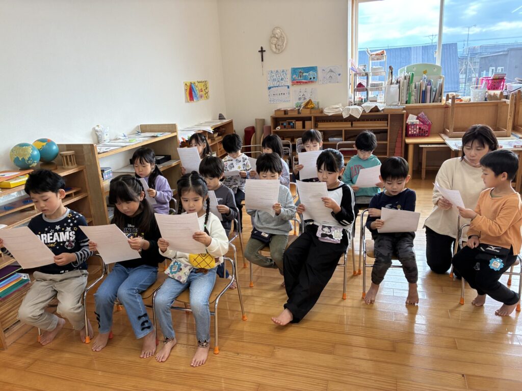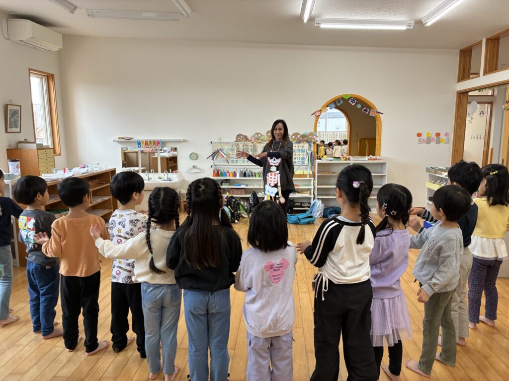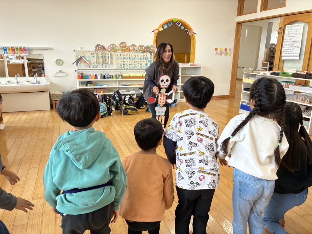 今日は、ペコちゃんに会った後、マリ先生と英語をしました。来週のハロウィンに向けて歌ったり、クリスマスの英語の歌の練習もしましたよ!!